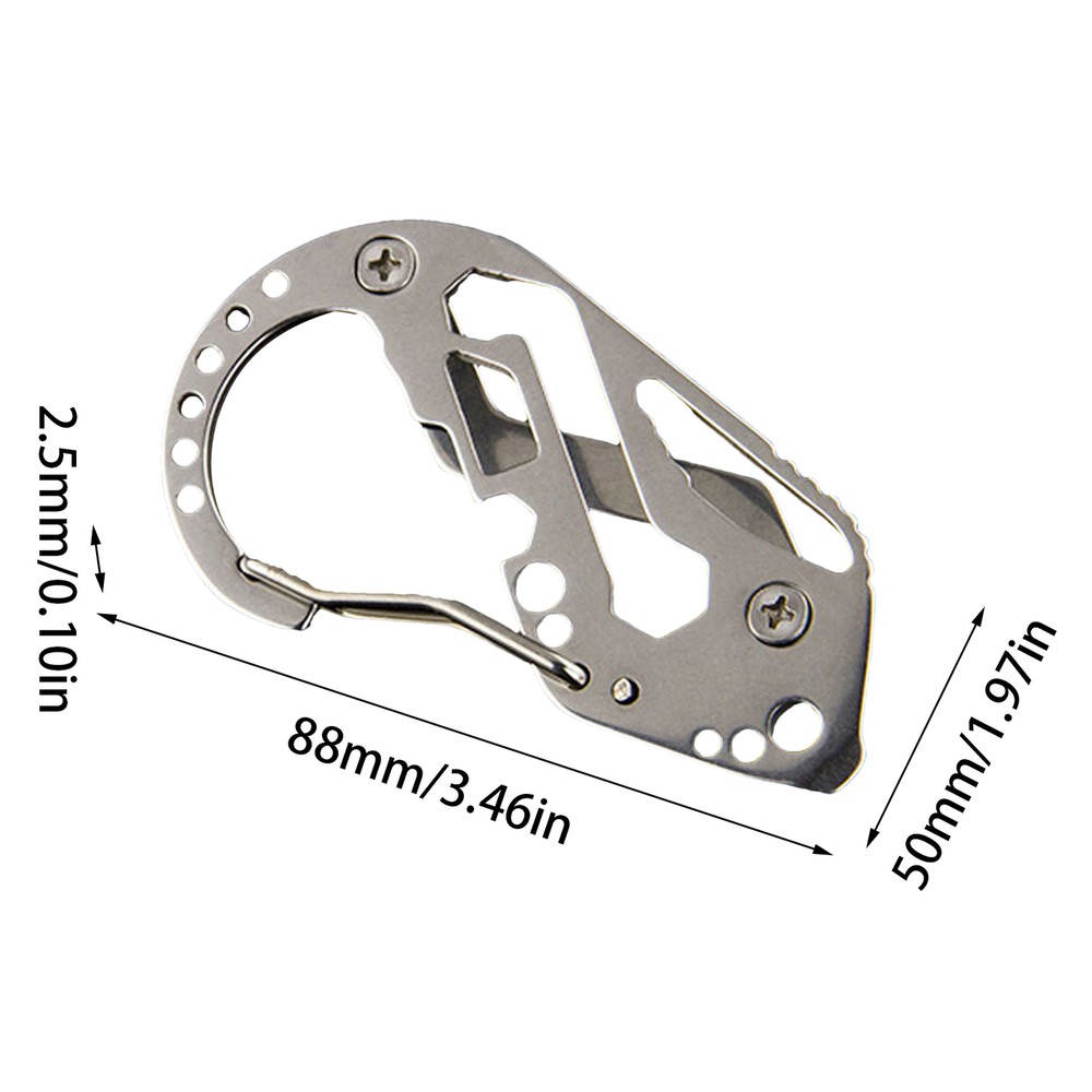 Bullet Points: Multiple Functions: Integrates a variety of practical tools like bottle openers and serrating cutters, alongside screwdrivers and wrenches, making it indispensable for outdoor activities and daily life as a portable keychain Brilliant Design: Experience the unique, multi-eye carabiner design ensuring safety and convenience, featuring a rope fixing point, seamlessly used as a buckle High-Hardness and Wear Resistant: Built with excellent quality and high-hardness 304 stainless steel, this Multi Tool Carabiner provides dependable and long-lasting performance, making it the perfect gear for harsh environments Carried Conveniently: Without taking up space, this multi tool carabiner is small enough to fit in your pocket, offering easy portability and a convenient outdoors must-have. Whether you need it for everyday use or outdoor adventures, take it with you anywhere Effortless Retrieval: Maximise your space and store all your necessary small tools and keys in 1 place, reducing clutter and streamlining efficiency in finding and using your must-haves Our Carabiner Tool is the ideal accessory! It comes with bottle openers, serrating cutters, and can be used as a buckle. Experience good performance with this lightweight and sturdy tool. Put it in your pocket for convenient and easy access to all its features. Specification: Name: Multi Tool Carabiner Material: Stainless steel Product Size: about 88 x 50 x 2.5mm/3.46 x 1.97 x 0.10in Scope of Application: Outdoor, camping, gift box Packing List: 1* Multi Tool Carabiner Notes: 1. Due to the different monitor and light effects, the actual color of the item might be slightly different from the color which is showed in the pictures. 2. Please forgive a slight measuring deviation due to manual measurement.