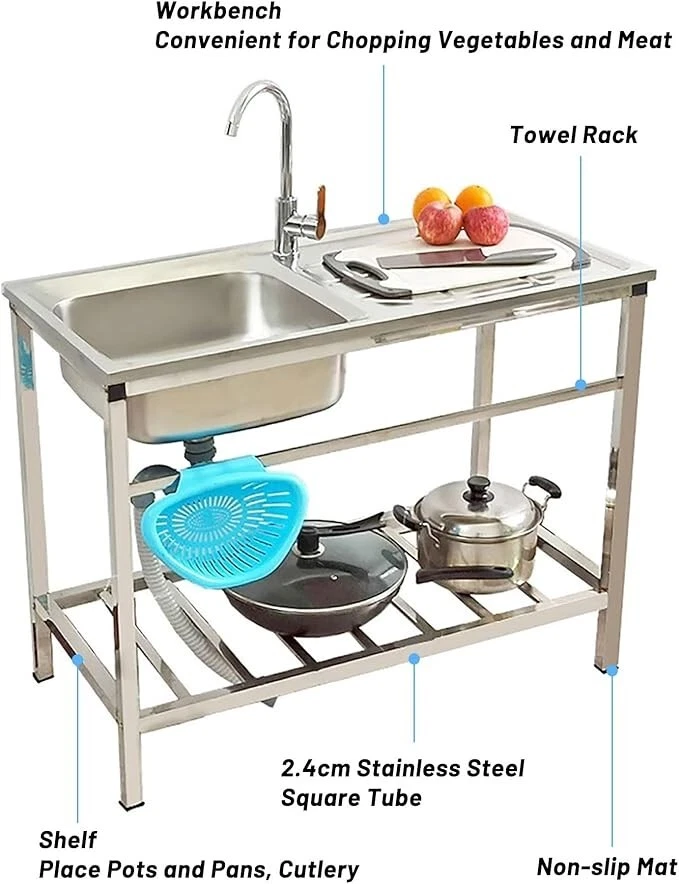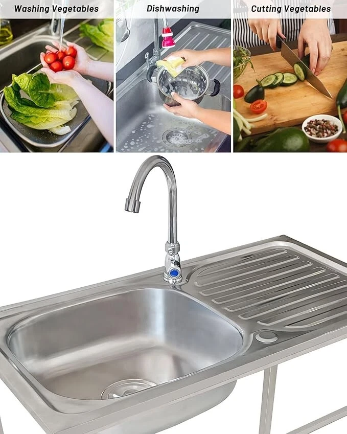 Package Included: Single Cold Faucet x 1, Downpipe x 1, Inlet Pipe x 1, Drainer x 1, Angle Valve x 1, Gloves x 1 Pair, Installation Accessories. Freestanding Stainless Steel Sink: Wear-resistant stainless steel material, scratch-resistant, not easy to rust or deform, suitable for dealing with a variety of kitchen tasks in daily useSmooth surface, easy to clean. Thoughtful Design: The utility sink comes with a worktop and bottom storage shelf, the worktop provides extra space for preparing food or drying dishes, while the bottom storage table provides storage space to keep your kitchen neat and organized. Stable Structure: when installing a sink, consider the flatness of the floor and the sturdiness of the mounting points. Often choose to fix it against a wall to increase overall stability. Rubber feet will not damage the floor. Wide Application: Utility washing hand sink is suitable for various scenarios such as home, restaurant, hotel, cafe and so on. Besides being placed in indoor and outdoor kitchens at home and so on, it can also be used in the backyard, garage, garden and so on, providing convenience for your life.
