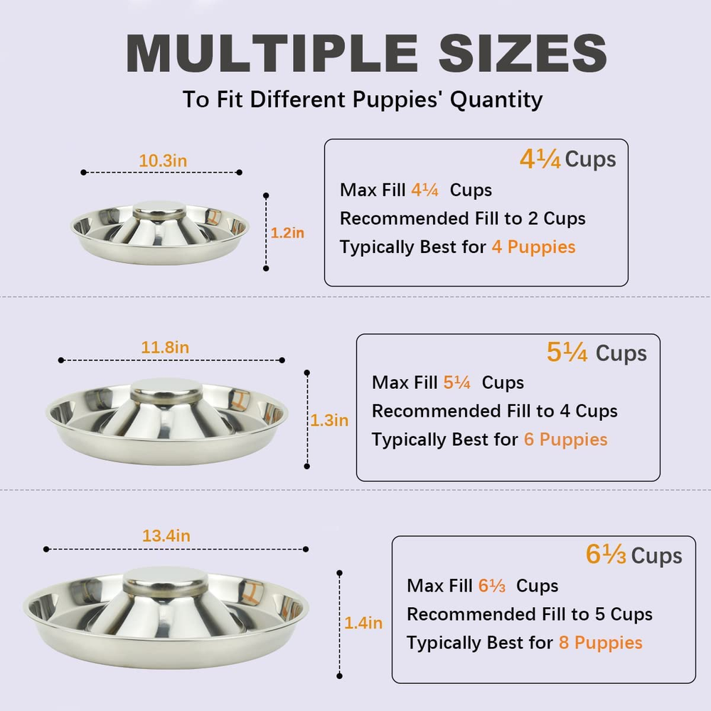 Menu Other Items Feedbacks About Us Contact Us Add To Favorites Stainless Steel Puppy Feeding Bowls 1or2 Pack, Food & Water Weaning Bowls Feeder Material Matters: A bowl is just a bowl, right? Sadly, that's not the case. Most pet food bowls are made from stainless steel, plastic, or ceramic. Plastic is the worst option, which contain chemicals that could disrupt your puppies. Apart from that, plastic accumulates deep scratches that harbor insanitary things and can be hard to clean. Ceramic is heavier and far less durable. One drop or bang can chip, crack, or shatter your ceramic bowl, making it no longer safe for use. Considerate & Convenient Design: This puppy weaning dish is perfect for young puppies to share their food or water. With a sturdy stainless steel constructio,n the bowl is sturdy and dishwasher safe. The raised center helps to ensure puppies do not walk or sit on the bo,wl and the low rim makes feeding time much easier and helps keep puppies cleaner. Easy to Clean & Dishwasher Safe: Dog bowls made out of stainless steel can easily be cleaned with mild dish soap and warm water. In addition, they are also dishwasher safe, making for easy cleanup. Stackable Design for Easy Storage or Travel: With a considerate and convenient design, these puppy weaning bowls stack easily inside one another for easy storage or travel. Durable for long-time use and healthy for your beloved four-paw companions Steps & Tips for Weaning Puppies: Step 1: Make a Gruel - Mix dog replacement milk into their dry puppy chow; Step 2: Offer the Gruel to the Puppies; Step 3: Reunite the Puppies With Their Mother; Step 4: Gradually Increase the Amount of Solid Food. The recommended time for weaning puppies is from around 3-4 weeks of age and can last until the pups are around 7-8 weeks. Product description Weaning Puppies What is this? Weaning describes the transition of the puppy's diet from its mother's milk to the solid growth diet of puppyhood.d Tips: For the first few weeks of their lives, newborn puppies depend on their mother’s milk for nourishment and survival. Not only does it provide the essential nutrients for growth anddevelopment , but it also helps protect young pups' health. When do I do it? Giant breeds, 3.5 weeks Large breeds, by 4 weeks Small breeds, depending on size, but most at 5 to 6 weeks Tips: To start weaning, you will remove the mother from the puppies for an hour, 2 to 3 times a day, to try eating solid food How to Wean Puppies? Step 1: Make a Gruel Make a gruel of canned or dry puppy food mixed with puppy milk replacer or water. Look for a well-known, name-brand puppy food that is not grain-free. Ideally,y use the same brand of food that the mother dog ea.ts Step 2: Offer the Gruel to the Puppies During the long periods where you separate the puppies from their mother, offer them the gruel in our puppy feeding bowl. Place the puppies in front of it. If the puppies do not seem interested, try dipping your finger in it and then touching their mouths so they can taste it. They may get messy in the process of exploring this new foo.d Step 3: Gradually Increase the Amount of Solid Food When you’re beginning the weaning process, the puppies’ diet should consist of only 10% solid food. The gruel should be transitioned to less liquid and more solid until the puppies can eat the canned or dry food without diluting it. Then, you should gradually increase the amount each week until their diet is 100% solid food by the time they reach 7 or 8 weeks of age Item Specification Item model number VES222 Age Range Description Puppy Style Durable Material Stainless Steel Item Dimensions LxWxH 11.81 x 11.81 x 1.18 inches Color 2 - Pack Product Dimensions 11.81 x 11.81 x 1.18 inches; 1.5 Pounds Care Instructions Dishwasher Safe Item Weight 1.5 Pounds Target Species Dog Target Audience Keyword Dogs Recommended Uses For Product Multiple Pets Size Medium - 5¼ Cup Special Feature Durable Item Package Dimensions L x W x H 12.6 x 11.89 x 3.31 inches Breed Recommendation puppy Dimensions Shipping Returns Additional Info Product Dimensions: 11.81 inches x 11.81 inches x 1.18 inches. Weight: 1.5 lb