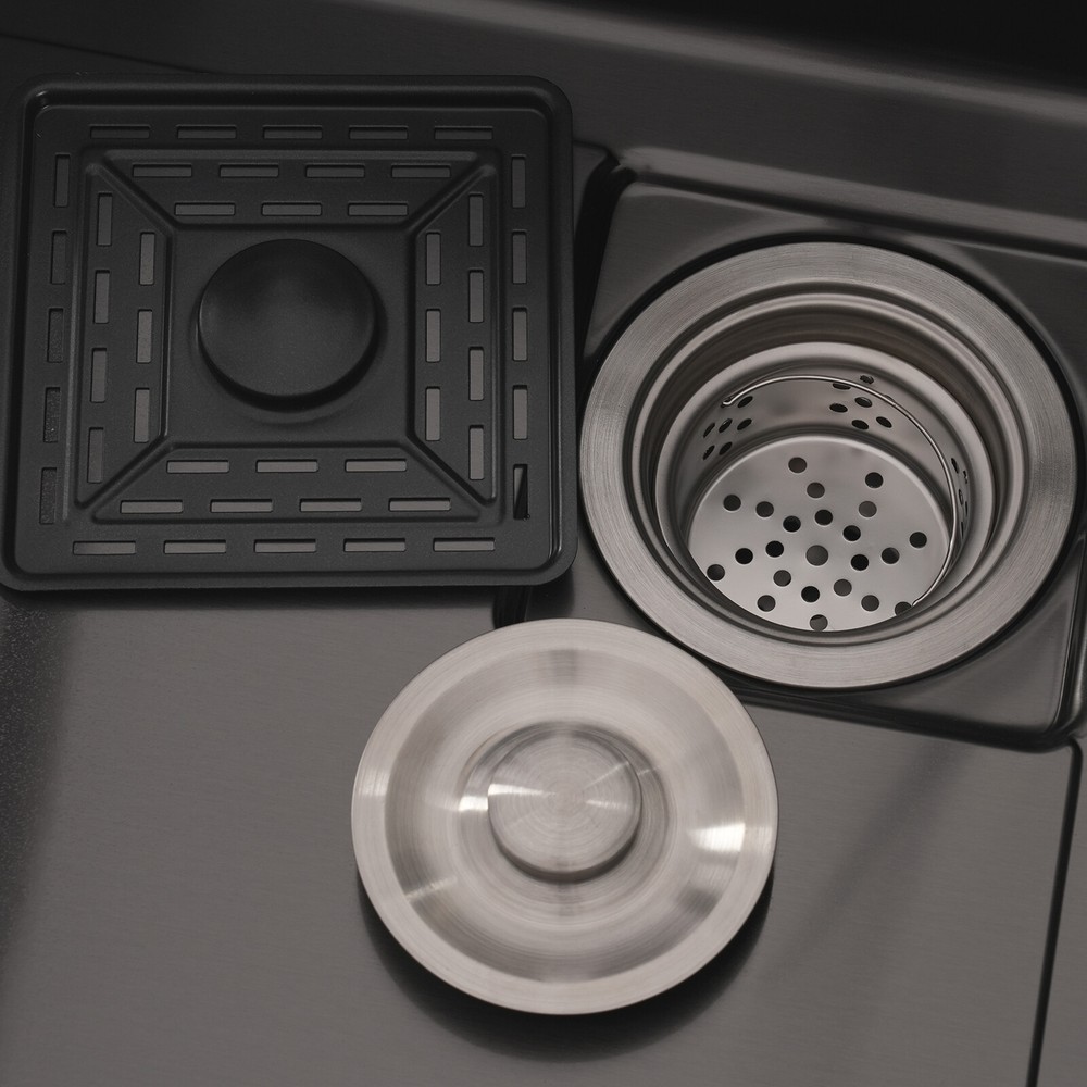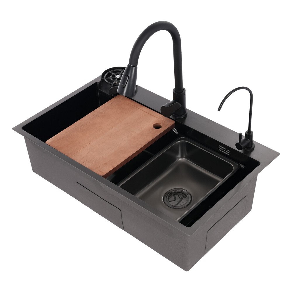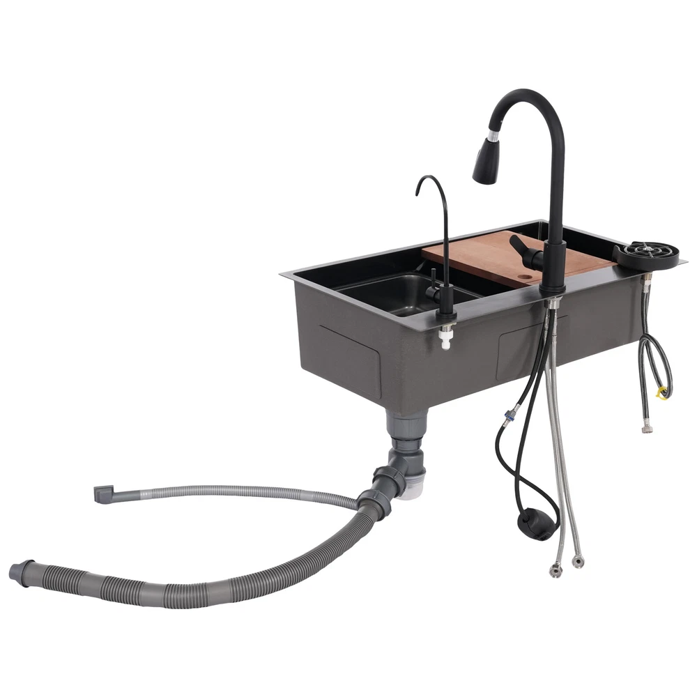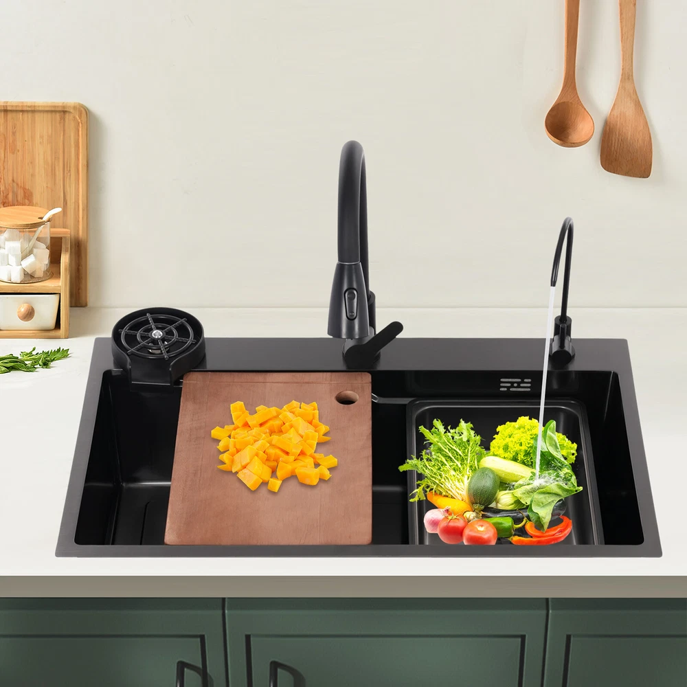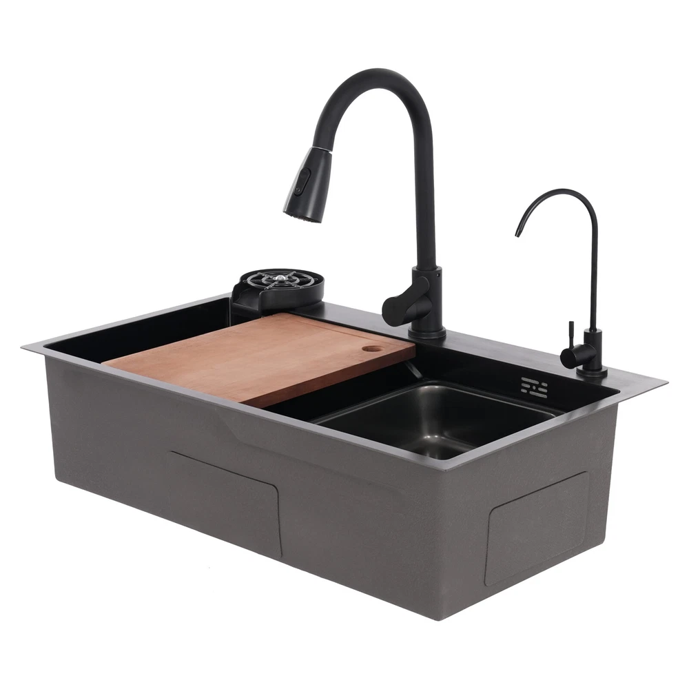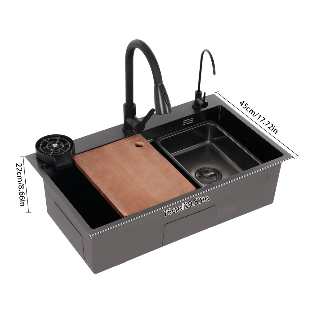 Rectangular Kitchen Sink Stainless Steel Multifunction Sink w/ Pull-out Faucet Description Revitalize the kitchen, starting from the sink! Our multi-functional sink integrates the pull-out faucet, cup rinser, water purified faucet, and more to help you improve your quality of kitchen life. 304 stainless steel has been treated with exquisite craftsmanship for excellent durability and modern appearance. Choose it and embark on a new chapter of convenient and efficient kitchen work! Key Features Build to Last: It is mainly made of 304 stainless steel after nano-coating, which is corrosion-resistant, scratch-resistant, and easy to clean, ensuring good appearance and performance even after long-term use. Efficient Kitchen: Pull-out faucet, water purified faucet, cup rinser, basin in basin, cutting board, and efficient drainer allow kitchen work to be centralized in one place, changing the frequent change of position work mode and making your kitchen work more efficient. Large Size: Spacious sink space is suitable for cleaning a large number of dishes(not included). It is a great helper for your cleaning or washing work. Quick Drainage: The U-shaped guide line and micro slope structure inside the sink can help with fast drainage. The gourd-shaped drainer can effectively intercept larger debris, prevent blockages, and form a water seal layer to prevent odors from rising, ensuring a fresh kitchen environment. Customized Use: The protruding frame design on the sink's interior wall holds the basin in basin and the cutting board stably to meet your usage needs. The pull-out faucet has three water output modes: water column, spraying, and sweeping, allowing you to enjoy a customized washing experience. Thoughtful Design: The product adopts silent pads and anti-condensation layers to reduce noise, prevent cabinet moisture, and create a quieter and more hygienic kitchen environment. Easy to Clean: The product has been treated with nano-coating, making it less likely to leave marks or stains. You can use a mild cleaner and soft sponge to wipe the sink to ensure its lifecycle. Buy with Confidence: We stand behind all our guests and look forward to assisting you with your purchase. It is our pleasure to answer your confusion and questions. The end of the story between us is not "we sell and you buy". Details Anti-overflow Holes: They can prevent the sink from overflowing and keep the kitchen floor dry. Water Storage Lid: It allows you to quickly store water and complete tasks such as soaking. Application This product can be widely used in homes, kitchens, restaurants, cafes, bars, hotels, homestays, milk tea shops, dessert shops, and other places. Specification Color: Black Style: Modern Shape: Rectangular Material: 304 Stainless Steel Cutting Board Material: Solid Wood Process: Nano Coating Mounting Type: Drop-In/Topmount/Undermount Assembly Required: Yes Valve Core Type: Ceramic Faucet Water Output Mode: Water Column, Spraying, Sweeping Faucet Pull-out Length: 30cm/11.81in Sink Size: 75*45*22cm/29.53*17.72*8.66in Package Size: 81*51*28cm/31.89*20.08*11.02in Gross Weight: 12kg/26.46lbs Net Weight: 11kg/24.25lbs Package Included 1 * Sink 1 * Pull-out Faucet 1 * Water Purified Faucet 1 * Cutting Board 1 * Drainer 1 * Basin in Basin 3 * Inlet Pipes Other Accessories for Assembly Notes Please carefully check the size of the product before purchasing. Please note that this product does not include the water pipe for the water purified faucet. You will need to bring your water pipe to connect it to your water purifier. Please allow the slight color difference caused by the shooting light and 1-3cm error due to manual measurement, and make sure you do not mind before ordering. Payment Delivery details Terms of sales About us Contact us Payment We accept ebay payment 。 Fees such as import duties, taxes are not included in the item price or shipping costs. These charges are the buyer's responsibility. Delivery details Shipping: 2-9 working days to: USA Terms of sales We maintain high standards of excellence and strive for hundred percent customer satisfaction. Feedback is very important to us. We hope that you contact us immediately before you give neutral or negative feedback, so that we can address your concerns. It is impossible to address issues if we do not know about them! About us Your satis faction is our ultimate goal. We work hard to earn your trust and future business. Our certified technicians have tested each item before shipping. The unit comes with 1 year limited warranty on all manufacturing defects. a) If you receive a defective item, you may return it or ask for a discount. Please contact us within 14 days after you receive the package. b) What you returned must be intact and in its original packaging as re? u. Customer is responsible for shipping costs of the returned item. c) We will cover the cost of shipping back t with the shipping rate indicated in the registration page. We will send you a new unit or refund the full payment you paid. Thank you. Contact us Business Hour Business Hour: Monday To Friday: 8:30 AM to 5:00 PM (Beijing China time) Due to time zones, our reply to your questions may not be immediately. But within above working time, we will reply your email within 24 hours. If it's non-workdays, please kindly be patient and wait till Monday. Please contact us with ebay message. Please feel free to contact us if you have any questions. Monday To Friday: 8:30 AM to 5:00 PM (Beijing China time) Due to time zones, our reply to your questions may not be immediately. But within above working time, we will reply your email within 24 hours. If it's non-workdays, please kindly be patient and wait till Monday. Please contact us with ebay message. Please feel free to contact us if you have any questions.