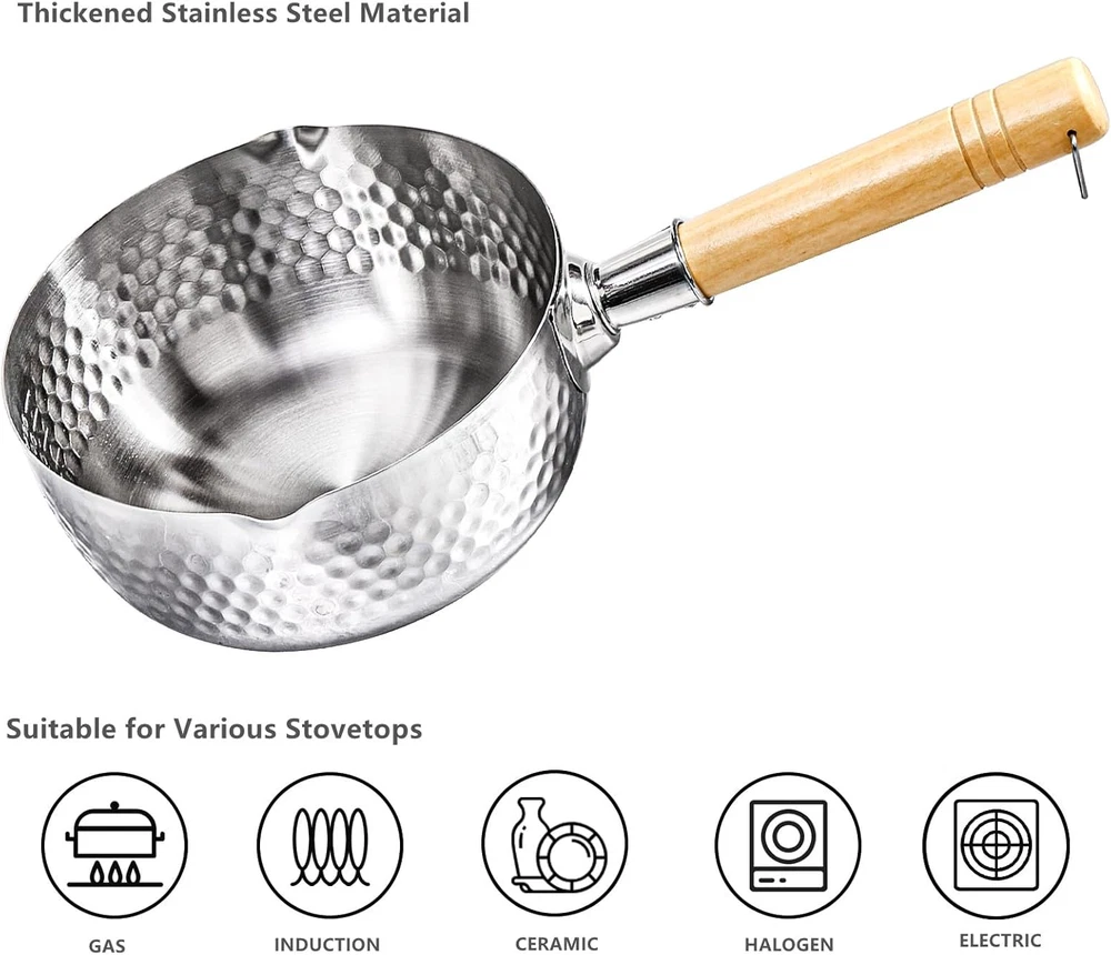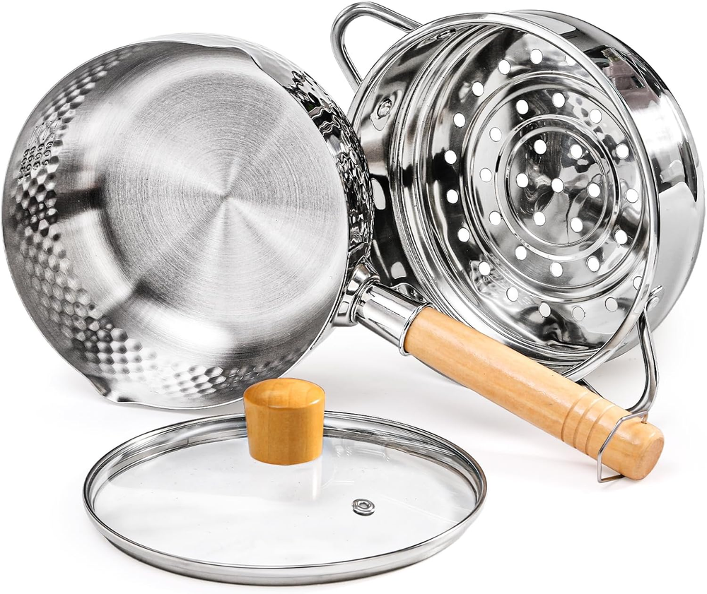 Stainless Steel Saucepan with Steamer 1.2 Quart Yukihira Sauce Pan with Lid Wood The removable steamer basket of this yukihira pan is made of 304 stainless steel. And the pot features thickened 430 stainless steel with no coatings. Comes with a high-quality glass lid and heat-proof beech wood handle with tail hook, can be hung and stored when not in use, comfortable to grip and space-saving DEAYOU stainless steel sauce pan measures approx. 7" top diameter x 3.15" height (without the lid), the steamer is 7.48" top diameter x 2.36" height. With the maximum capacity of 1.2 quarts, which is available for 1-2 person to use. 2-in-1 design convenient for you to cook soup and steam vegetables at the same time The yukihira saucepan has 2 pour spouts for straining vegetables,noodles, pasta etc., making it easy to use with both left and right hands. The heat-resistant glass lid allows you monitor the cooking process, making small steamer cooking easy to control. The wooden handle provide excellent heat insulation during cooking. The hammered markings and dimpled can effectively prevent food overflow This small steamer pot can work well on all types of stovetops, such as gas stoves, induction stoves, electric stoves. The pot is suitable for ramen, tempura, milk, sauces, syrup, etc. And the steamer is perfect for steaming tamales, veggie, broccoli, couscous, dumplings, fish, crab legs, lobster, oyster, clam and other seafood and vegetables The small stainless steel pot is compact and lightweight, can be operated with one hand. It has a millilitre scale inside to help you control the amount you cook. The versatile saucepan can be used for multiple purposes, idea for steaming, boiling, frying, stewing, to meet your various cooking requirements Product Description DEAYOU Stainless Steel Saucepan with Steamer, 1.2 Quart Yukihira Sauce Pan with Lid Traditional Japanese Small Cooking Pot with Wood Handle and Two Side Spouts for Milk, Ramen, Soup, Tempura, 7" The versatile saucepan can be used for multiple purposes, idea for steaming, boiling, frying, stewing, to meet your various cooking requirements Thickened Stainless Steel Saucepan This small steamer pot can work well on all types of stovetops, such as gas stoves, induction stoves, electric stoves. High Quanlity Stainless Steel Material The removable steamer basket of this yukihira pan is made of 304 stainless steel. And the pot features thickened 430 stainless steel with no coatings. Comes with a high-quality glass lid and heat-proof beech wood handle with tail hook 2 Side Pouring Spout The yukihira saucepan has 2 pour spouts for straining vegetables,noodles, pasta etc., making it easy to use with both left and right hands Multiple Purposes The versatile saucepan with a thicker bottom can be used for multiple purposes, idea for steaming, boiling, frying, stewing, to meet your various cooking requirements Product Dimensions 7"D x 7"W x 3.15"H Capacity 1200 Milliliters Color Silver Material Stainless Steel Country of Origin China Item Weight 2.08 ounces Is Oven Safe No Finish Type Uncoated Is Suitable For Stovetop Yes Coating Description Uncoated Size Small Complimentary Shipping and Easy Returns Need to return something? Enjoy our 30-day hassle-free return policy! Take advantage of free shipping across all 48 contiguous states! Your order will be dispatched within 1-2 business days once payment is confirmed. Your Opinion Matters! Your happiness is our main goal! We welcome your feedback! If you encounter any problems, reach out to us right away, and we’ll be here to help. Explore the Extraordinary! Our collection showcases fascinating products that are sure to capture your attention. What surprises await you? Delve in and discover unique items that enrich your daily life. Don't miss the amazing things we have in store for you!