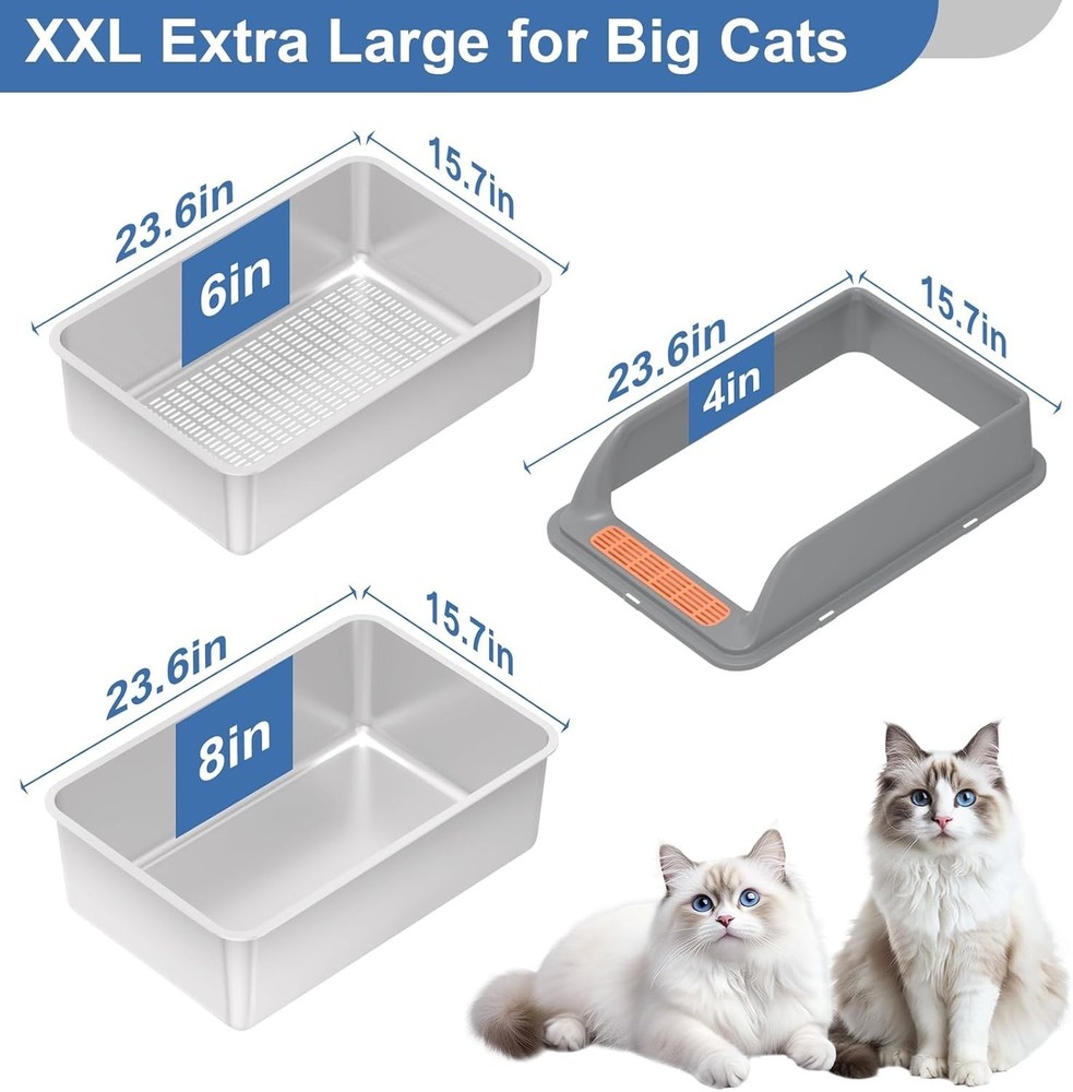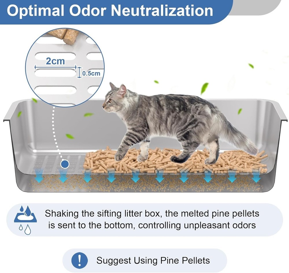 【Stainless steel sifting litter box】Unlike plastic litter boxes, this stainless steel litter box is durable, rust-proof, odor-resistant, non-stick and easy to clean. The sifting litter pan system quickly sift sawdust for efficient control of odors 【High Sided Pellet Litter Box with Lid】The high sides prevent litter overflow and urine leakage, keeping floors clean—ideal for high pee cats. The reinforced lid features 6 secure buckles, preventing being knocked over by cats and urine leaking through seams 【Simple to Operate】The metal sifting litter box is designed for pine pellet cat litter, with a sieve hole of 2 x 0.5cm. Shake the box, and the sawdust formed by urine-absorbed pellets will fall to the bottom pan. Once full, simply replace the litter bag 【XXL Sifting Litter Box】The bottom pan measures 23.6" L x 15.7" W x 8" H, with a sifting pan of 23.6" L x 15.7" W x 6" H, and the 4" high-sided lid ensures privacy for your cat(Note: M size is suitable for kittens only) 【Included Accessories】This set includes an roll of litter bags, a durable metal scoop, a mat, and an instruction manual. These accessories are designed to make daily maintenance of the litter box quicker, easier, and more efficient