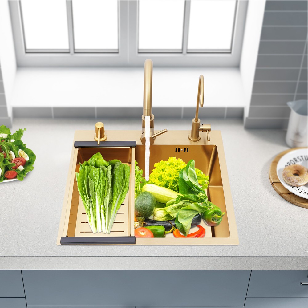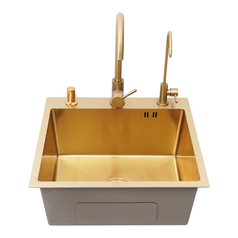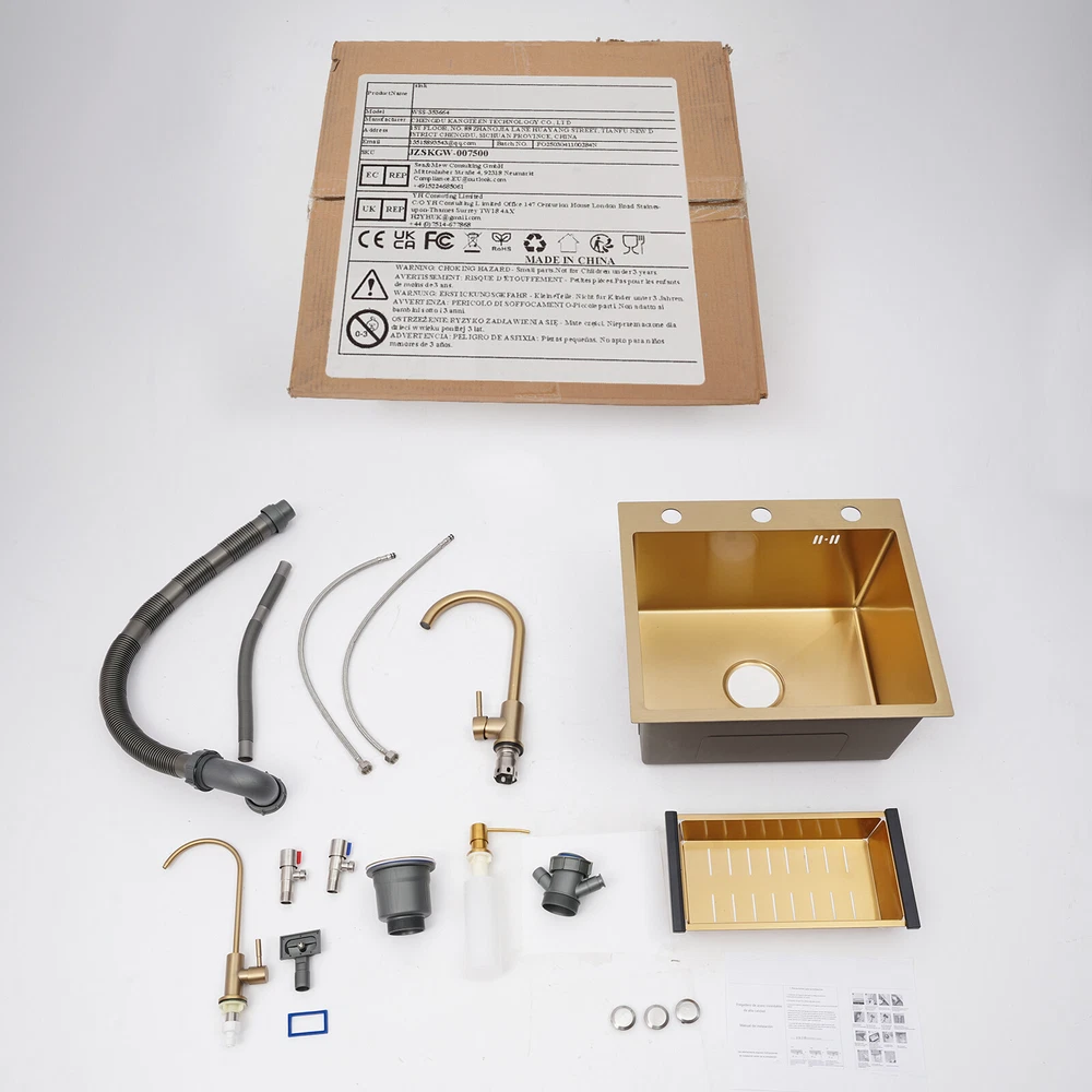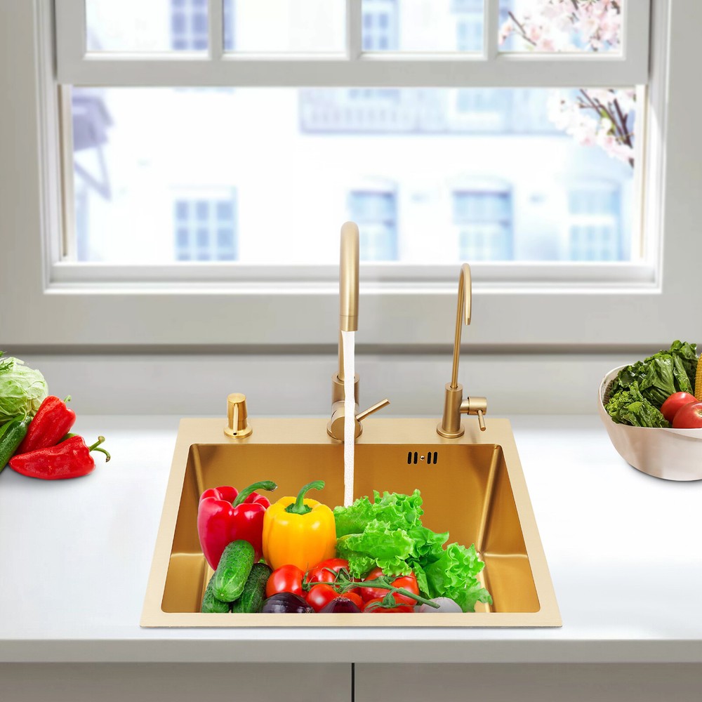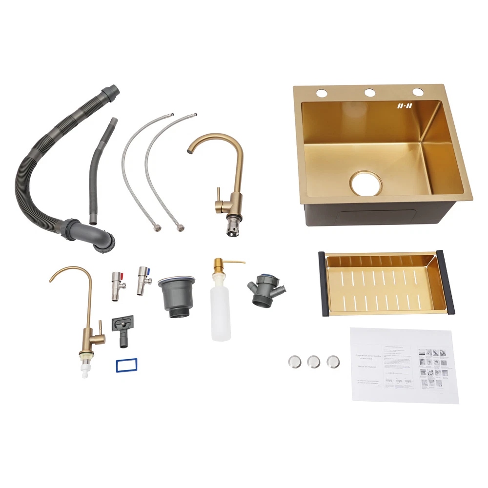 Specifications Color: Gold Style: Light Luxury Shape: Rectangular Material: Stainless Steel Process: Brushing, Polishing, Nano-coating Installation Type: Countertop, Drop-in Thickness: 3mm/0.12in Soap Dispenser Capacity: 150ml/5.07oz Assembly Required: Yes Sink Size: 50*45*20cm/19.69*17.72*7.87in Package Size: 55*50*26cm/21.65*19.69*10.24in Gross Weight: 5.9kg/13 lbs Net Weight: 5.61kg/12.37 lbs Package Included 1* Kitchen Sink 2* Faucets 1* Draining Basket 1* Soap Dispenser 1* Spanish & English & Chinese Manual Other Accessories for Assembly Drop in Gold Kitchen Sink Stainless Steel Sink Single Bowl Kitchen Sink 50x45 Description This kitchen sink is made of high-class materials and has multiple processes to ensure good performance and long service life. The large capacity design allows you to wash dishes freely, effectively improving the efficiency of kitchen use. This beautiful and practical kitchen sink is the key to creating an ideal kitchen space. It will be the new start of your new life in the kitchen! Key Features Selected Material: It is mainly made of premium stainless steel, processed through brushing, polishing, and nano-coating technology, with high strength, good wear resistance , corrosion resistance , and rust resistance , ensuring long-term use. Large Capacity: The 7.87-inch sink depth and the 19.69 * 17.72-inch large size provide you with a spacious use of space, which is suitable for washing dishes, vegetables, fruits, etc., improving the efficiency of kitchen operations. High Drainage Efficiency: The X-shaped water guideline, slightly inclined bottom structure, drain basket, and large drain hole can quickly discharge accumulated water and reduce the risk of blockage. Thoughtful Design: The anti-condensation coating prevents moisture from building up at the bottom of the sink, keeping kitchen cabinets dry. An acoustic mat has been added to the bottom of the sink to minimize noise and enhance the experience of using it, providing you with a quiet and comfortable environment. User-friendly: Two domestic and purification faucets that rotate 360 degrees and a 5.07oz soap dispenser make it easy to use for your daily cleaning, and the thick draining basket allows you to quickly drain your washed dishes to reduce the growth of bacteria . Moreover, it also comes with hot and cold water pipes for your flexible use of cold and hot water. Easy to Clean: The smooth surface and the R-corner design are not easy to accumulate stains, so you only need to wipe it with a soft cloth to keep it clean. Flexible Installation: This product supports countertops and embedded installation to meet the design requirements of different kitchen countertops and improve overall aesthetics. In addition, the three-hole design allows you to adjust the installation positions of the soap dispenser, large bend faucet, and clean faucet as needed. Stylish Appearance: The premium gold color and smooth lines can be matched with most types of kitchens, making your kitchen more beautiful and practical. Customer Service: Communication is the best way to solve problems. If you have any problems, please feel free to contact us. We will reply and solve the problem for you as soon as possible. Details High Overflow Holes: The humanized high-hole design can effectively prevent water from overflowing due to forgetting to close the tap. Smooth Edges: The rounded and smooth edges not only add to the aesthetics of the product but also improve the safety of use. Application It is suitable for open kitchens, bars, center island counters, balconies, flats, small kitchens, and so on. Specifications Color: Gold Style: Light Luxury Shape: Rectangular Material: Stainless Steel Process: Brushing, Polishing, Nano-coating Installation Type: Countertop, Drop-in Thickness: 3mm/0.12in Soap Dispenser Capacity: 150ml/5.07oz Assembly Required: Yes Sink Size: 50*45*20cm/19.69*17.72*7.87in Package Size: 55*50*26cm/21.65*19.69*10.24in Gross Weight: 5.9kg/13 lbs Net Weight: 5.61kg/12.37 lbs Package Included 1* Kitchen Sink 2* Faucets 1* Draining Basket 1* Soap Dispenser 1* Spanish & English & Chinese Manual Other Accessories for Assembly Notes Please check the size carefully before ordering. Please do not scratch its surface with sharp objects to obtain a longer service life. If you want to get a better installation result, we recommend that you hire a professional plumber to install it. Please allow the slight color difference caused by the shooting light and 1-3cm error due to manual measurement, and make sure you do not mind before you order. Payment Delivery details Terms of sales About us Contact us Payment We accept ebay payment 。 Fees such as import duties, taxes are not included in the item price or shipping costs. These charges are the buyer's responsibility. Delivery details Shipping: 2-9 working days to: USA Terms of sales We maintain high standards of excellence and strive for hundred percent customer satisfaction. Feedback is very important to us. We hope that you contact us immediately before you give neutral or negative feedback, so that we can address your concerns. It is impossible to address issues if we do not know about them! About us Your satis faction is our ultimate goal. We work hard to earn your trust and future business. Our certified technicians have tested each item before shipping. The unit comes with 1 year limited warranty on all manufacturing defects. a) If you receive a defective item, you may return it or ask for a discount. Please contact us within 14 days after you receive the package. b) What you returned must be intact and in its original packaging as re? u. Customer is responsible for shipping costs of the returned item. c) We will cover the cost of shipping back t with the shipping rate indicated in the registration page. We will send you a new unit or refund the full payment you paid. Thank you. Contact us Business Hour Business Hour: Monday To Friday: 8:30 AM to 5:00 PM (Beijing China time) Due to