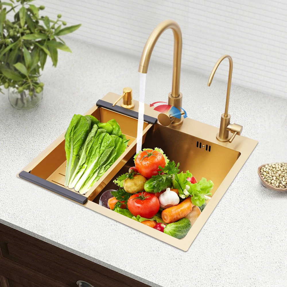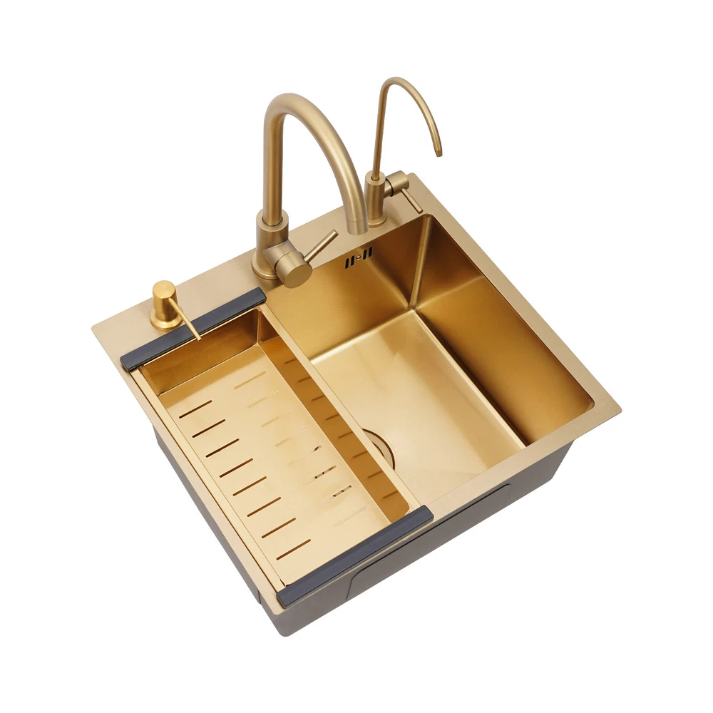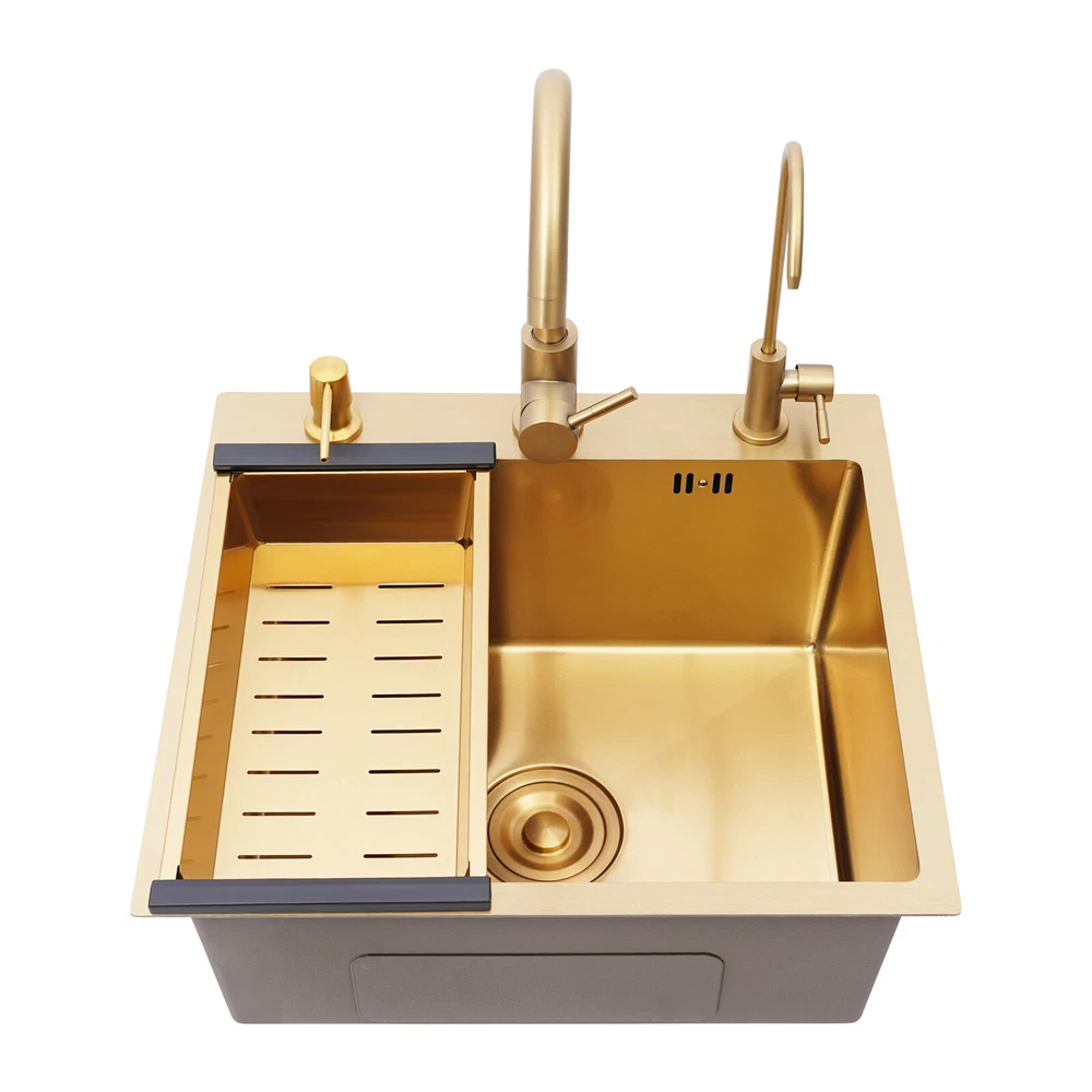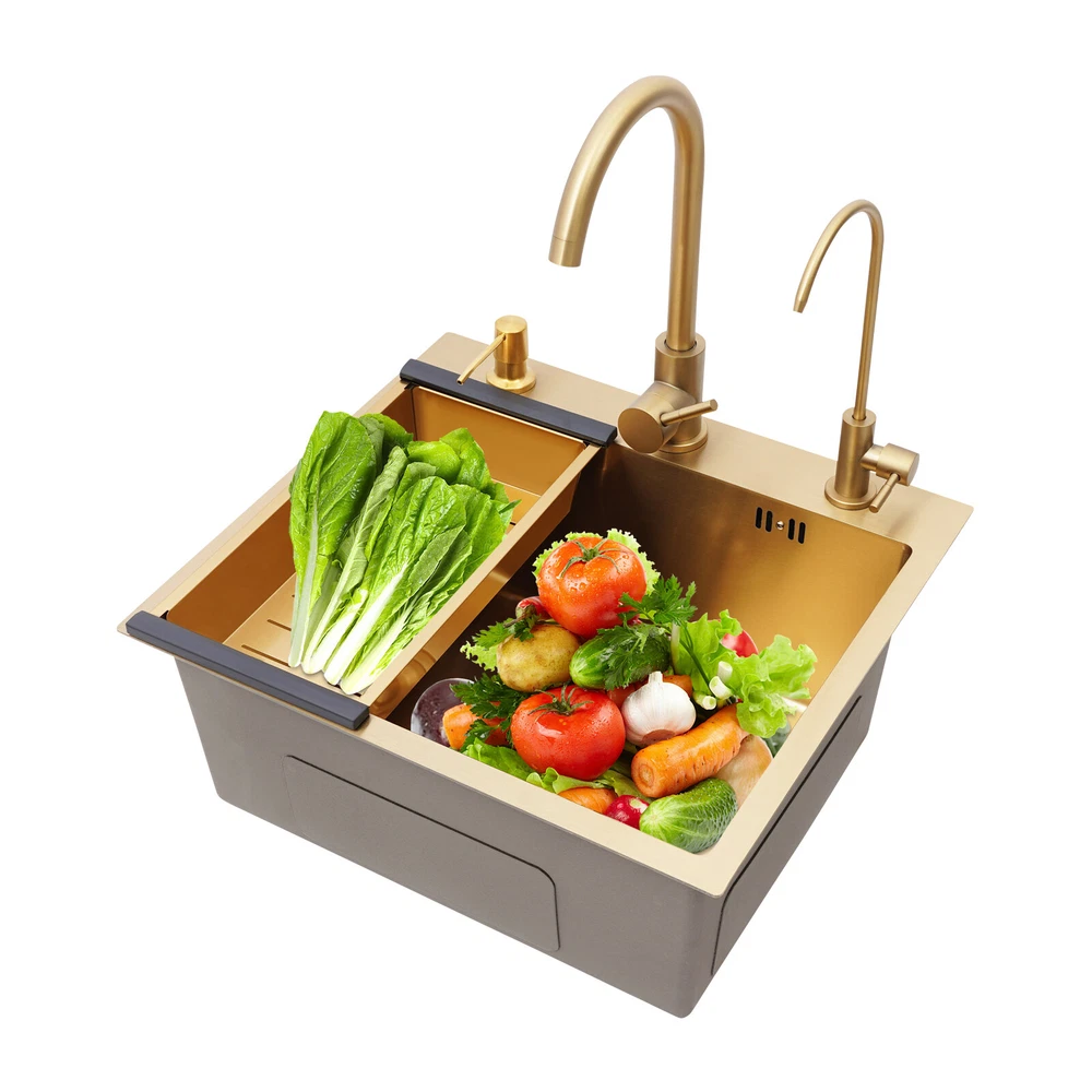 Specifications Color: Gold Style: Light Luxury Shape: Rectangular Material: Stainless Steel Process: Brushing, Polishing, Nano-coating Installation Type: Countertop, Drop-in Thickness: 3mm/0.12in Soap Dispenser Capacity: 150ml/5.07oz Assembly Required: Yes Sink Size: 50*45*20cm/19.69*17.72*7.87in Package Size: 55*50*26cm/21.65*19.69*10.24in Gross Weight: 5.9kg/13 lbs Net Weight: 5.61kg/12.37 lbs Package Included 1* Kitchen Sink 2* Faucets 1* Draining Basket 1* Soap Dispenser 1* Spanish & English & Chinese Manual Other Accessories for Assembly Drop in Gold Kitchen Sink Stainless Steel Sink Single Bowl Kitchen Sink 50x45 Description This kitchen sink is made of high-class materials and has multiple processes to ensure good performance and long service life. The large capacity design allows you to wash dishes freely, effectively improving the efficiency of kitchen use. This beautiful and practical kitchen sink is the key to creating an ideal kitchen space. It will be the new start of your new life in the kitchen! Key Features Selected Material: It is mainly made of premium stainless steel, processed through brushing, polishing, and nano-coating technology, with high strength, good wear resistance , corrosion resistance , and rust resistance , ensuring long-term use. Large Capacity: The 7.87-inch sink depth and the 19.69 * 17.72-inch large size provide you with a spacious use of space, which is suitable for washing dishes, vegetables, fruits, etc., improving the efficiency of kitchen operations. High Drainage Efficiency: The X-shaped water guideline, slightly inclined bottom structure, drain basket, and large drain hole can quickly discharge accumulated water and reduce the risk of blockage. Thoughtful Design: The anti-condensation coating prevents moisture from building up at the bottom of the sink, keeping kitchen cabinets dry. An acoustic mat has been added to the bottom of the sink to minimize noise and enhance the experience of using it, providing you with a quiet and comfortable environment. User-friendly: Two domestic and purification faucets that rotate 360 degrees and a 5.07oz soap dispenser make it easy to use for your daily cleaning, and the thick draining basket allows you to quickly drain your washed dishes to reduce the growth of bacteria . Moreover, it also comes with hot and cold water pipes for your flexible use of cold and hot water. Easy to Clean: The smooth surface and the R-corner design are not easy to accumulate stains, so you only need to wipe it with a soft cloth to keep it clean. Flexible Installation: This product supports countertops and embedded installation to meet the design requirements of different kitchen countertops and improve overall aesthetics. In addition, the three-hole design allows you to adjust the installation positions of the soap dispenser, large bend faucet, and clean faucet as needed. Stylish Appearance: The premium gold color and smooth lines can be matched with most types of kitchens, making your kitchen more beautiful and practical. Customer Service: Communication is the best way to solve problems. If you have any problems, please feel free to contact us. We will reply and solve the problem for you as soon as possible. Details High Overflow Holes: The humanized high-hole design can effectively prevent water from overflowing due to forgetting to close the tap. Smooth Edges: The rounded and smooth edges not only add to the aesthetics of the product but also improve the safety of use. Application It is suitable for open kitchens, bars, center island counters, balconies, flats, small kitchens, and so on. Specifications Color: Gold Style: Light Luxury Shape: Rectangular Material: Stainless Steel Process: Brushing, Polishing, Nano-coating Installation Type: Countertop, Drop-in Thickness: 3mm/0.12in Soap Dispenser Capacity: 150ml/5.07oz Assembly Required: Yes Sink Size: 50*45*20cm/19.69*17.72*7.87in Package Size: 55*50*26cm/21.65*19.69*10.24in Gross Weight: 5.9kg/13 lbs Net Weight: 5.61kg/12.37 lbs Package Included 1* Kitchen Sink 2* Faucets 1* Draining Basket 1* Soap Dispenser 1* Spanish & English & Chinese Manual Other Accessories for Assembly Notes Please check the size carefully before ordering. Please do not scratch its surface with sharp objects to obtain a longer service life. If you want to get a better installation result, we recommend that you hire a professional plumber to install it. Please allow the slight color difference caused by the shooting light and 1-3cm error due to manual measurement, and make sure you do not mind before you order. Payment Delivery details Terms of sales About us Contact us Payment We accept ebay payment 。 Fees such as import duties, taxes are not included in the item price or shipping costs. These charges are the buyer's responsibility. Delivery details Shipping: 2-9 working days to: USA Terms of sales We maintain high standards of excellence and strive for hundred percent customer satisfaction. Feedback is very important to us. We hope that you contact us immediately before you give neutral or negative feedback, so that we can address your concerns. It is impossible to address issues if we do not know about them! About us Your satis faction is our ultimate goal. We work hard to earn your trust and future business. Our certified technicians have tested each item before shipping. The unit comes with 1 year limited warranty on all manufacturing defects. a) If you receive a defective item, you may return it or ask for a discount. Please contact us within 14 days after you receive the package. b) What you returned must be intact and in its original packaging as re? u. Customer is responsible for shipping costs of the returned item. c) We will cover the cost of shipping back t with the shipping rate indicated in the registration page. We will send you a new unit or refund the full payment you paid. Thank you. Contact us Business Hour Business Hour: Monday To Friday: 8:30 AM to 5:00 PM (Beijing China time) Due to