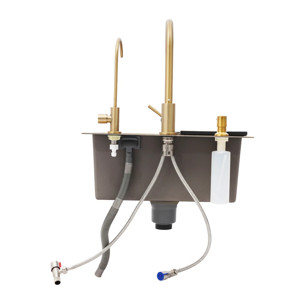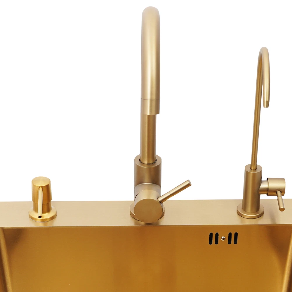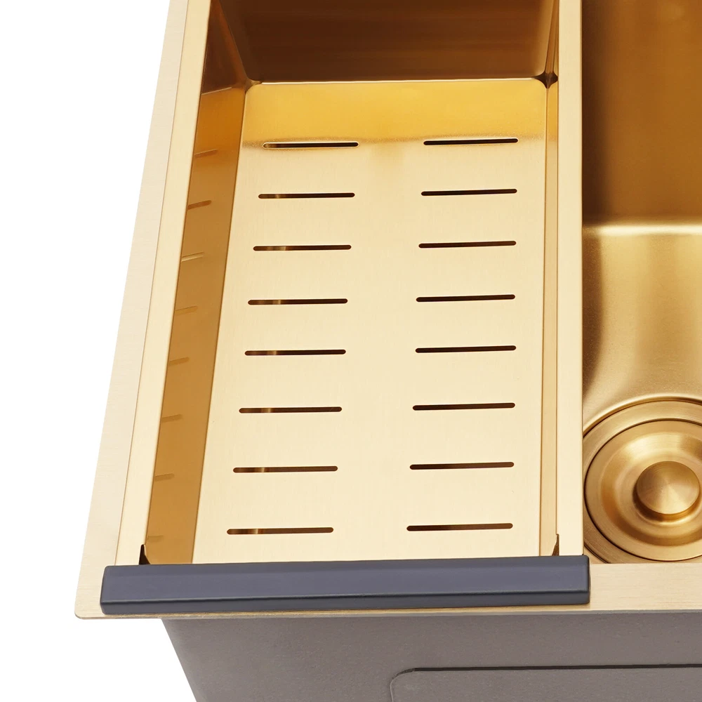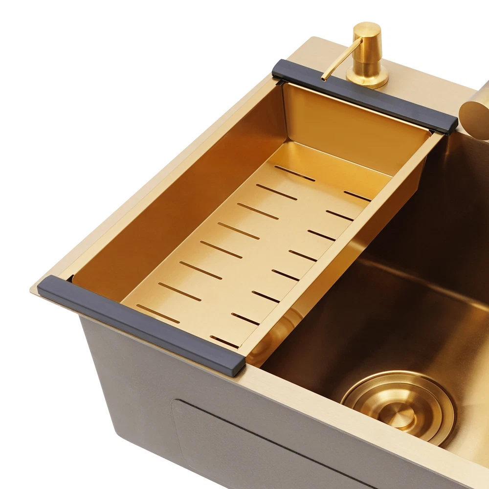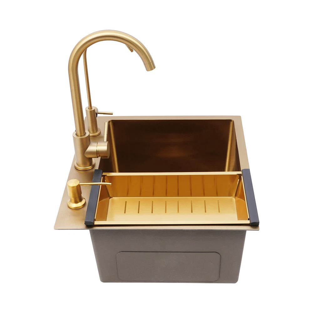 Specifications Color: Gold Style: Light Luxury Shape: Rectangular Material: Stainless Steel Process: Brushing, Polishing, Nano-coating Installation Type: Countertop, Drop-in Thickness: 3mm/0.12in Soap Dispenser Capacity: 150ml/5.07oz Assembly Required: Yes Sink Size: 50*45*20cm/19.69*17.72*7.87in Package Size: 55*50*26cm/21.65*19.69*10.24in Gross Weight: 5.9kg/13 lbs Net Weight: 5.61kg/12.37 lbs Package Included 1* Kitchen Sink 2* Faucets 1* Draining Basket 1* Soap Dispenser 1* Spanish & English & Chinese Manual Other Accessories for Assembly Drop in Gold Kitchen Sink Stainless Steel Sink Single Bowl Kitchen Sink 50x45 Description This kitchen sink is made of high-class materials and has multiple processes to ensure good performance and long service life. The large capacity design allows you to wash dishes freely, effectively improving the efficiency of kitchen use. This beautiful and practical kitchen sink is the key to creating an ideal kitchen space. It will be the new start of your new life in the kitchen! Key Features Selected Material: It is mainly made of premium stainless steel, processed through brushing, polishing, and nano-coating technology, with high strength, good wear resistance , corrosion resistance , and rust resistance , ensuring long-term use. Large Capacity: The 7.87-inch sink depth and the 19.69 * 17.72-inch large size provide you with a spacious use of space, which is suitable for washing dishes, vegetables, fruits, etc., improving the efficiency of kitchen operations. High Drainage Efficiency: The X-shaped water guideline, slightly inclined bottom structure, drain basket, and large drain hole can quickly discharge accumulated water and reduce the risk of blockage. Thoughtful Design: The anti-condensation coating prevents moisture from building up at the bottom of the sink, keeping kitchen cabinets dry. An acoustic mat has been added to the bottom of the sink to minimize noise and enhance the experience of using it, providing you with a quiet and comfortable environment. User-friendly: Two domestic and purification faucets that rotate 360 degrees and a 5.07oz soap dispenser make it easy to use for your daily cleaning, and the thick draining basket allows you to quickly drain your washed dishes to reduce the growth of bacteria . Moreover, it also comes with hot and cold water pipes for your flexible use of cold and hot water. Easy to Clean: The smooth surface and the R-corner design are not easy to accumulate stains, so you only need to wipe it with a soft cloth to keep it clean. Flexible Installation: This product supports countertops and embedded installation to meet the design requirements of different kitchen countertops and improve overall aesthetics. In addition, the three-hole design allows you to adjust the installation positions of the soap dispenser, large bend faucet, and clean faucet as needed. Stylish Appearance: The premium gold color and smooth lines can be matched with most types of kitchens, making your kitchen more beautiful and practical. Customer Service: Communication is the best way to solve problems. If you have any problems, please feel free to contact us. We will reply and solve the problem for you as soon as possible. Details High Overflow Holes: The humanized high-hole design can effectively prevent water from overflowing due to forgetting to close the tap. Smooth Edges: The rounded and smooth edges not only add to the aesthetics of the product but also improve the safety of use. Application It is suitable for open kitchens, bars, center island counters, balconies, flats, small kitchens, and so on. Specifications Color: Gold Style: Light Luxury Shape: Rectangular Material: Stainless Steel Process: Brushing, Polishing, Nano-coating Installation Type: Countertop, Drop-in Thickness: 3mm/0.12in Soap Dispenser Capacity: 150ml/5.07oz Assembly Required: Yes Sink Size: 50*45*20cm/19.69*17.72*7.87in Package Size: 55*50*26cm/21.65*19.69*10.24in Gross Weight: 5.9kg/13 lbs Net Weight: 5.61kg/12.37 lbs Package Included 1* Kitchen Sink 2* Faucets 1* Draining Basket 1* Soap Dispenser 1* Spanish & English & Chinese Manual Other Accessories for Assembly Notes Please check the size carefully before ordering. Please do not scratch its surface with sharp objects to obtain a longer service life. If you want to get a better installation result, we recommend that you hire a professional plumber to install it. Please allow the slight color difference caused by the shooting light and 1-3cm error due to manual measurement, and make sure you do not mind before you order. Payment Delivery details Terms of sales About us Contact us Payment We accept ebay payment 。 Fees such as import duties, taxes are not included in the item price or shipping costs. These charges are the buyer's responsibility. Delivery details Shipping: 2-9 working days to: USA Terms of sales We maintain high standards of excellence and strive for hundred percent customer satisfaction. Feedback is very important to us. We hope that you contact us immediately before you give neutral or negative feedback, so that we can address your concerns. It is impossible to address issues if we do not know about them! About us Your satis faction is our ultimate goal. We work hard to earn your trust and future business. Our certified technicians have tested each item before shipping. The unit comes with 1 year limited warranty on all manufacturing defects. a) If you receive a defective item, you may return it or ask for a discount. Please contact us within 14 days after you receive the package. b) What you returned must be intact and in its original packaging as re? u. Customer is responsible for shipping costs of the returned item. c) We will cover the cost of shipping back t with the shipping rate indicated in the registration page. We will send you a new unit or refund the full payment you paid. Thank you. Contact us Business Hour Business Hour: Monday To Friday: 8:30 AM to 5:00 PM (Beijing China time) Due to