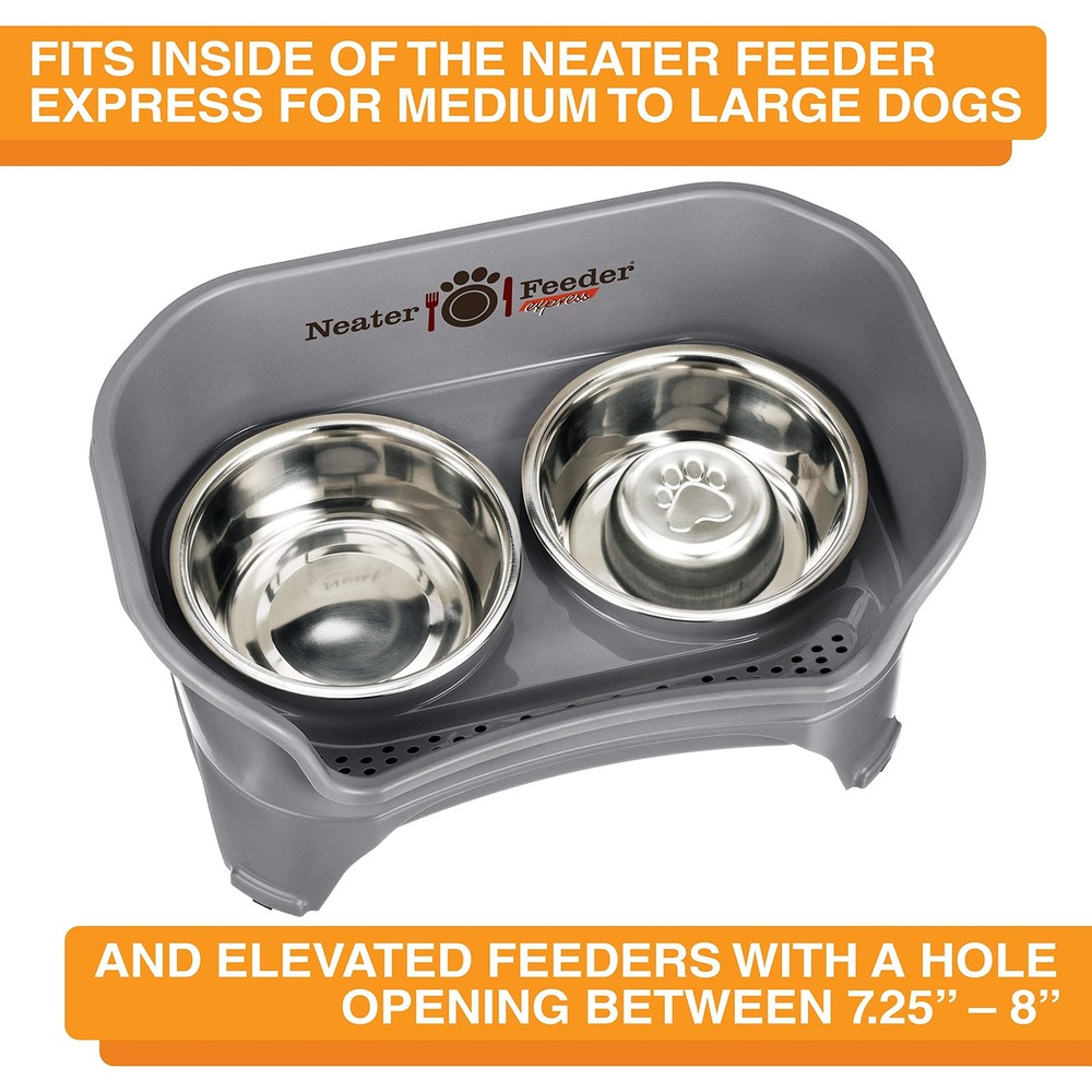 Introducing our Slow Feeder Dog Bowls, designed specifically for large breeds, featuring a stainless steel construction that ensures durability and hygiene; these slow feeder dog bowls come with a unique maze dog food bowl insert that transforms mealtime into an engaging dog puzzle bowl experience, promoting healthier eating habits and preventing bloating, making them the perfect choice for your small dog slow feeder bowl needs. FITS INSIDE SELECT NEATER FEEDERS: 3-cup stainless steel slow feed bowl fits in the Neater Feeder Deluxe Large and the Neater Feeder Express Medium to Large. It will also fit inside other raised feeders with a bowl opening between 7.25" – 8”. DOES NOT FIT INSIDE ANY OTHER SIZE NEATER FEEDER DELUXE OR EXPRESS. SLOWS DOWN RAPID EATERS: Eating too quickly can lead to indigestion, vomiting, bloat, and overeating. A slow feed food bowl helps prevent your pet from the dreaded “scarf and barf.” JUST CHALLENGING ENOUGH: Ever look at a slow feeder and think, how in the world will my cat or dog get the food out of that? The idea is to slow your pet’s eating down, not to create unnecessary frustration. Our slow feed bowl is designed to slow them down without driving them crazy. PROVIDES MENTAL ENRICHMENT: Puzzle bowls provide a challenge to your pet, which helps provide mental stimulation and reduce boredom. 3 CUP CAPACITY: Slow-feed dog bowl holds up to 3 cups of wet or dry food—measures 8.25” in Diameter and 2.75" High. We recommend this size for medium to large dog breeds.