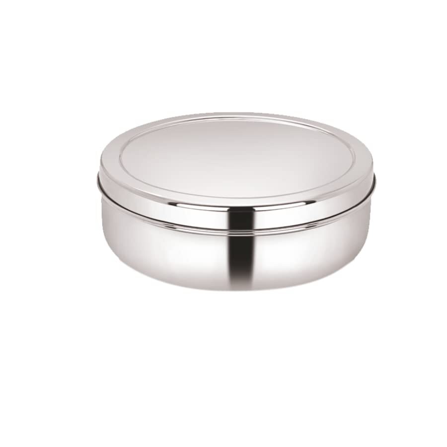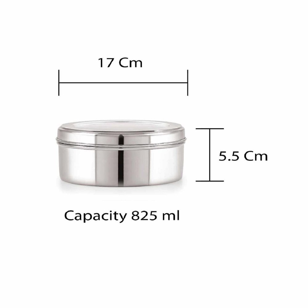 Material: Stainless Steel, made from High quality stainless steel making it exclusive and durable. Keep your most used spices/masalas in one compact place that is each to use saving you time and effort. Stainless steel lid inside to prevent spillage, Outer Stainless steel lid for strength and durability Made of steel, the spice box is easy to clean. Simply wash with mild soap and sponge. Package Contents: 1 Masala Dabba + 7 Containers + 1 Spoon and 1 Steel Plate. Item Dimensions LxWxH : 17 x 17 x 5.5 Centimeters. Capacity : 825 ML