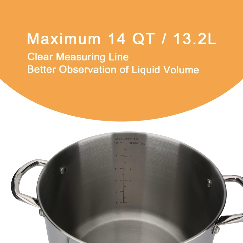 Our stainless steel stockpot can hold up to at a time and is suitable for any kitchen. Easy to use for both culinary beginners in the home kitchen and experienced commercial chefs. It is versatile that you can use it to cook family-sized stews, soups, pasta, sauces or canned water. The stockpot features food-grade healthy nickel free stainless steel with excellent polishing process, construction with great stability and strength, takes into account durability, aesthetics and health-conscious. The encapsulated aluminum base can distribute heat quickly and evenly, to achieve fast and lasting heating. The stainless steel stockpot can be used on any stovetop, is sensitive-friendly, oven-safe, has the lid removed, and can be used at temperatures up to 500 ℉. It is worth better care, so we recommended hand wash and dry the water after cleaning before storing. Stackable design, to maximize storage space and keep your kitchen organized. Our stainless steel stockpot has riveted stainless steel side handles for comfortable and durable, and reliable strength. It is your reliable choice for cooking and serving dishes, whether you're carrying them to the kitchen or the backyard. The stockpot comes with a clear tempered glass lid that circulates heat and moisture during cooking, to retains the natural flavor and nutrients of the food, and also provides better visibility to check the food at a glance. The small hole in the lid helps to release steam and prevent boiling from spilling over. This stockpot is the perfect tool for every cooking lovers. We are committed to providing quality products and service. If you have any questions about our products, please feel free to contact us. FOOD-GRADE STAINLESS STEEL: The 14qt stock pot is made of high-quality stainless steel, ensuring durability, corrosion resistance, and a sleek modern look. Its encapsulated bottom ensures even heat distribution for perfect cooking results, whether you're simmering, boiling, or stewing. VERSATILE COOKING: The perfect choice for making large quantities of soups, stews, and stocks, catering to the needs of both home cooks and event caterers with its generous capacity. COOKTOP COMPATIBILITY: Effortlessly compatible with induction cooktops and all other stovetops, offering flexibility in cooking methods and adapting to various kitchen setups. TEMPERED GLASS LID & ERGONOMIC HANDLES: The see-through tempered glass lid allows for easy monitoring of the cooking process, while the securely riveted handle ensures a comfortable and safe grip, enhancing both convenience and safety. DISHWASHER SAFE & OVEN SAFE: The stock pot is dishwasher safe, but it is recommended to handwash it in order to maintain its stainless steel shine. It is also oven-safe for added versatility, effectively distributing and retaining heat for even cooking. The maximum temperature it can withstand is 500°F/260℃, except for the glass lid which can handle up to 350°F/176℃.
