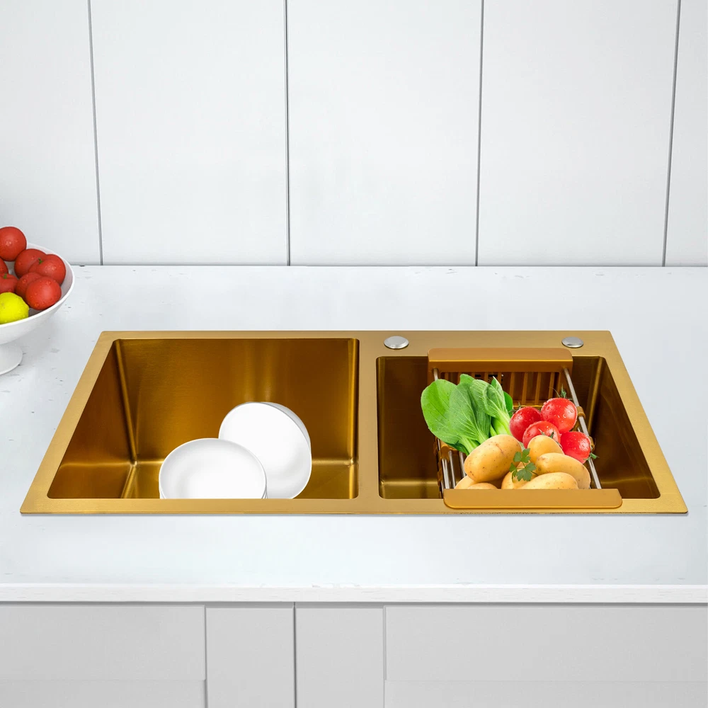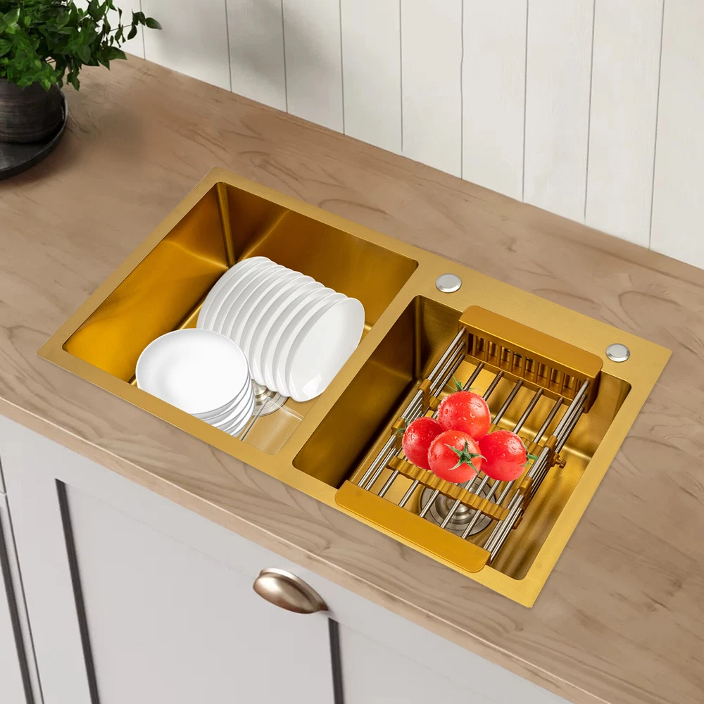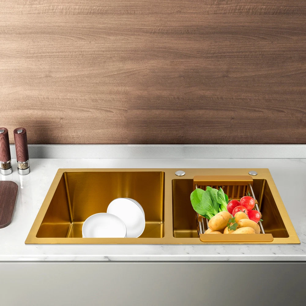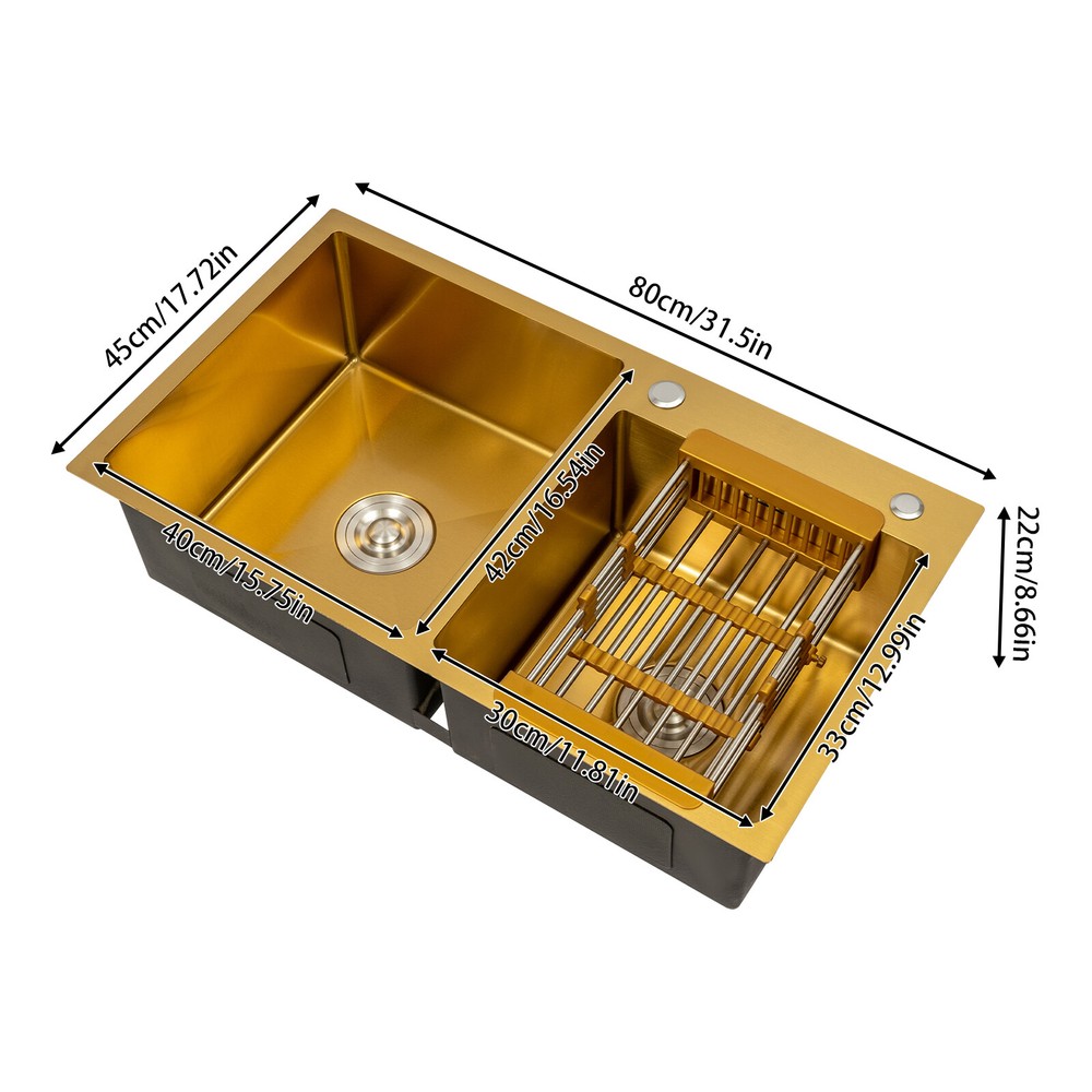 Gold Undermount Kitchen Sink, 80*45 cm Stainless Steel Kitchen Sink Double Bowls Description This 304 stainless steel sink is both stylish and functional. The gold color has a luxurious and shiny appearance, and it is made of high-quality stainless steel, which is sturdy and durable. 2 separate independent bowls with deep depth,a large capacity and a strong carrying capacity are enough to meet your daily washing needs. A good drainage system and a retractable draining basket provide you with a more convenient and cleaner kitchen environment. Key Features Build to Last: This sink is made of high-quality 304 stainless steel with a nano-coating process, which has good corrosion resistance , anti-abrasion and scratch resistance , and is sturdy and durable, ensuring a long service life. Stylish Appearance: This product is gold, giving people a sense of luxury and elegance. Its exquisite and stylish appearance, and smooth lines, make it suitable for most home styles, adding a special color to the kitchen. Large Capacity : Two large (left:15.75*16.54 inches, right: 11.81*12.99 inches) and deep (8.66 inches) sinks allow you to multitask and clean vegetables, fruits, plates, and cookware at one time without splashing, saving time. Strong Load-bearing Capacity: Thanks to its high-quality material, solid rectangular structure, and 3mm thickened panel, it has a weight-bearing capacity of about 198.42 lbs , making it confident for you to handle dishes on it. Good Drainage System: The X-shaped water guiding line and a large-diameter drain can guide water flow and form vortices to achieve rapid drainage without accumulating at the bottom. The special V and F shaped drain pipe drains faster and the standing water in it forms a natural barrier against insects and odors, providing you with a clean kitchen environment. Thoughtful Design: It has environmentally friendly rubber sound-deadening mats, which can effectively reduce the sound of running water. In addition, the product has an anti-condensation coating, which can effectively prevent condensation in winter and avoid moisture and water accumulation in the cabinet. Easy to Clean: With its simple structure and smooth surface, it is easy for you to clean it with a soft cloth(not included). Easy to Assemble : The complete range of mounting parts and the simple construction of the product allow you to install it quickly and accurately in a short time. Quality Service: We are honored that you have chosen our product. We have sufficient confidence in the quality of the product so that you can buy it confidently. But if you have any questions, you can contact our customer service, he will patiently answer and solve your problems. Details R-corner: Smooth R-corner not only enlarges the space, but also increases the beauty of the product, and it improves the safety of use. It also eliminates the dead corner of dirt accumulation for easy cleaning. Anti-overflow Outlet: The product has multiple holes for overflow, which drains water quickly and prevents water from overflowing out due to forgetting to turn off the faucet. Retractable Draining Basket: It can be used to drain fruits, vegetables, washed bowls and plates, etc. Application This product can be used to clean tableware, vegetables, fruits, and so on. It is widely used in kitchens, bathrooms, restaurants, school canteens, bars, dessert stores, coffee shops, hotels, garages, gardens, hotels, etc. Specifications Material: 304 Stainless Steel, Rubber Process: Nano-coating Color: Gold Style: Modern Shape: Rectangular Filtration Mode: Coarse Filter, Fine Filter Assembly Requirements: Yes Mount Type: Topmount, Undermount, Flushmount Stainless Steel Thickness: 3mm/0.12in Number of Bowls: 2 Overall Product Load-bearing Capacity: About 90kg/198.42 lbs Left Bowl Size: 40*42*22cm/ 15.75*16.54*8.66in Right Bowl Size: 30*33*22cm/11.81*12.99*8.66in Overall Product Size: 80*45*22cm/ 31.5*17.72*8.66in Pakage Size: 86*51*27cm/33.86*20.08*10.63in Gross Weight: 8kg/17.64lbs Net Weight: 7.5kg/16.53lbs Package Included 1* 304 Stainless Steel Sink 1* Drain Basket 1*Drain Pipe Notes Please check the size carefully before ordering. Please do not scratch its surface with sharp objects to obtain a longer service life. Please note that this package does not include the faucet. Please do not use strong acids or alkalis to clean items in the sink, and do not put hard objects or rusty metal in contact with the sink for a long time, keep the sink clean by cleaning the tank and drying it with a rag after each use. If you want to get a better installation result, we recommend that you hire a professional plumber to install it. Please allow the slight color difference caused by the shooting light and 1-3cm error due to manual measurement, and make sure you do not mind before you order. Brand Unbranded Type Double Sink Item Height / Item Length / Item Width / Room Kitchen Mounting Undermount Material Stainless Steel Bowl Height 22cm Color Gold Bowl Shape Rectangular Style Modern Number of Faucet Holes 2 Holes Shape Rectangular Assembly Required Yes