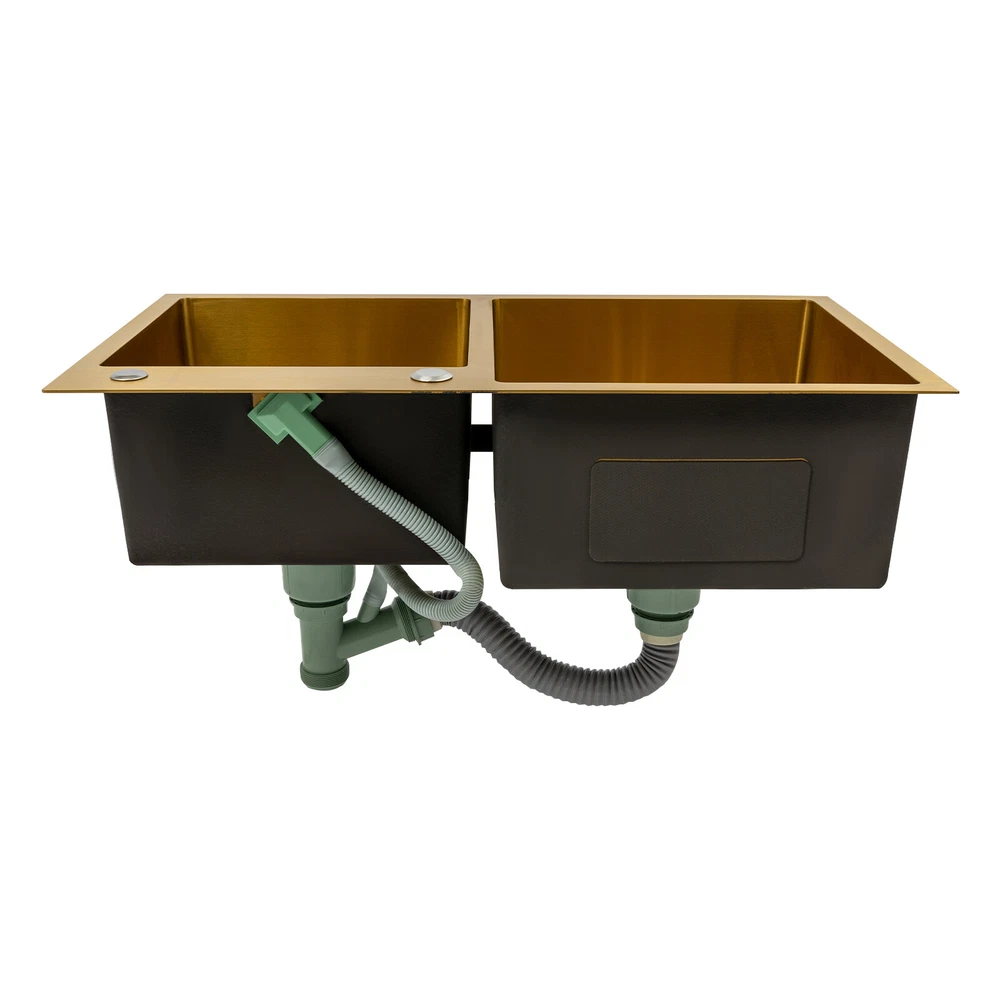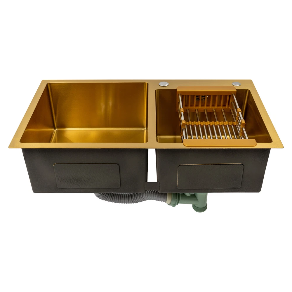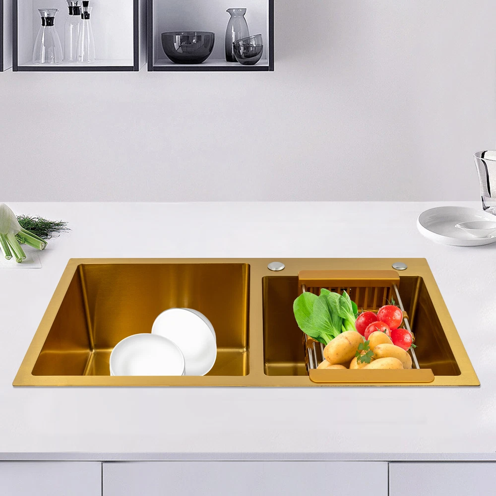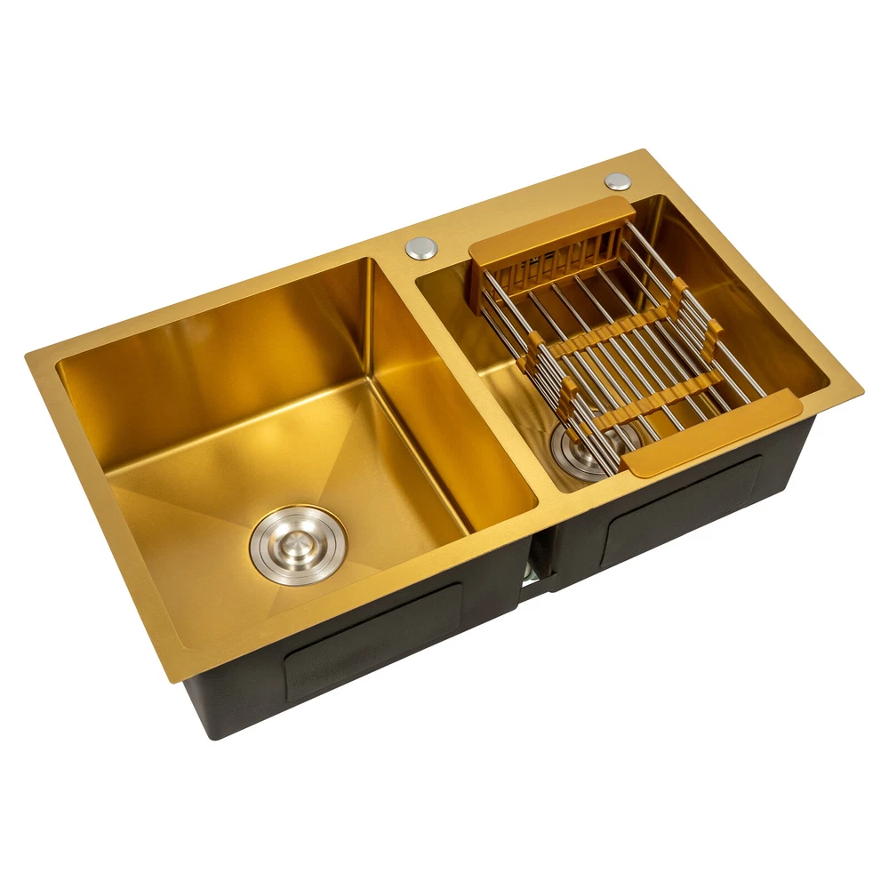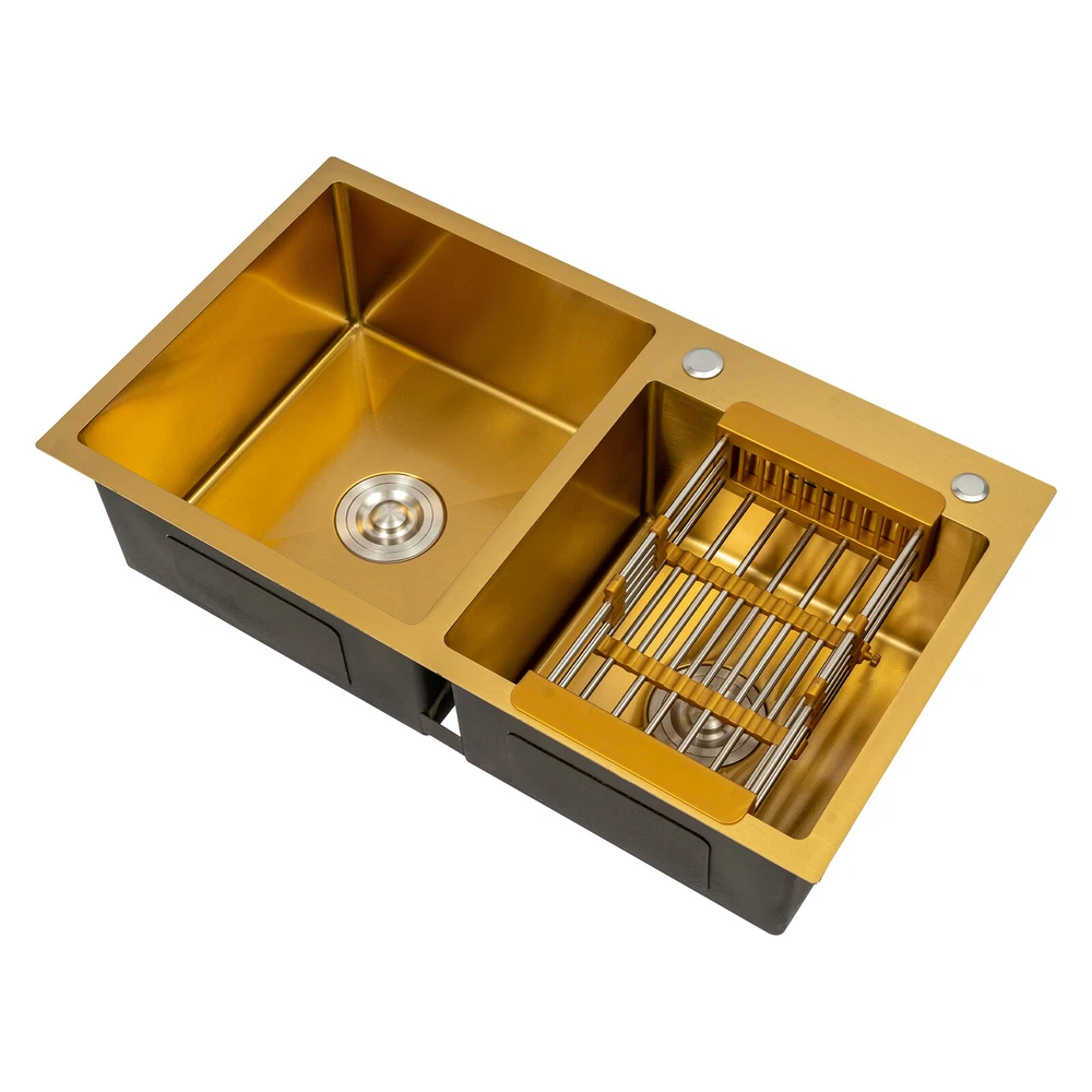 Gold Undermount Kitchen Sink, 80*45 cm Stainless Steel Kitchen Sink Double Bowls Description This 304 stainless steel sink is both stylish and functional. The gold color has a luxurious and shiny appearance, and it is made of high-quality stainless steel, which is sturdy and durable. 2 separate independent bowls with deep depth,a large capacity and a strong carrying capacity are enough to meet your daily washing needs. A good drainage system and a retractable draining basket provide you with a more convenient and cleaner kitchen environment. Key Features Build to Last: This sink is made of high-quality 304 stainless steel with a nano-coating process, which has good corrosion resistance , anti-abrasion and scratch resistance , and is sturdy and durable, ensuring a long service life. Stylish Appearance: This product is gold, giving people a sense of luxury and elegance. Its exquisite and stylish appearance, and smooth lines, make it suitable for most home styles, adding a special color to the kitchen. Large Capacity : Two large (left:15.75*16.54 inches, right: 11.81*12.99 inches) and deep (8.66 inches) sinks allow you to multitask and clean vegetables, fruits, plates, and cookware at one time without splashing, saving time. Strong Load-bearing Capacity: Thanks to its high-quality material, solid rectangular structure, and 3mm thickened panel, it has a weight-bearing capacity of about 198.42 lbs , making it confident for you to handle dishes on it. Good Drainage System: The X-shaped water guiding line and a large-diameter drain can guide water flow and form vortices to achieve rapid drainage without accumulating at the bottom. The special V and F shaped drain pipe drains faster and the standing water in it forms a natural barrier against insects and odors, providing you with a clean kitchen environment. Thoughtful Design: It has environmentally friendly rubber sound-deadening mats, which can effectively reduce the sound of running water. In addition, the product has an anti-condensation coating, which can effectively prevent condensation in winter and avoid moisture and water accumulation in the cabinet. Easy to Clean: With its simple structure and smooth surface, it is easy for you to clean it with a soft cloth(not included). Easy to Assemble : The complete range of mounting parts and the simple construction of the product allow you to install it quickly and accurately in a short time. Quality Service: We are honored that you have chosen our product. We have sufficient confidence in the quality of the product so that you can buy it confidently. But if you have any questions, you can contact our customer service, he will patiently answer and solve your problems. Details R-corner: Smooth R-corner not only enlarges the space, but also increases the beauty of the product, and it improves the safety of use. It also eliminates the dead corner of dirt accumulation for easy cleaning. Anti-overflow Outlet: The product has multiple holes for overflow, which drains water quickly and prevents water from overflowing out due to forgetting to turn off the faucet. Retractable Draining Basket: It can be used to drain fruits, vegetables, washed bowls and plates, etc. Application This product can be used to clean tableware, vegetables, fruits, and so on. It is widely used in kitchens, bathrooms, restaurants, school canteens, bars, dessert stores, coffee shops, hotels, garages, gardens, hotels, etc. Specifications Material: 304 Stainless Steel, Rubber Process: Nano-coating Color: Gold Style: Modern Shape: Rectangular Filtration Mode: Coarse Filter, Fine Filter Assembly Requirements: Yes Mount Type: Topmount, Undermount, Flushmount Stainless Steel Thickness: 3mm/0.12in Number of Bowls: 2 Overall Product Load-bearing Capacity: About 90kg/198.42 lbs Left Bowl Size: 40*42*22cm/ 15.75*16.54*8.66in Right Bowl Size: 30*33*22cm/11.81*12.99*8.66in Overall Product Size: 80*45*22cm/ 31.5*17.72*8.66in Pakage Size: 86*51*27cm/33.86*20.08*10.63in Gross Weight: 8kg/17.64lbs Net Weight: 7.5kg/16.53lbs Package Included 1* 304 Stainless Steel Sink 1* Drain Basket 1*Drain Pipe Notes Please check the size carefully before ordering. Please do not scratch its surface with sharp objects to obtain a longer service life. Please note that this package does not include the faucet. Please do not use strong acids or alkalis to clean items in the sink, and do not put hard objects or rusty metal in contact with the sink for a long time, keep the sink clean by cleaning the tank and drying it with a rag after each use. If you want to get a better installation result, we recommend that you hire a professional plumber to install it. Please allow the slight color difference caused by the shooting light and 1-3cm error due to manual measurement, and make sure you do not mind before you order. Brand Unbranded Type Double Sink Item Height / Item Length / Item Width / Room Kitchen Mounting Undermount Material Stainless Steel Bowl Height 22cm Color Gold Bowl Shape Rectangular Style Modern Number of Faucet Holes 2 Holes Shape Rectangular Assembly Required Yes