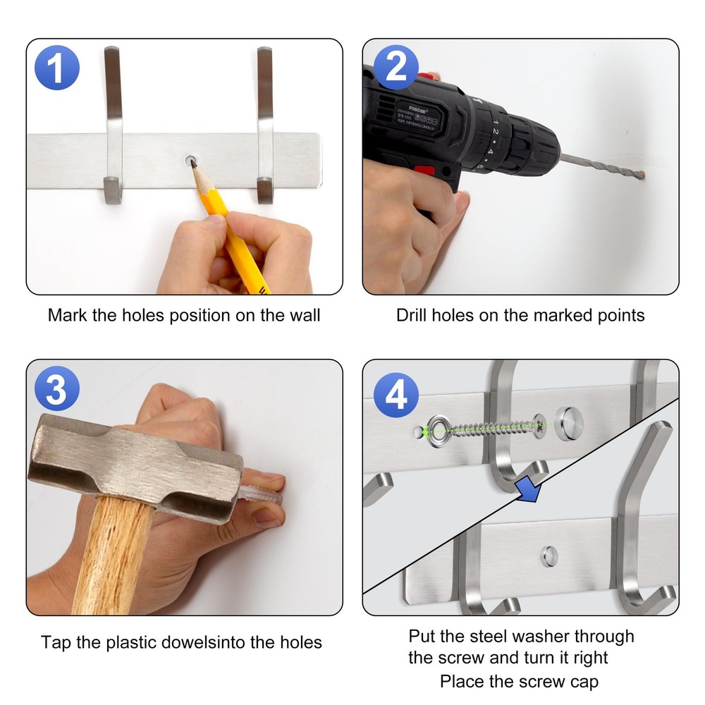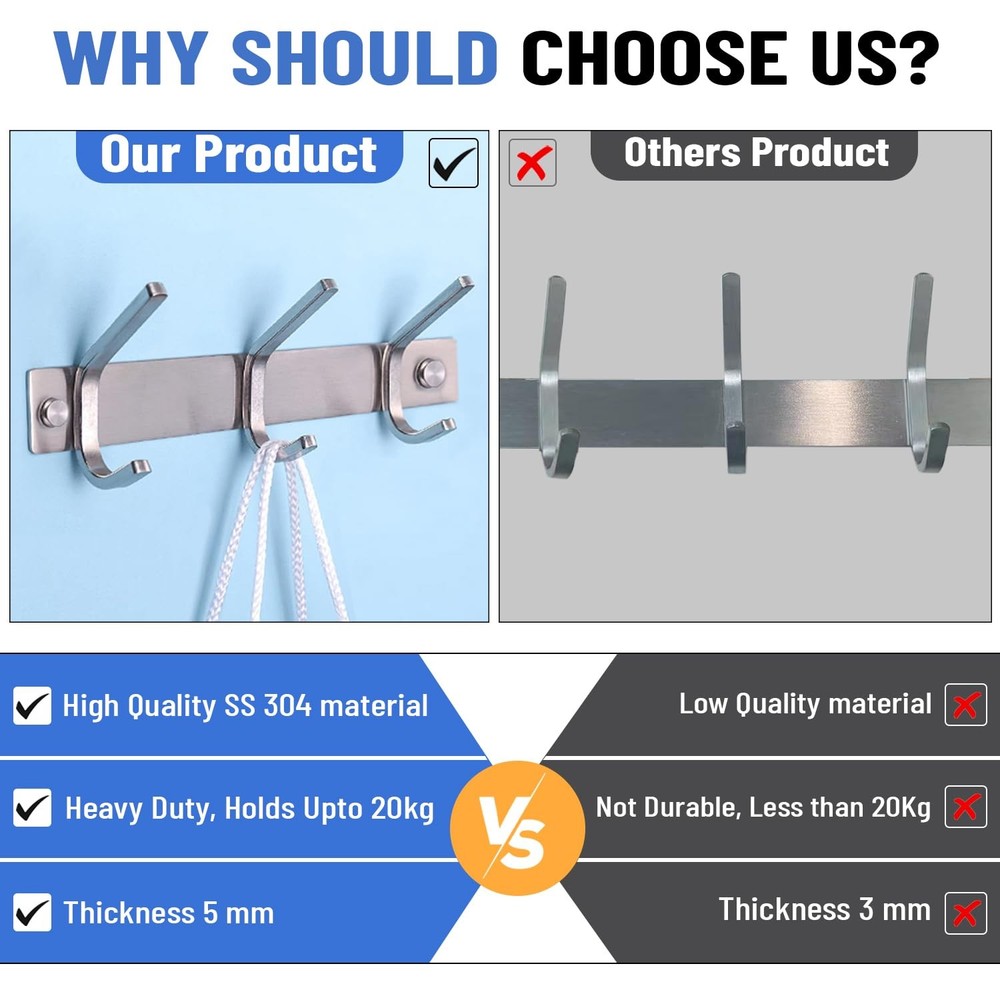 coat hooks are prepared from stainless steel to ensure a reliable, heavy-duty, and elegant product for our valuable customers. Our wall hooks are flexible and can be mounted on walls, doors, bathrooms, kitchen, laundry, and more without disturbing your home décor. However glossy appearance ascribed to the stainless steel finishing it will enhance the charm of your home furnishings. Quality assurance: For quality of the product cannot be compromised. Therefore our product is genuinely prepared from high-grade, highly durable 304 stainless steel. Moreover, we ensure the coat hooks are corrosion and rust-free. You can conveniently hang your stuff on it without worrying about rust stains. Three hook design: coat hooks each hook is especially three hooks designed to accumulate more stuff on it. Therefore you can hang more clothes or coats to minimize space constraints. Each rack of our product features 5 round edge coat hooks. Each hook has a further three hooks to ensure maximum hanging capacity. Sleek Contour: Coat hook features a sleek design with a shiny stainless steel finish making it feasible for multipurpose use. Three round edge hooks on each hook apart from accommodating several clothes displays an elegant appearance as well. Easy To Install: provides all the necessary hardware to install this coat hook. Installing these coat hooks is a breeze. This wall coat rack features pre-drilled holes for convenient installation. 2 stainless steel wall hook are provided with screws and screw cover for a neat tidy look. Specification: Rust-free Stainless steel 5 hooks on each rack. Each hook features 3 hooks design Pack of 2 coat hooks WELL-CONSTRUCTED: These coat hooks are made of premium stainless steel SS 304 which is both shinny and rigorous. Using these wall mounted coat rack in your room will add a glamorous look to it through gleam and these hooks are long lasting VERSATILE: This hook can be used in any room for hanging Towel, Hats, Jacket, Purse. Can be used in the Bathroom & Entryway for any purpose, with any décor. EASY INSTALLATION: Simply mount the hooks to the wall with the included hardware for a quick and hassle-free setup. ORGANIZED: Our wall hooks provide ample space to keep your items neatly arranged and within reach. Our Guarantee: Purchase includes 2 Coat Racks, Instruction Card, Screws and Covers, In case of any complication while using our coat hooks, our customer support will guide you through and solve it for you.Get these coat hooks for wall mounted on the go. Design: Coat Rack is a patented design product that shows brands seriousness towards providing quality products to its customers. Coat hooks are designed ergonomically. It does not rust, these coat racks are best in their class.