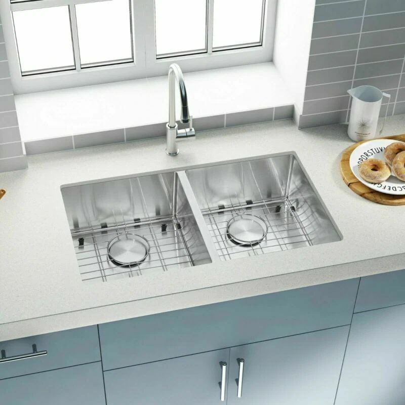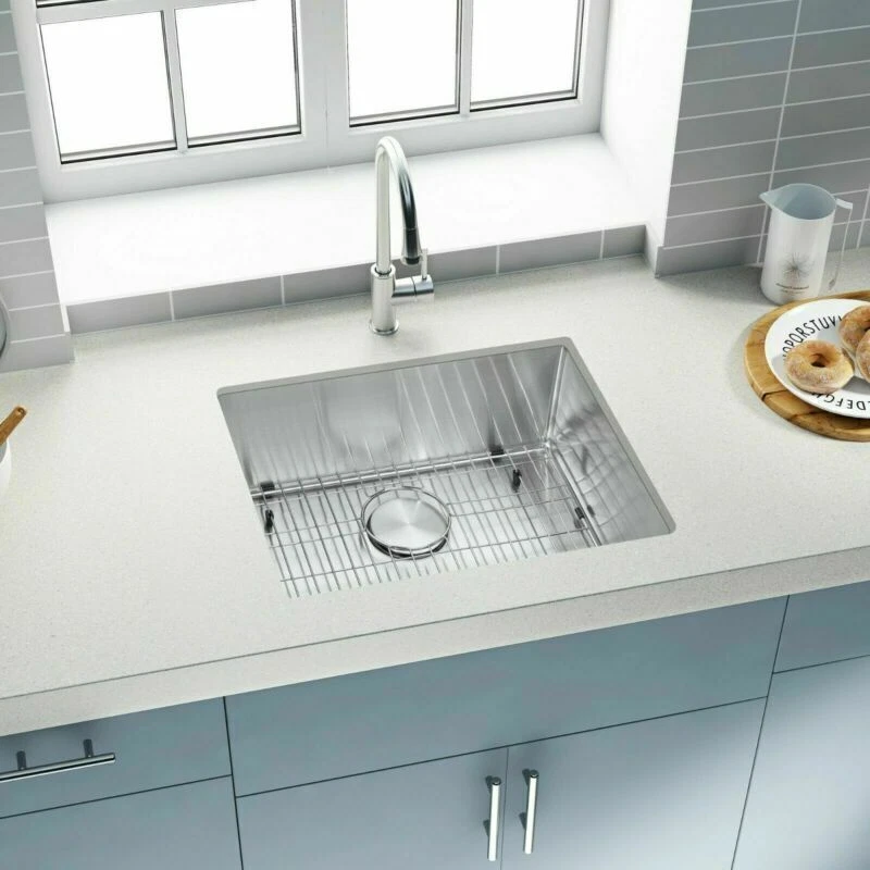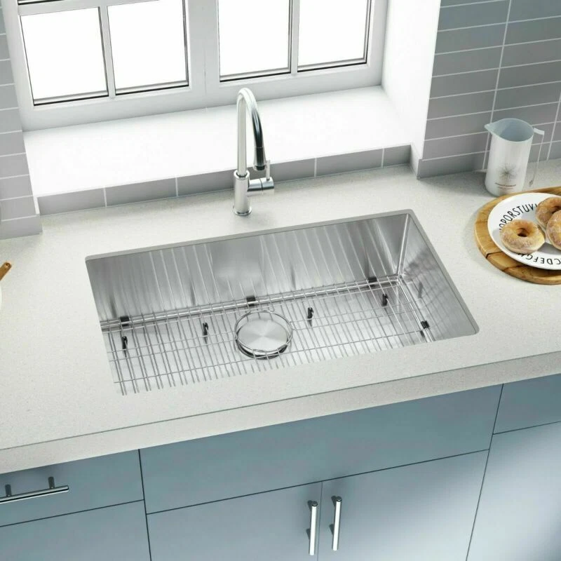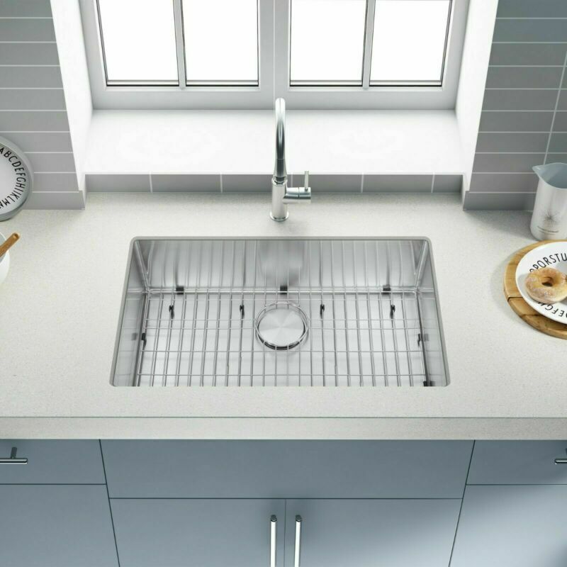 SHIP FROM USA WAREHOUSE!!! Premium 304 grade stainless steel with excellent corrosion and rust-resistant 18 Gauge stainless steel thickness 10mm radius corner for easy cleaning and modern look Commercial grade brushed finish for easy to clean and long-lasting Heavy duty sound guard undercoating and thick rubber padding to minimize noise and reduce condensation Slanted bottom with elegant drain grooves for easy water draining USA standard 3.5'' drain opening will fit any garbage disposal unit Drain placement – Rear drain placement ensures dishes don't settle on the drain Stainless steel bottom rinse grid can protect the sink from scratches and acts as a drying rack for pots and pans Stainless steel basket strainer drain that traps goods waste and can be easily emptied into the trash Stainless steel decorative drain cover that adds to the visual beauty .It covers the drain while allowing water and waste to flow through under it . Accessories Strainer and decorative drain cover Bottom rinse grid Cut-out template paper Installation mounting brackets hardware Package Package: Foam corner guard+7 layers stronger carton