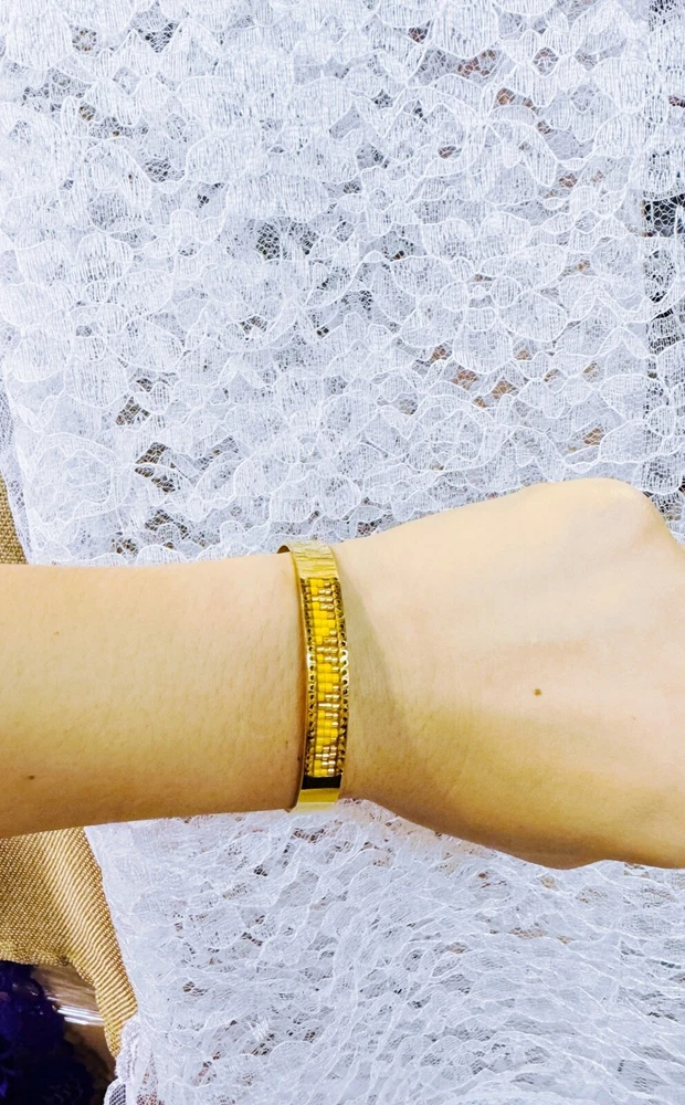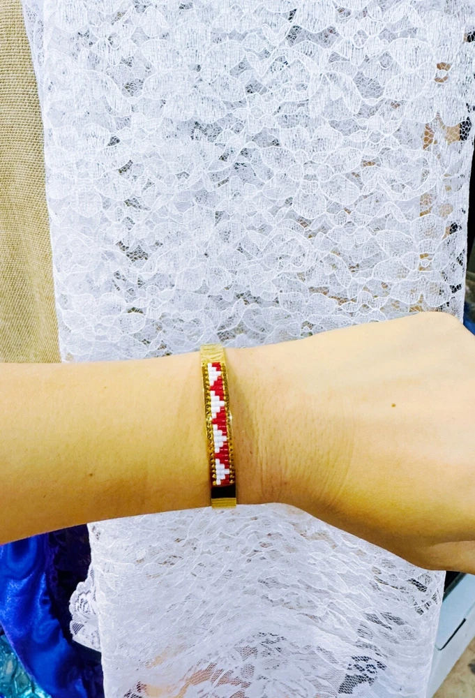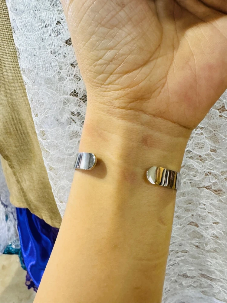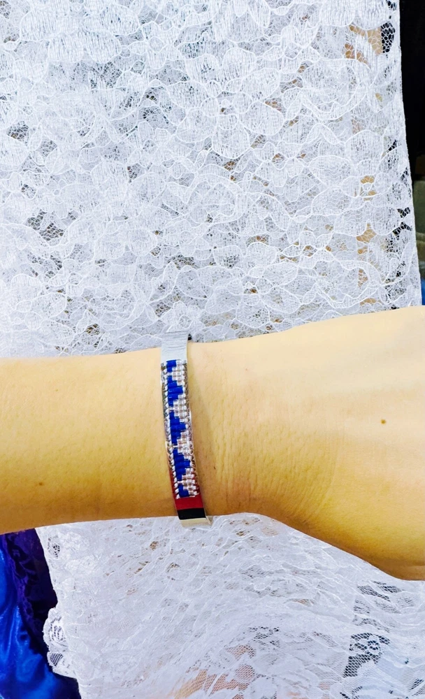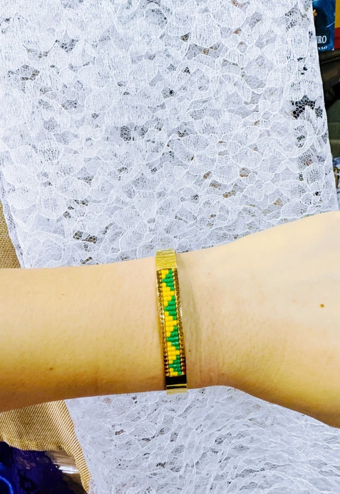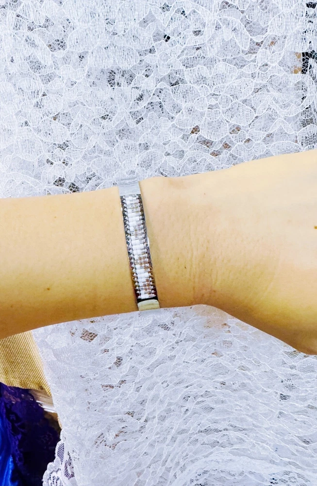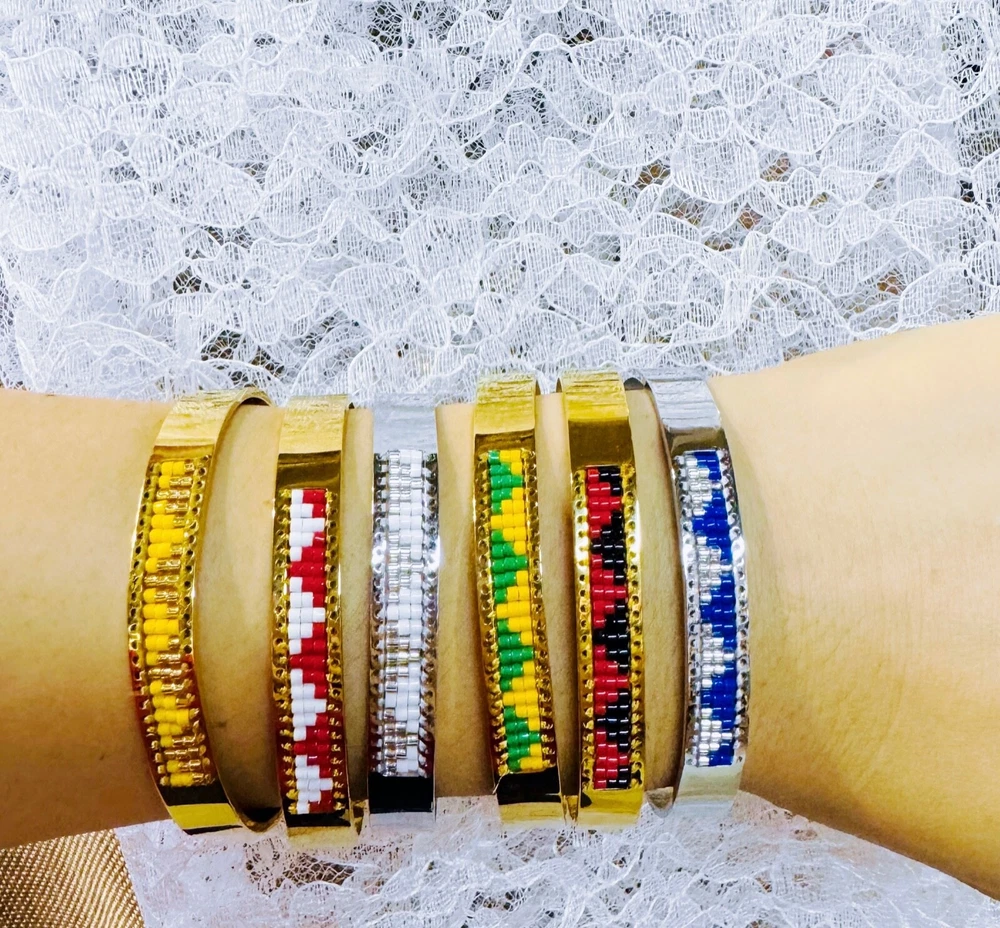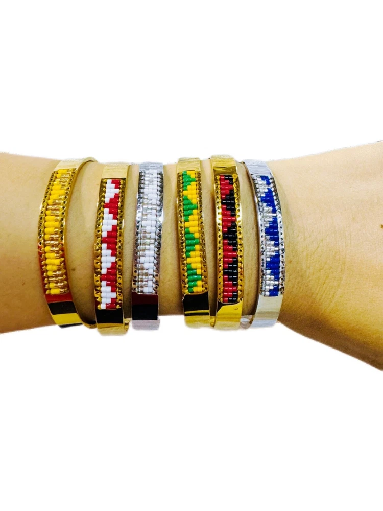 This vintage unisex bracelet is a handmade stainless steel bangle with multicolor beads. It features a Santeria blessing and is adjustable for a comfortable fit. The bracelet has a chain and bangle style, making it suitable for various occasions. The design includes religious, awareness, and beauty themes, making it a unique and meaningful piece of jewelry.