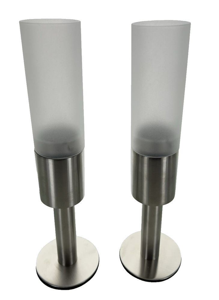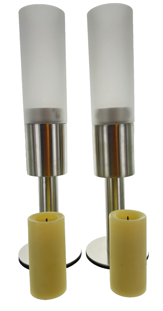 -Set Of 2 With 3'' Ivory Votive- Turn this modern stainless and frosted glass votive holder into your tabletop decor. Great for hospitality and event planners. Use any of our flameless tealights or votives for the look your going for your next upcoming event. Product Specifications SKU: #SH-04 Set Of 2 Size: 11.25" H x 2.5" Dia Color: Stainless with Frosted Glass Type: Modern Votive and Tealight Holder