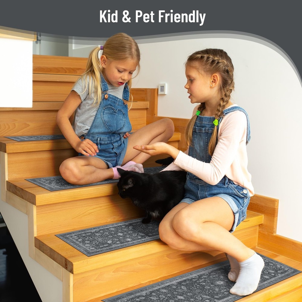 Stair Treads Non Slip 15PCS 8"x30" Stair Treads for Wooden Steps, Rubber Backing Stair Runner Washable Carpet Stairs Treads, Indoor Safety Stair Runners for Kids Elders Dogs Product Details Size: 8"x30" Color: Grey Number of Items: 15 Brand: Tiveney MPN: ZY-HHboho-Grey-15 UPC: Does not apply EAN: Does not apply Material: Polyester (PET) Brand: Tiveney Item dimensions L x W x H: 30 x 8 x 0.3 inches Color: Grey Shape: Rectangular Item Thickness: 0.3 Inches Grade Rating: Residential Number of Items: 15 Item Weight: 10.5 pounds Product Dimensions: 30 x 8 x 0.3 inches Country of Origin: China Date First Available: June 10, 2024 Soft & Comfy: Our carpet treads for wood stairs are crafted from plush faux wool to create a soft, gentle surface that feels like walking on a cloud. With a 0.3" thickness, these stairs carpet non slip reduces noise by 80% and provides excellent cushioning for all your loved ones, ensuring a comfortable surface to walk on. Ultra Non-Slip Stair Treads indoor: The stair runners for wooden steps non slip with rubber backing can be firmly attached to the floor and stays in place, providing extra non-slip support and friction, allowing you to enjoy a more relaxed and safe experience up and down the stairs. Sturdy & stylish: Made with 100% low-pile faux wool and reinforced edges, our carpet runner for stairs can stand up to daily foot traffic and paw scratches. The abstract color patterns add a touch of modern style, enhance the aesthetics of any staircase. These indoor stair treads are the perfect choice for all. Easy Install & No Residue: Clean the floor, dry it, and place it. Without using any tape or permanent glue, this stair carpet strips leaves no residue after repositioning or removal, protecting your wooden floor. It can be used on various floors such as wood, tile, marble, metal and glass. Machine Washable: Maintain the carpet for stairs non slip 15 pack with ease by shaking or vacuuming, for a deep clean, toss them in the washing machine. The microfiber doesn't shed or fade after multiple washes and air drying, and the anti-slip property remains intact.