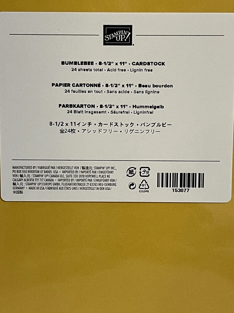 Model: Bumblebee Type: Card Stock Brand: Stampin' Up! Size: 8 1/2” X 11” Color: Yellow