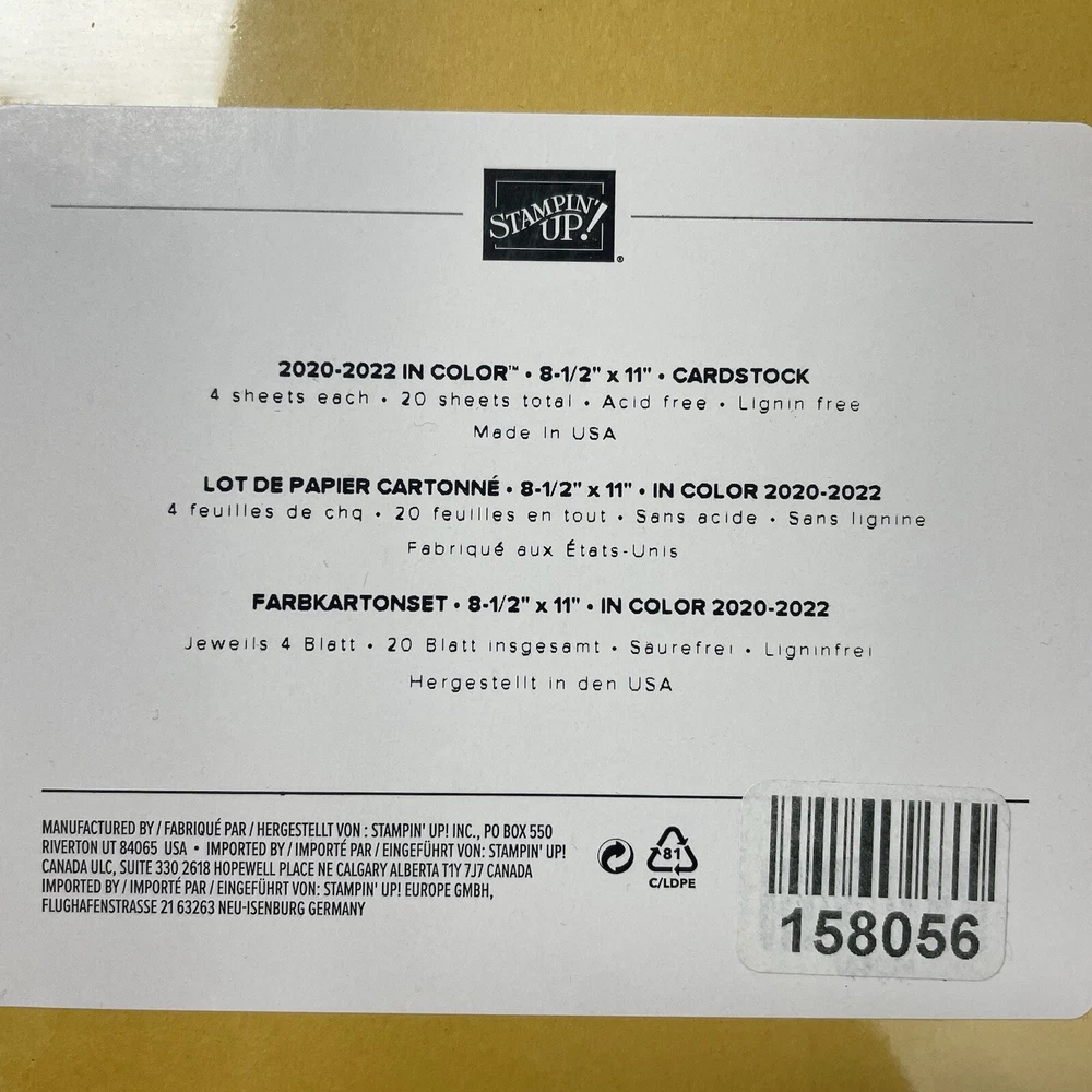 Stampin Up! Paper CARDSTOCK 8.5 x 11 IN COLOR 2020-2022 & 5 PACKS Square Gems Listing includes: One (1) New Sealed Package of 2020-2022 In Color Cardstock (8.5x11) Multipack - 4 sheets each color Five (5) New Sealed Packages of 2020-2022 In Color Square Gems EXCLUSIVE STAMPIN' UP! Colors: Cinnamon Cider Just Jade Bumble Bee Magenta Madness Misty Moonlight Looking for more Stampin' Up! products? Check out my other listings for some great finds and better deals SKU: PC051176-0128, 0129