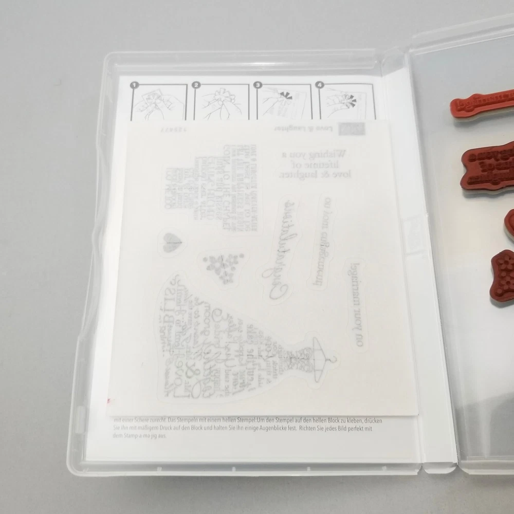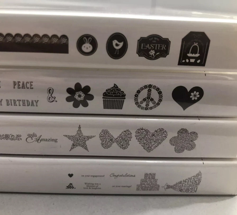 Included in Lot #5 are 4 stamp sets by Stampin Up. There are a mix of a new & used sets. Please see the pictures for details if the set is cling / photopolymer / new / used / etc. The sets are: 1. Floral Fillers 2. Eggcoutrements 3. Love & Laughter 4. Peace, Love, & Cupcakes I am selling several lots like this. I inherited many sets that have been in storage. Some of the stamp cases may be slightly discolored. If you have any questions, please let me know! - Catherine