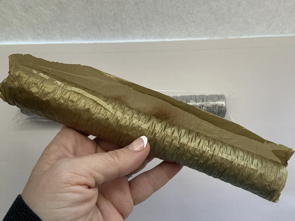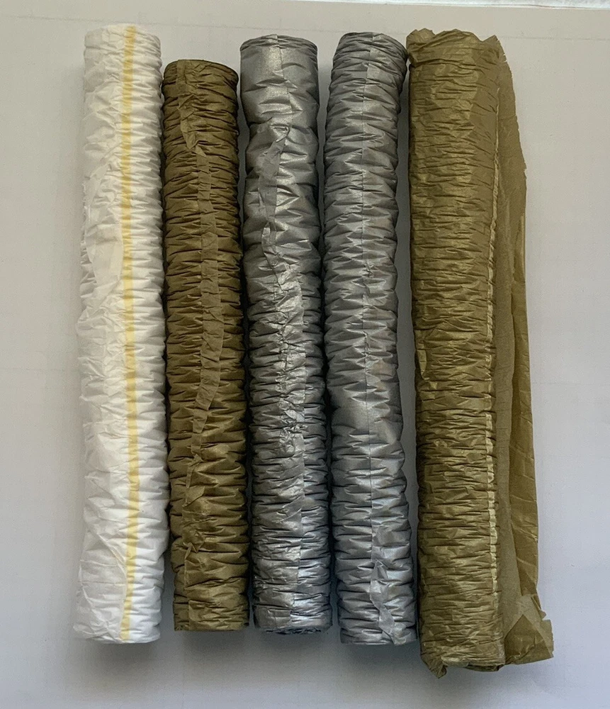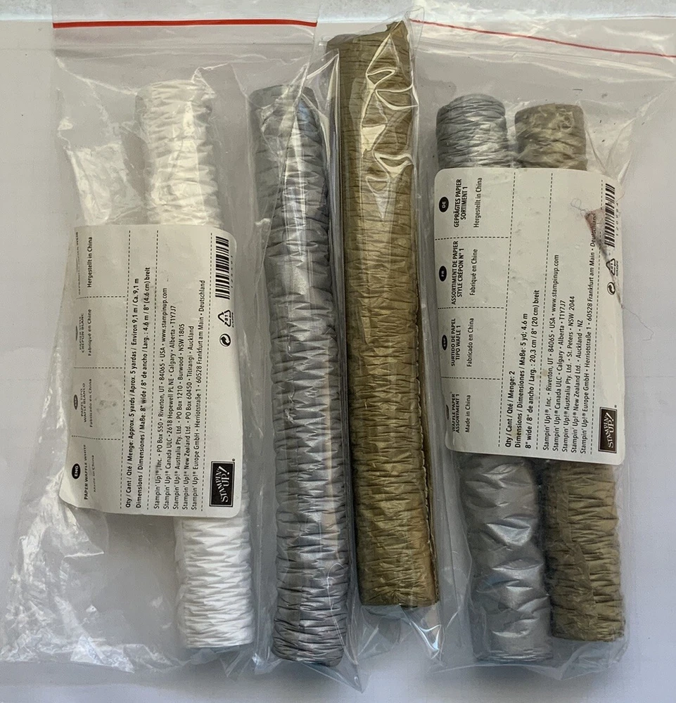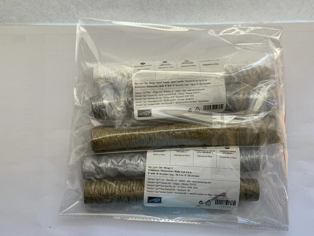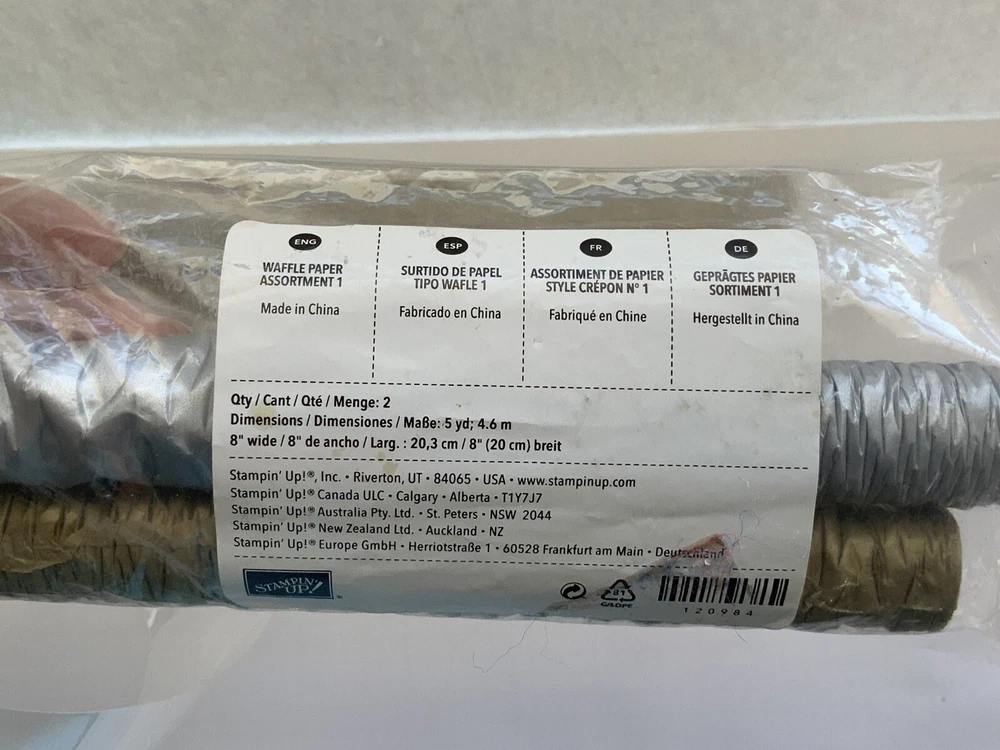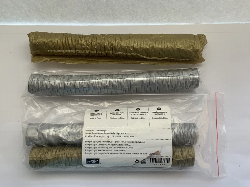 Unused but one roll has came unglued. packages have been opened. One gold and one Silver are not in the original packaging. Use Waffle Paper to create ruffles behind your stamped images, use strips like ribbon, tie bows or crumble and layer on a card. Each roll is 8 inches wide and approximately 5 yards long. Waffle paper is similar to a heavy glossy tissue paper feel. White is plain, gold and silver are metallic.