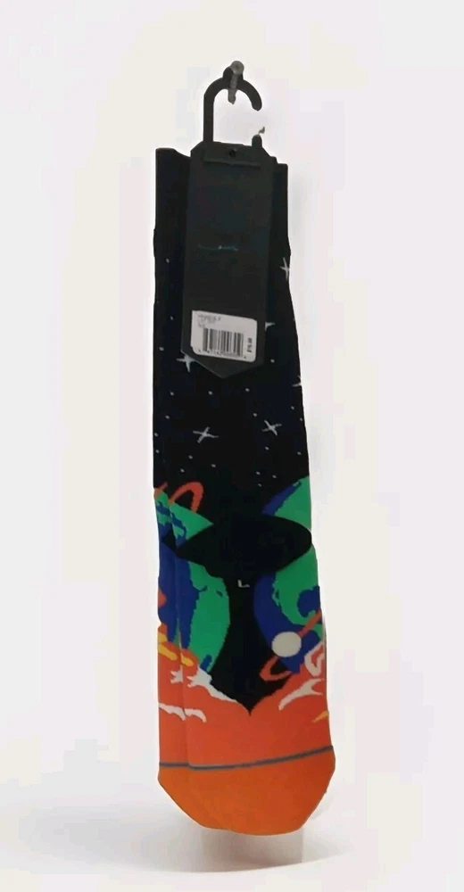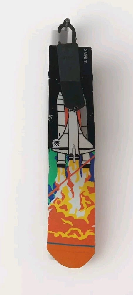These Stance crew socks in size L feature a rocket design, perfect for space enthusiasts. Made of nylon, spandex, and cotton, they provide premium support with a full toe style. The colorful design adds a fun touch to any outfit.