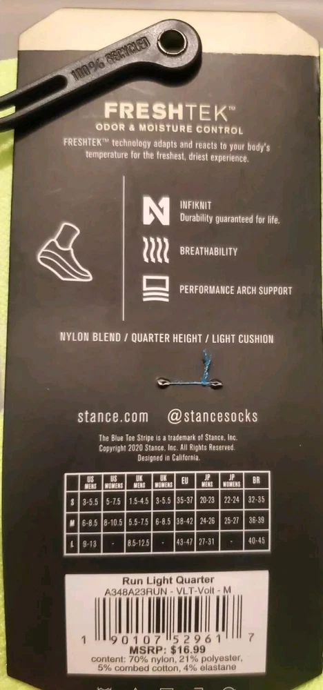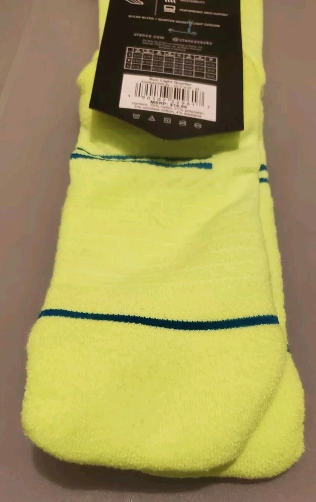 Elevate your sock game with these Stance Run Light Quarter Ankle Socks in Volt Blue. Designed for performance, these socks feature arch support, cushioning, and moisture-wicking technology to keep your feet comfortable and dry during any activity. The mid-calf length and lightweight construction make them perfect for all seasons, whether you're hitting the gym, going for a run, or just running errands. Made from a blend of polyester, nylon, combed cotton, and elastane, these socks are machine washable and easy to care for. They come in a size medium (6-8.5) and are perfect for men who want to add a touch of style to their wardrobe. With their solid pattern and green color, these socks are versatile enough to wear with any outfit. Pictures are of actual socks. Brand new never worn and no defects. Feel free to contact me with any questions.
