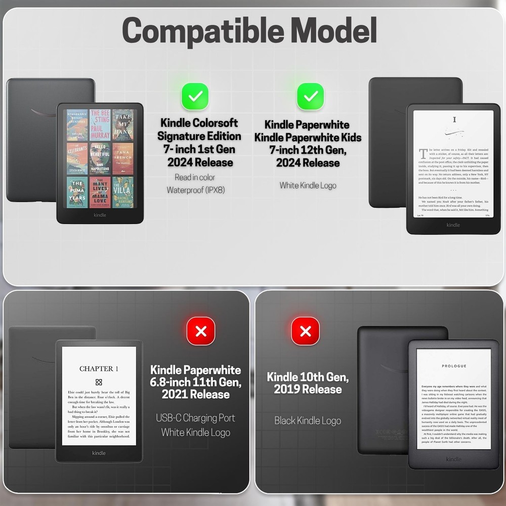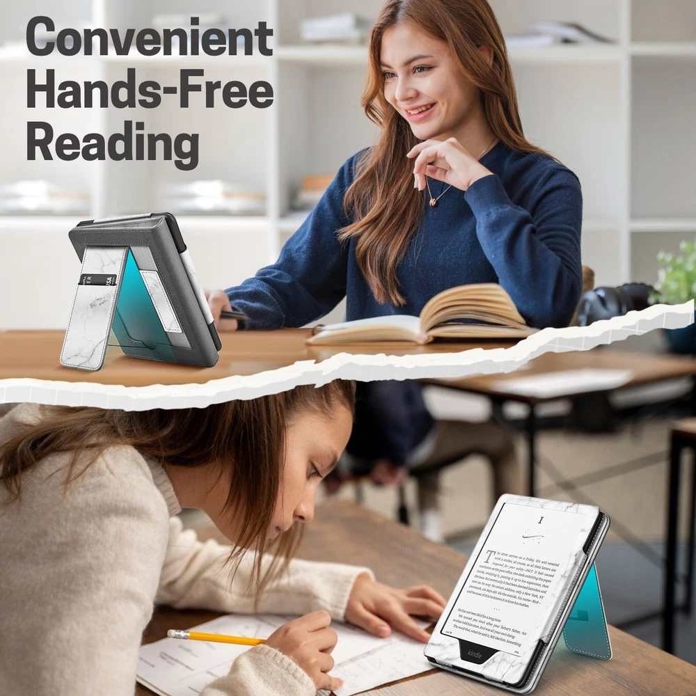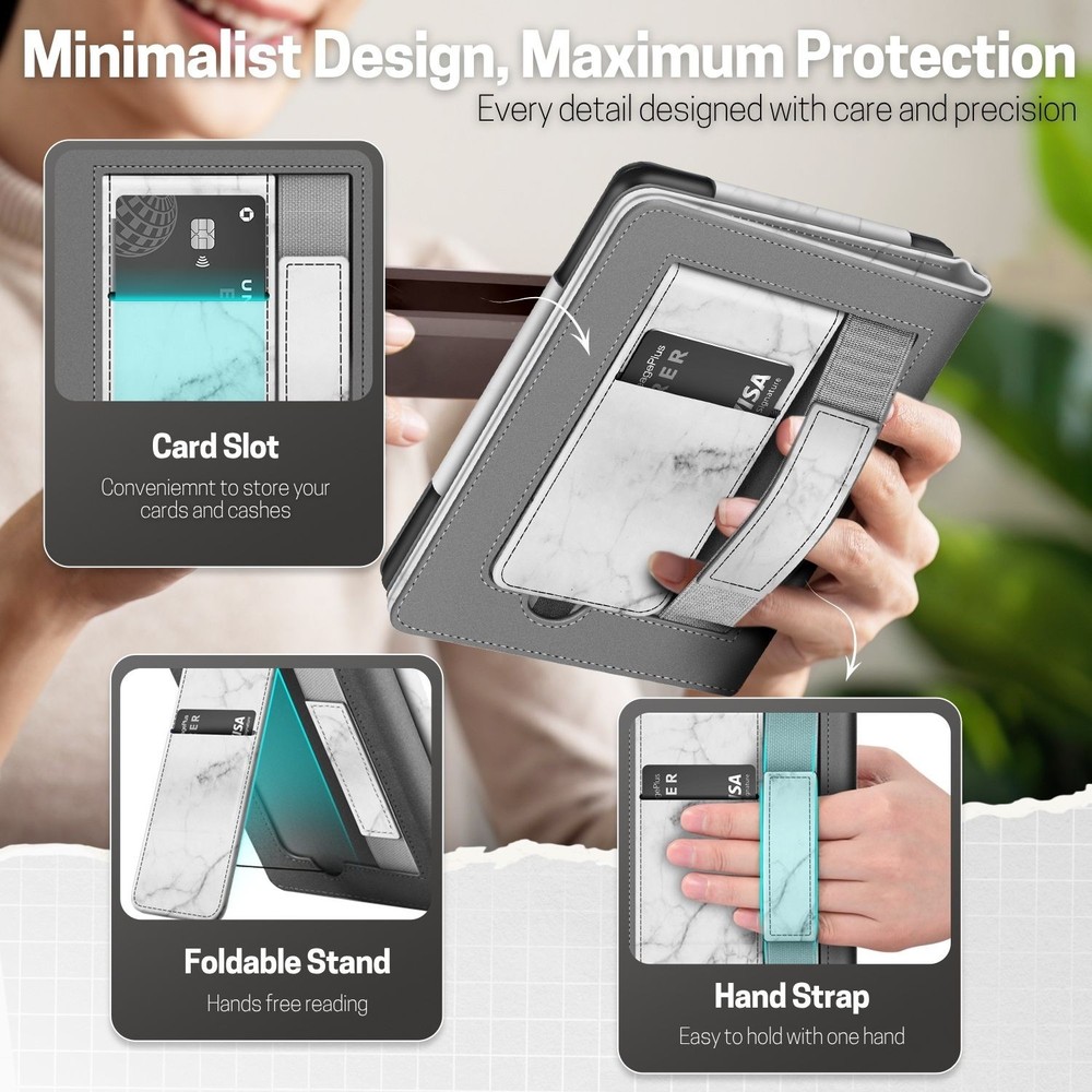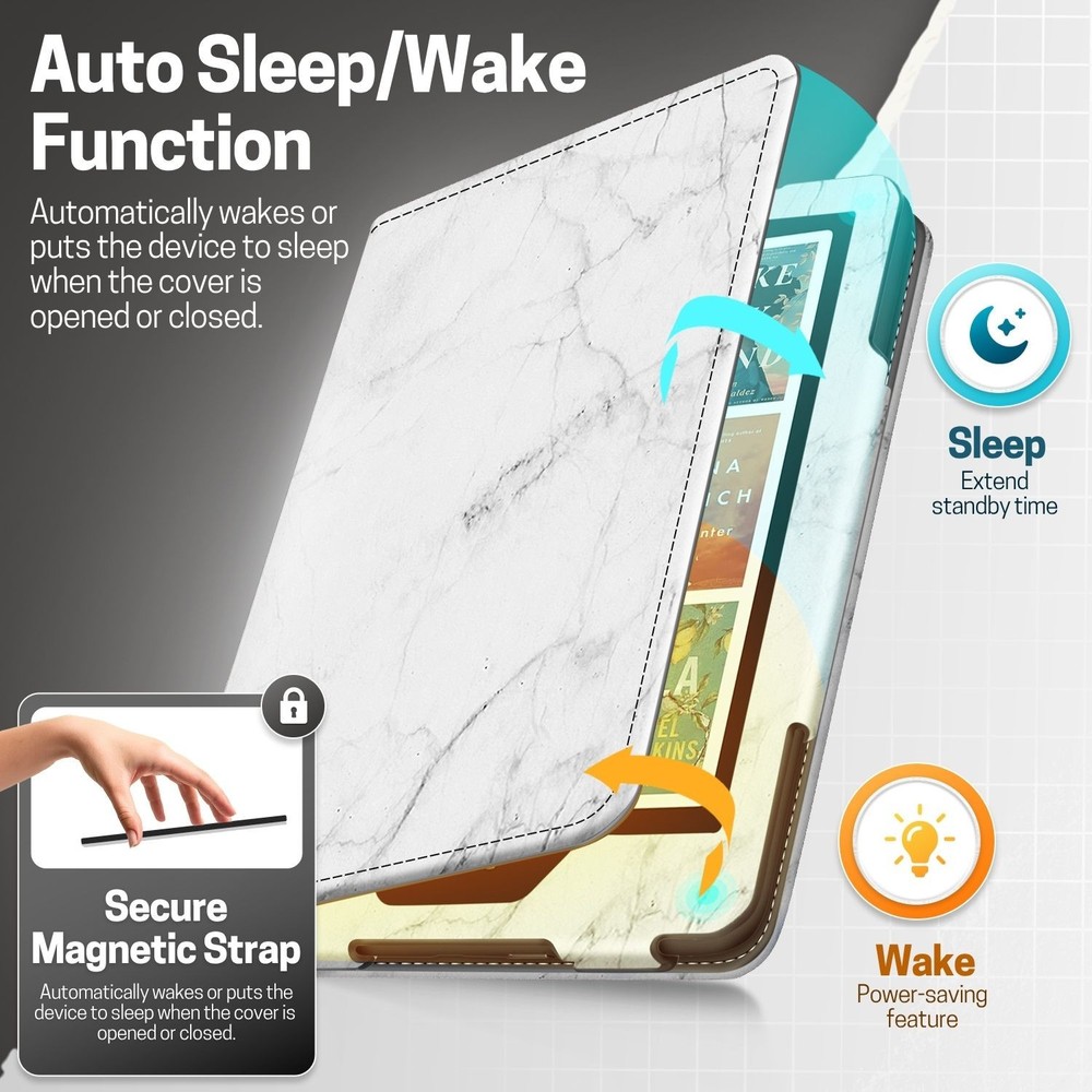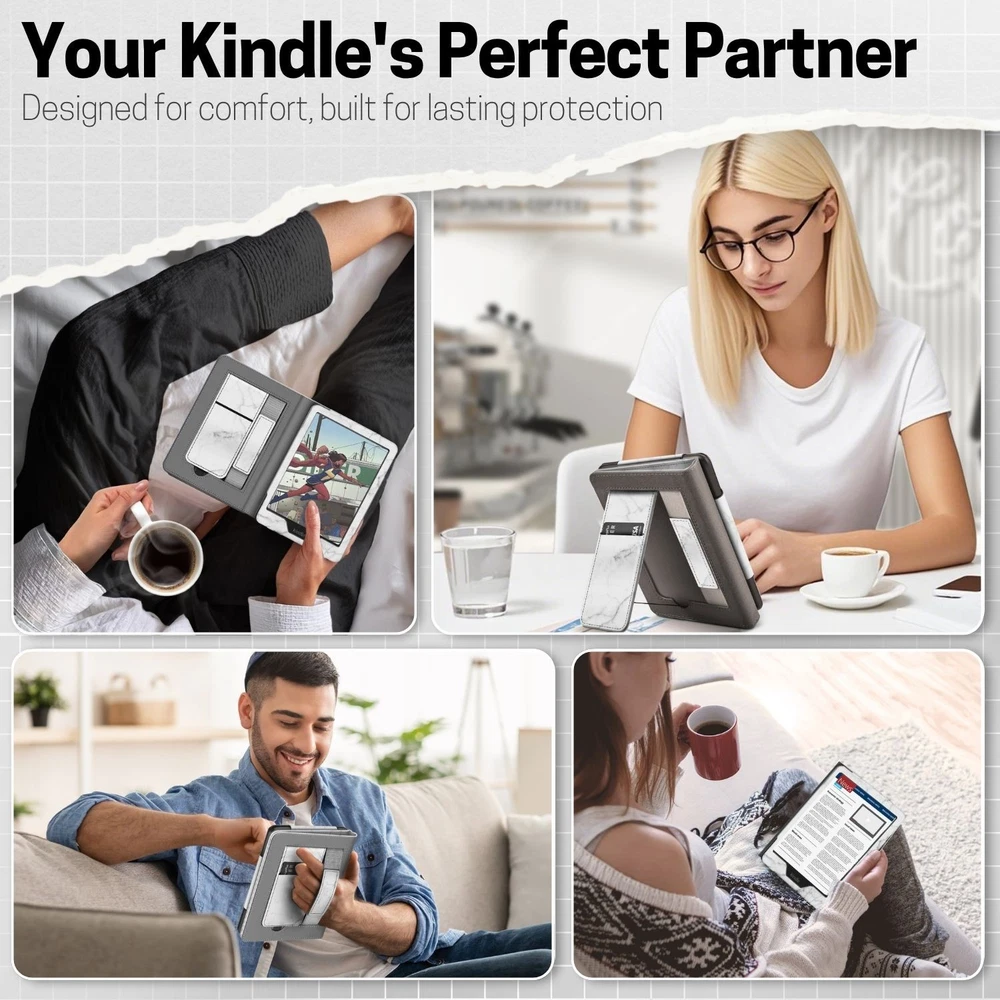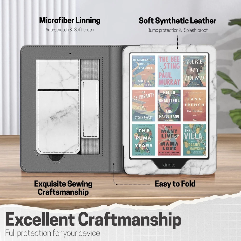 TNP Stand Case for Kindle Paperwhite 12th Generation 2024 / Kindle Colorsoft Signature Edition with Hand Strap & Card Slot - 7" PU Leather Protective Folio Cover with Auto Wake/Sleep, Marble White TNP Stand Case for Kindle Paperwhite 12th Generation 2024 / Kindle Colorsoft Signature Edition with Hand Strap & Card Slot - 7" PU Leather Protective Folio Cover with Auto Wake/Sleep, Marble White Introduction: Slim, form-fitting cover designed for Kindle Paperwhite (12th Generation) and Kindle Paperwhite Signature Edition, providing entire front and back protection. The cover securely attaches and removes easily, folding back for one-handed reading with a built-in hand strap for a more comfortable grip and added security. Designed for convenience, the foldable stand lets you enjoy hands-free reading by propping up your device at the perfect angle. The auto sleep/wake function ensures seamless use for Kindle Paperwhite case 12th generation that automatically sleeps when closed and wakes when opened so you can jump right back into your book. This lightweight case is made from durable synthetic leather. Its soft nylon-woven interior shields your Kindle from scratches and scuffs without adding bulk, making it effortless to hold for hours of reading. This case keeps your Kindle protected, clean, and ready for your next adventure, whether at home or on the go. Feature: Designed specifically cover for Kindle Paperwhite 7-inch display 2024, compatible with Kindle Colorsoft Signature Edition (1st Generation), Amazon 7" Kindle Paperwhite, and Kindle Paperwhite Kids (12th Generation, 2024 Release), not compatible with other models Foldable Stand with Built-In Card Slot: Enjoy hands-free reading for Kindle Paperwhite 2024 case with the built-in stand, which folds into a convenient viewing position. The integrated card slot lets you store essential cards or cash, making it a perfect travel companion Comfortable Hand Strap for One-Handed Reading: The interior hand strap offers a secure grip, making it easier for Kindle Paperwhite Gen 12 case to be held comfortably with one hand while preventing accidental slips Auto Sleep/Wake with Magnetic Clasp: The smart magnetic cover automatically wakes your Kindle Paperwhite when opened and puts it to sleep when closed. A secure magnetic clasp for the Kindle Paperwhite 2024 cover keeps the cover firmly shut, protecting your device while ensuring easy access Slim, Lightweight, & Protective: Designed with premium synthetic leather and a soft microfiber interior for Kindle Paperwhite 12th generation case, this ultra-slim case offers lightweight protection against scuffs, scratches, and everyday wear while maintaining a sleek profile Specification: Material: PC Case / PU Leather / Microfiber Lining Note: Case is ONLY compatible with the 7" Amazon Kindle Paperwhite (12th Generation), Kindle Colorsoft Signature Edition (1st Generation), and Kindle Paperwhite Kids (12th Generation) - 2024 release Package Content: 1x Stand Case for Kindle Paperwhite 12th Generation 2024 / Kindle Colorsoft Signature Edition with Hand Strap & Card Slot - 7" PU Leather Protective Folio Cover with Auto Wake/Sleep, Marble White
