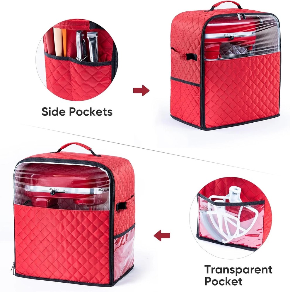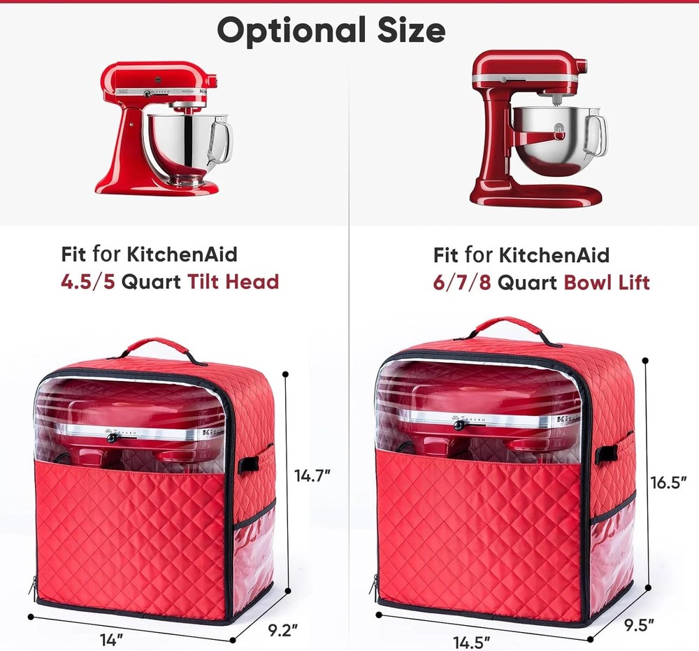 Item Package Quantity 1 Style Modern Color Red Pattern Solid Material Nylon Batteries Required? No Item Weight 1.04 pounds Batteries Included? No Size Fit for 5/4.5 Quart Package Dimensions 12.83 x 8.43 x 2.91 inches 【Move Your Mixer With Ease 】 - The dust cover comes with a mixer slider mat sewed into the bottom. I often use the mixer, but it is quite heavy for me to move. The kitchen appliance slider on the base is specially designed to help easily move the heavy kitchen mixer. (Patent Pending) 【 Encased The Whole Mixer 】 - This mixer storage bag can encase the entire mixer, unlike covers without a bottom. It keeps away ants and dust completely. I used a cover without a bottom before, but I was still worried about insects getting inside it, which is why I made this mixer dust cover with the bottom (Cover only, mixer NOT included). 【 CONSIDERATE DESIGN 】 - Multiple pockets are great for kitchen accessories and attachments. The classic and stylish design gives a modern and stylish accent to your kitchen. 【 WELL MADE & QUALITY MATERIAL 】 - Made of water-resistant, quilted nylon that easily wipes away with a damp cloth. It can protect your favorite mixer from scratches, damage, or collecting dust when it's not in use. [ Compatibility ] -Comes in 2 sizes and various colors. The small one is compatible with KitchenAid 5/4.5 QUART TILT-HEAD mixers, and the large size is compatible with KitchenAid 6/7/8 quart Bo