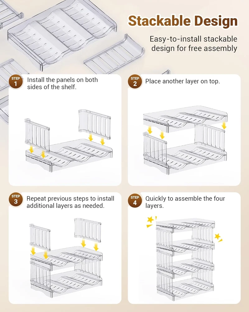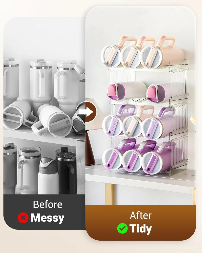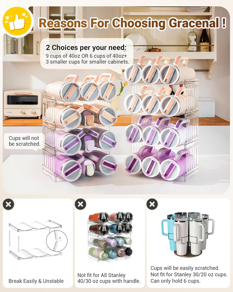 LARGE CAPACITY: Each compartment grid of our Gracenal water bottle organizer for stanley cup accessories is 4.35" in diameter and height, perfectly fitting up to 40oz water bottles like Stanley 40 oz tumbler with handle, Yeti water bottles, Owala water bottle, Starbucks cups, Cirkul water bottle, Gatorade water bottle, Thermoflask, and etc. Each shelf holds 3 bottles, with side ridges to prevent rolling and provide individual spaces for easy access. The size of this water bottle holder is 12.6" x 7.9" x 11.5", ensuring that it fits perfectly in your desired space. STACKABLE DESIGN AND STURDY CONSTRUCTION: Perfect kitchen organizers and storage, easy to assemble. You can customize and assemble according to your needs in seconds, no tools required. The pantry organization is made from high-quality shatterproof PET material with 2 thick transparent plastic support panels per layer, ensuring stability and preventing wobbling or cracking. US Patent: D1026508- S. VERSATILE ORGANIZATION AND STORAGE: Say goodbye to cluttered cabinets and fridges. Store and organize your water bottles, travel mugs, coffee cups, insulated tumblers, sports flasks, shaker bottles, baby bottles, straw cups, drinks, and more with the kitchen storage. You can't miss the useful kitchen utensils and kitchen gadgets and accessories 2024. EASY TO CLEAN: Simply wash with mild soap and water for hassle-free cleaning. Please note that the kitchen organization is NOT dishwasher safe. Made from high-quality, BPA-free plastic, this water bottle storage is safe for storing food and beverages. It is also fridge safe, keeping your drinks cool and refreshing. AESTHETIC PLEASURE AND GREAT GIFT IDEA: The sleek and transparent plastic design seamlessly blends with any kitchen decor, adding a touch of elegance to your space. Perfect pantry organizers and storage for kitchen, cabinet, pantry, fridge, countertop, dining room, and closet, and etc. Also great as a wine rack, champagne rack, makeup bottles organizer, or for limited storage spaces like apartments, RVs, and cabins. Perfect house essentials for new home gifts. Dorm and apartment must haves 2024. BUY WITH CONFIDENCE: Maximize your storage space and keep your kitchen or storage areas tidy with Gracenal storage and organization. Gracenal bottle organizer is easy to use and durable, but if you are not satisfied with it, please feel free to contact us. Say goodbye to clutter and hello to convenience and style. Please note that the top layer can hold 3 40oz water bottles with handles, and the remaining layers can only hold 2 40oz water bottles with handles and one without handle. Product Description Large Compartment Organization and Storage Please note that the top layer of Original Style can hold 3 40oz water bottles with handles, and the remaining layers can only hold 2 40oz water bottles with handles and one without handle. Larger Style can hold ALL 40oz water bottles with handles. Ideal Kitchen Organizers and Storage The video showcases the product in use. The video guides you through product setup. The video compares multiple products. The video shows the product being unpacked. Water Bottle Organizer Bottle Organizer Wine Rack Drink Organizer 1 Kitchen Countertop 2 Cabinet 3 Countertop 4 Fridge Recommended to You from Gracenal Add to Cart Add to Cart Add to Cart Customer Reviews 4.5 out of 5 stars 1,067 4.5 out of 5 stars 138 4.2 out of 5 stars 1,369 4.3 out of 5 stars 970 4.3 out of 5 stars 58 4.9 out of 5 stars 61 4.8 out of 5 stars 73 Price $26.99 $ 26 . 99 $15.99 $ 15 . 99 $17.99 $ 17 . 99 $18.99 $ 18 . 99 $12.99 $ 12 . 99 $9.99 $ 9 . 99 $75.99 $ 75 . 99 Material PET Acrylic Acrylic Silicone, Polycarbonate Acrylic Silicone Silicone Material Type Free BPA Free BPA Free BPA Free BPA Free BPA Free BPA Free BPA Free Color Clear Clear Clear Clear&Grey Transparency White/ Pink/ Purple/ Black White Quantity 4 Packs 1 Lid Organizer 1 Board 1 Cover Hat Rack for Wall*2 8 Spill Stoppers + 1 Gift Box Warming mat*2 Function Kitchen Organizers and Storage Lid Organizers Inside Cabinet Countertop Protection Upgraded Handle Better Protect Hat/Towel/Coat Oragnization Cup Leak Stoppers & Protector Warming food