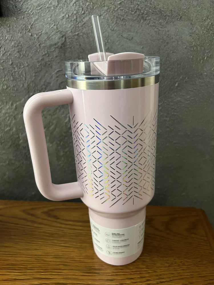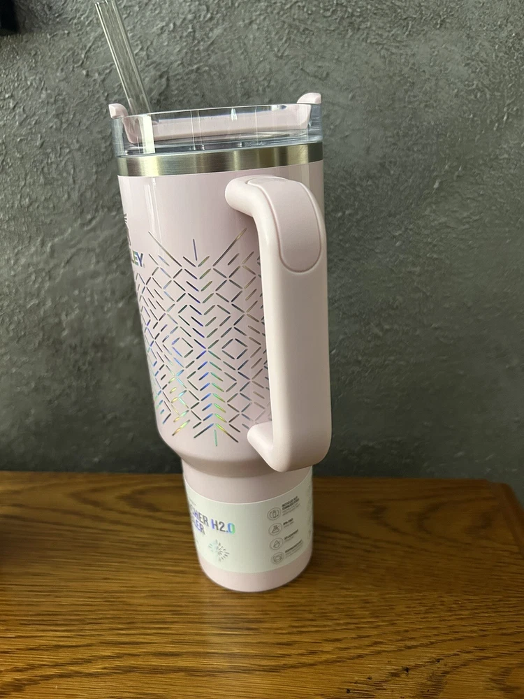 Introducing the Stanley 40oz Quencher Icicle Gloss Winter Wonderland tumbler, perfect for your hot or cold beverage needs. This tumbler is made of stainless steel, steel, and BPA-Free plastic, ensuring your drinks stay safe and clean. With a capacity of 1 liter, this tumbler is great for teens, boys, girls, and adults. It comes with a handle, lid, and straw, making it easy to carry around and sip on your favorite beverage. The tumbler is machine washable up to 85°F, making it easy to clean and maintain. It features a solid color pattern in the color Icicle Gloss, with a theme of Bottle, Holiday, Food/Kitchen, Food & Drink, Butterflies, and Novelty. This tumbler is suitable for hot beverages and is insulated to keep your drinks cold for up to 11 hours. Get your hands on this tumbler today and enjoy your drinks in style!