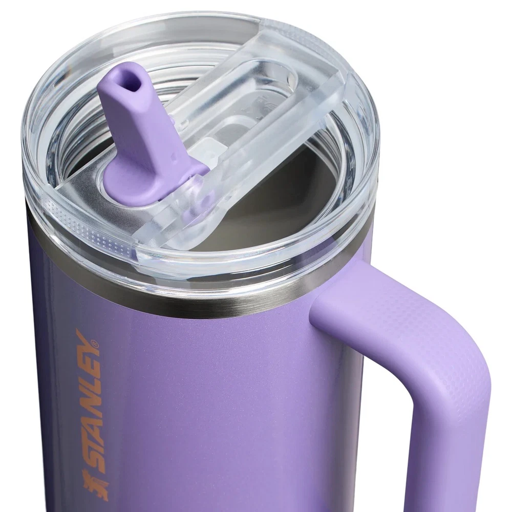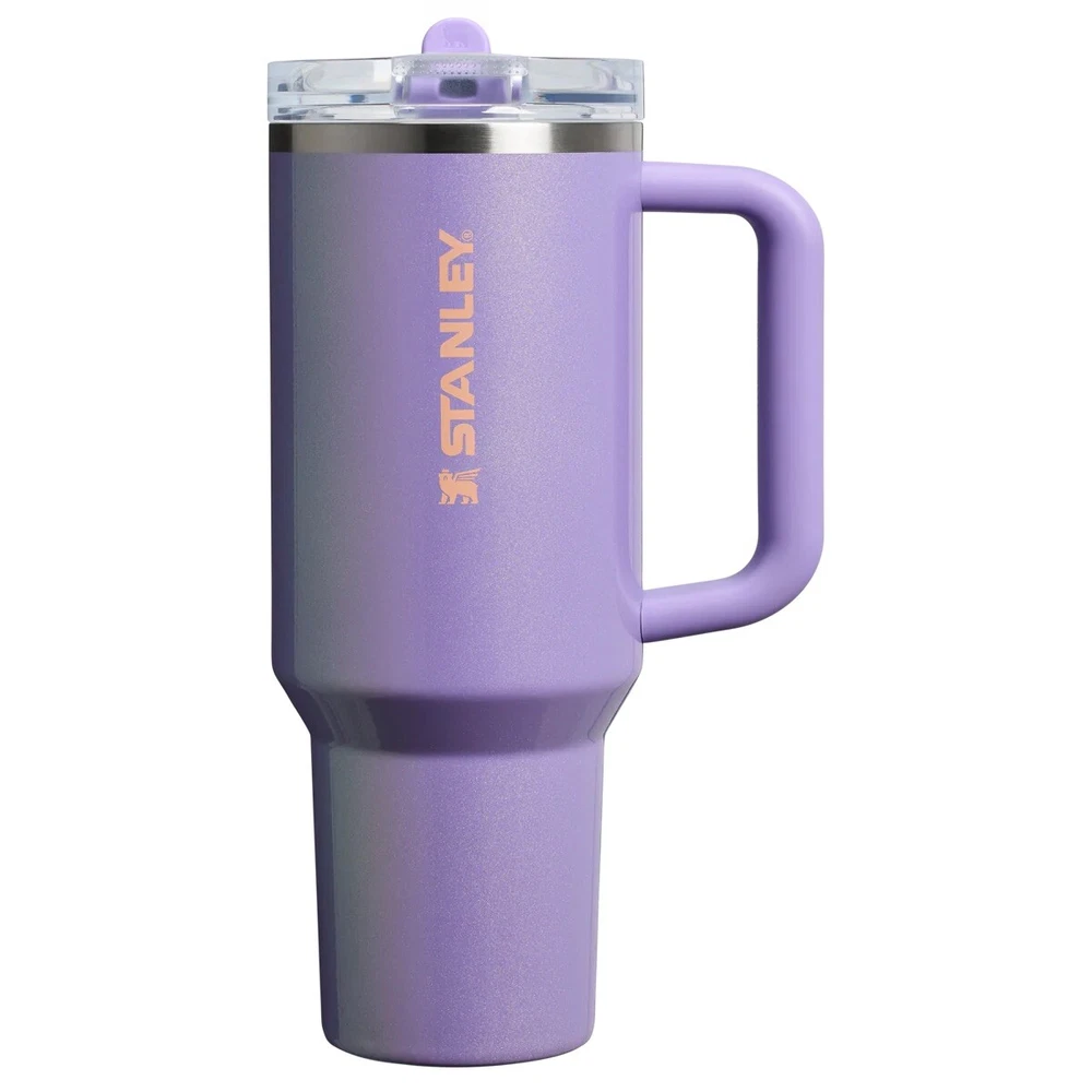 PRESALE The Stanley 40 oz. Quencher H2.0 Frequency Collection in Periwinkle Shimmer is a stainless steel tumbler designed for both hot and cold beverages. It features a solid color design with a drink-through lid, keeping drinks cold for up to 11 hours and hot for up to 7 hours. This limited edition tumbler is equipped with a handle, lid, and straw, making it suitable for various activities and suitable for both teens, boys, girls, and adults. Its 40 oz capacity and insulated material ensure that your beverages stay at the desired temperature for a long time.