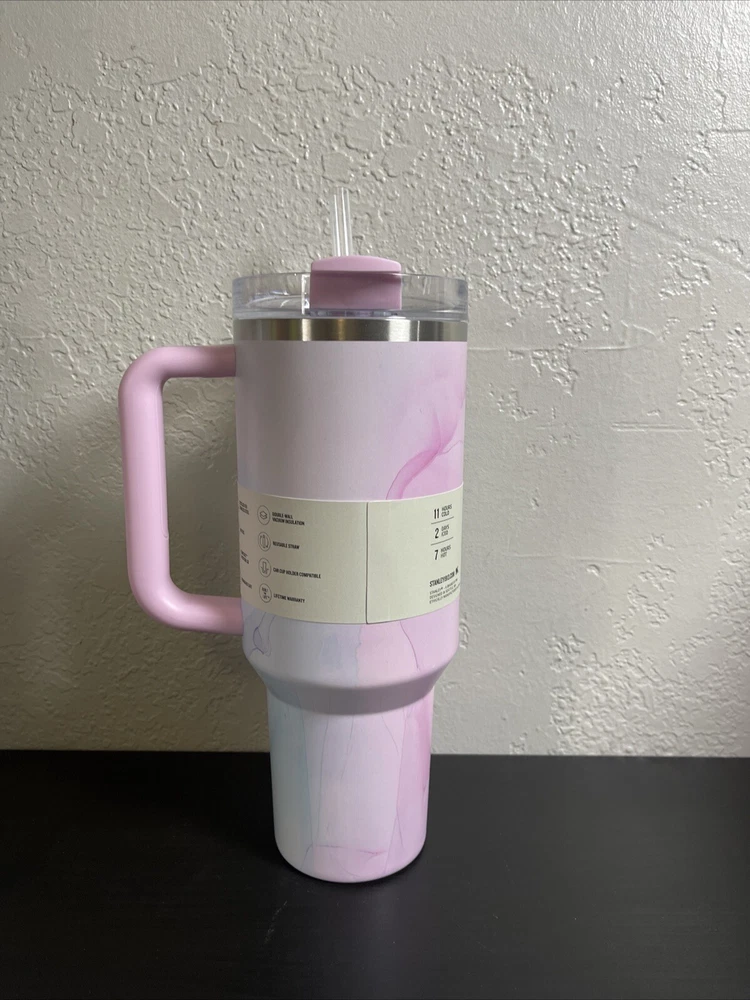 Introducing the Stanley 40 oz WATERCOLOR TULLE PINK Stainless Steel H2.0 Flowstate Tumbler Cup, a perfect addition to your collection. This three-piece tumbler set is designed to keep your beverages hot or cold for a longer period of time. The tumbler is made of high-quality stainless steel, plastic, steel, and BPA-free plastic material, making it break/chip resistant and suitable for hot beverages. With a drink-through lid, this tumbler set comes with a handle and a straw for convenience. It is decorated with a beautiful dusk pattern and is perfect for sports enthusiasts. The tumbler set is insulated and has a capacity of 40 oz, making it perfect for your daily commute or outdoor activities.