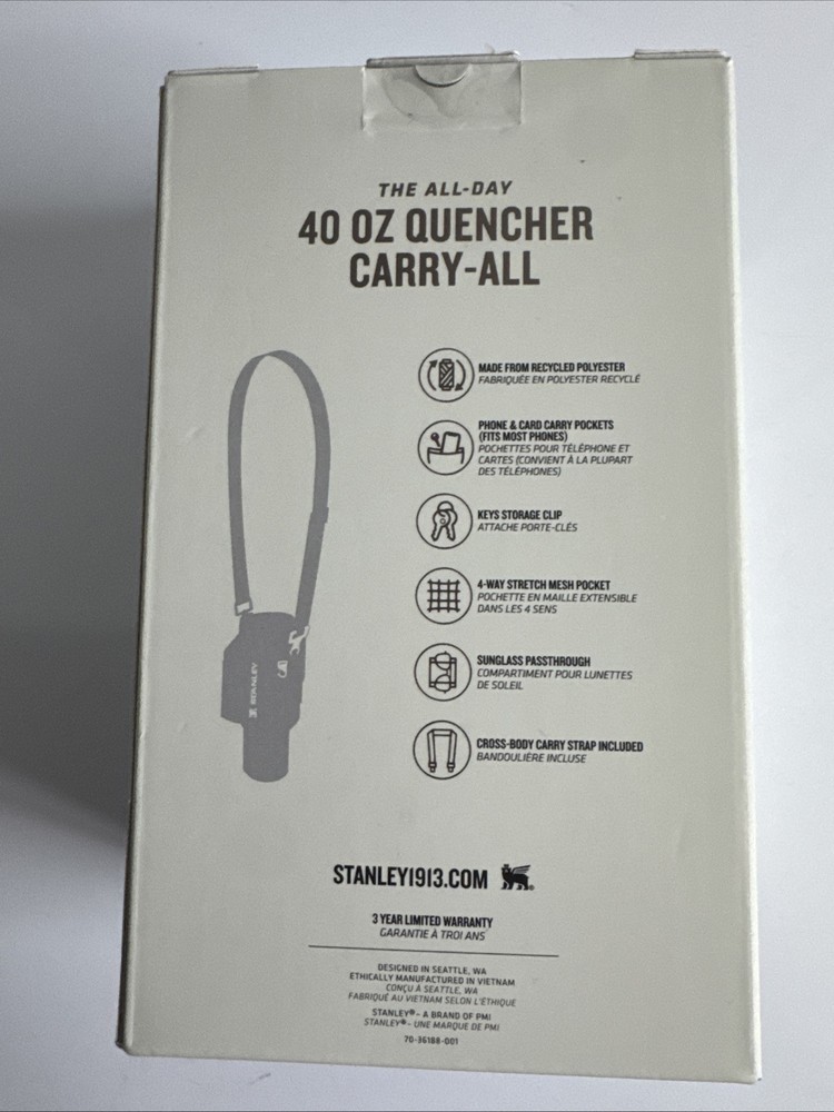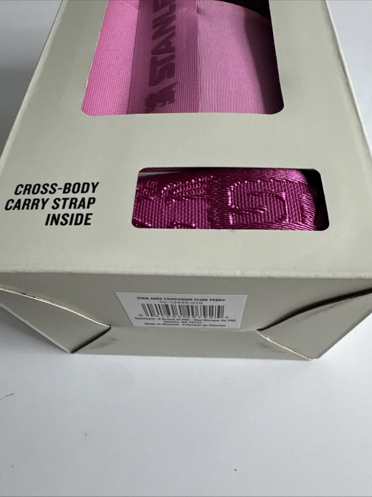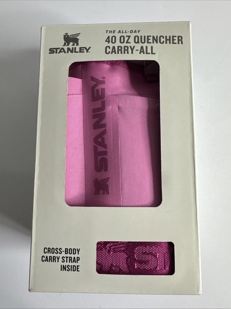 Introducing the Stanley The All Day 40 oz Quencher Carry-All Peony Pink Cross Body New, the perfect accessory for anyone who wants to keep their phone, sunglasses, and cards close while on the go. This tumbler accessory is made of 100% recycled polyester, which makes it not only stylish but also environmentally friendly. The Stanley Quencher Carry-All Companion Sling comes with a detachable crossbody strap and winged bear carabiner key clip, making it easy to carry and store your essentials. The raised logo and 4-way stretch mesh pocket add to its sleek design. This tumbler is perfect for anyone who wants to stay organized and fashionable on the go.