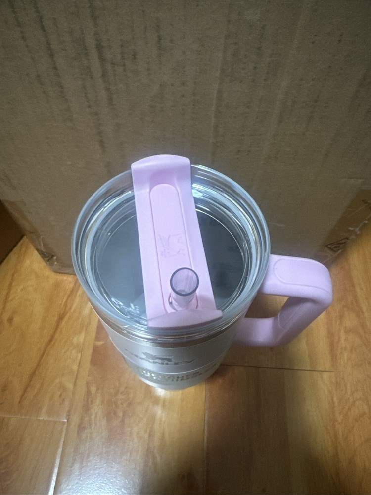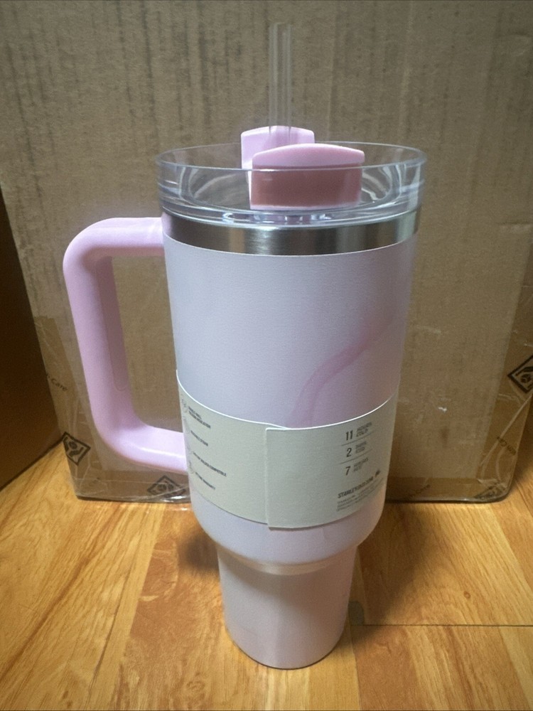 Stanley 40 oz Stainless Steel H2.0 FlowState Quencher Tumbler in Dusk pattern, with a pink color. This three-piece tumbler has a drink-through lid and keeps beverages cold for 12 hours and hot for 8 hours. Made of stainless steel, plastic, and BPA-free plastic, it is insulated, break-resistant, and suitable for hot drinks. Features include a handle, lid, straw, and it is decorated with a Sports character family design.