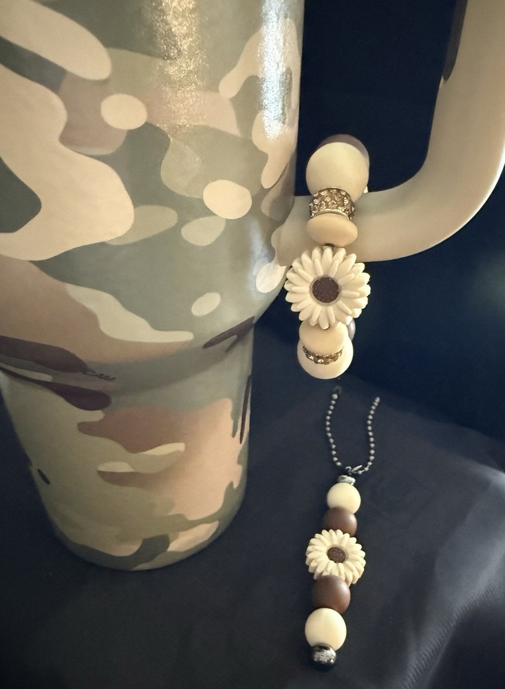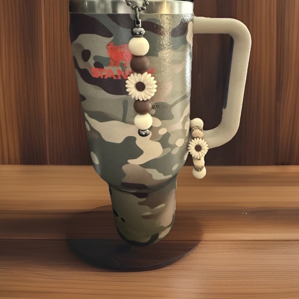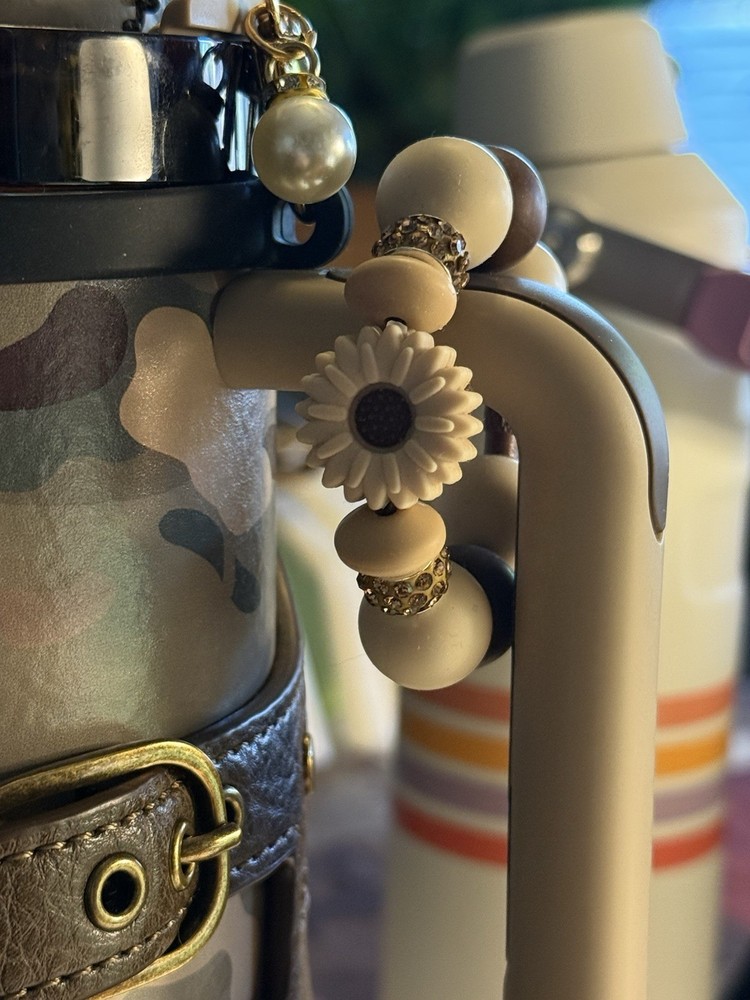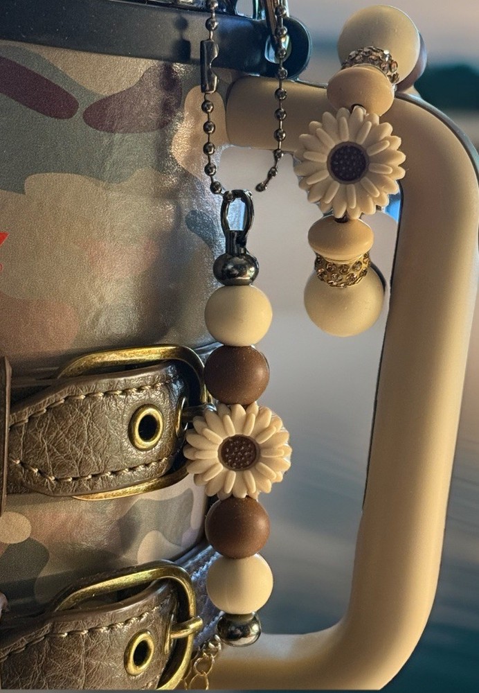 This handmade charm set for the Stanley Cup POST MALONE bracelet features a solid brown color with a floral bow theme. Made of silicone, the tumbler is suitable for both hot and cold beverages, perfect for teens, adults, kids, and girls. The set includes a straw charm and a handle for easy use. Made in the United States, this product is a stylish and unique addition to any drinkware collection. CUP NOT INCLUDED.