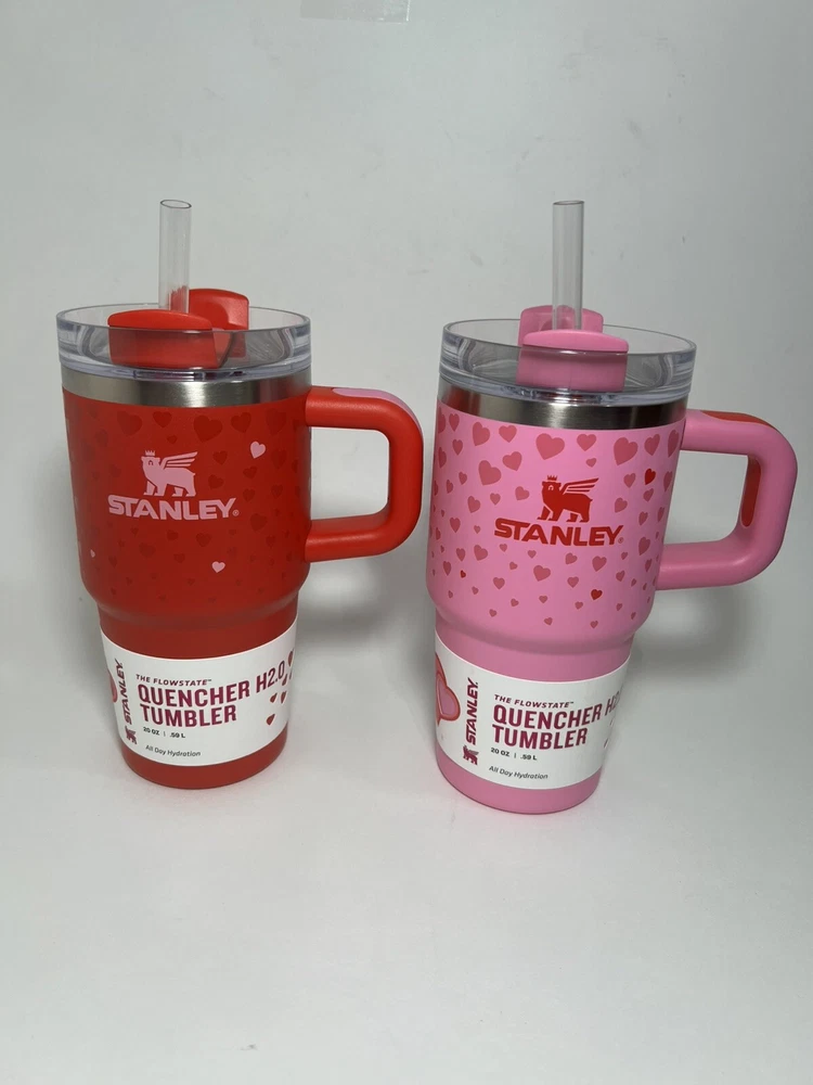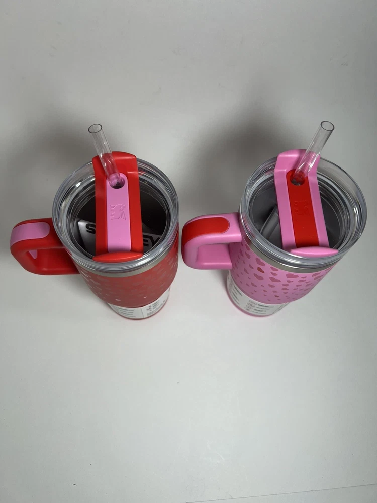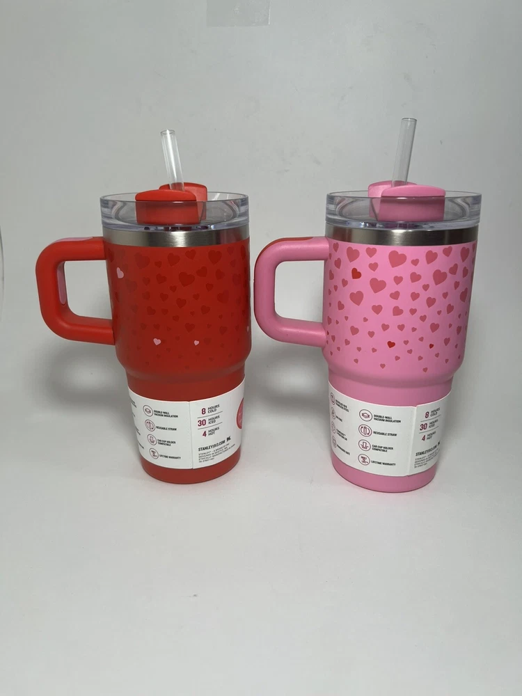 The Stanley Cup Valentine's Day 2025 20 oz Tumblers come in a 2-pack featuring a Ruby Red color with Sweet Hearts pattern, ideal for hot or cold drinks. These stainless steel tumblers are insulated, making them suitable for keeping beverages at the desired temperature. The lids are designed for easy drinking, and the tumblers also come with straws for added convenience. Perfect for teens, adults, boys, girls, and kids, this Valentine's themed set is a charming addition for anyone looking to enjoy their favorite drinks in style.