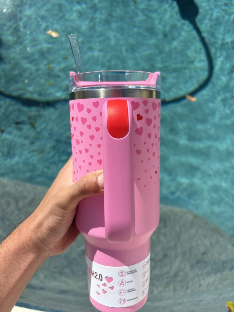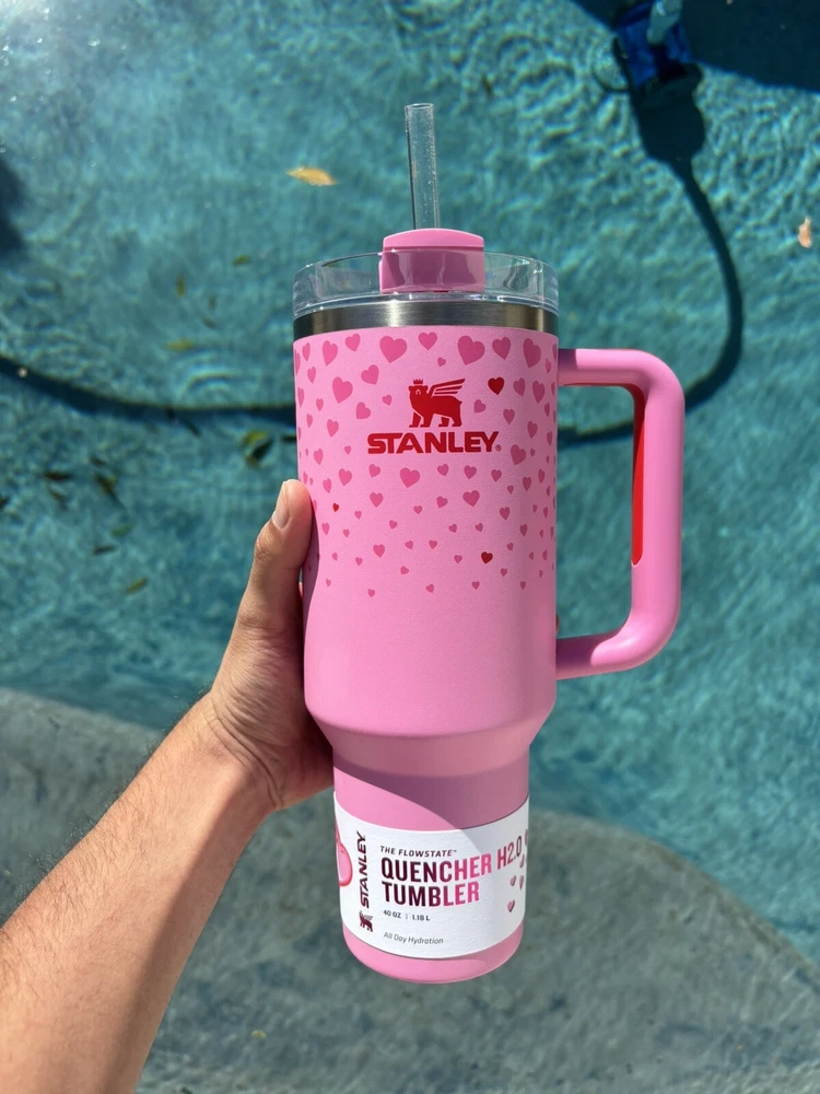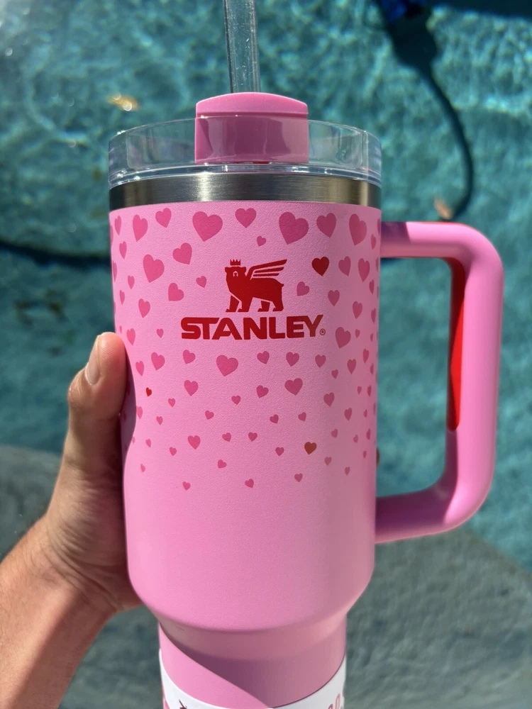 Get your hands on this limited edition Stanley Cup Valentine's Day 2025 tumbler! With a fun hearts pattern and pink color, it's perfect for both hot and cold beverages. This 40oz tumbler is made of high-quality stainless steel and steel material, and comes with a lid and straw for easy drinking. Insulated and with a drink-through lid, this tumbler is perfect for keeping your drinks at the desired temperature. Whether you're a fan of Valentine's Day or just love this fun tumbler, it's a must-have for any collection. Don't miss out on this confirmed item!