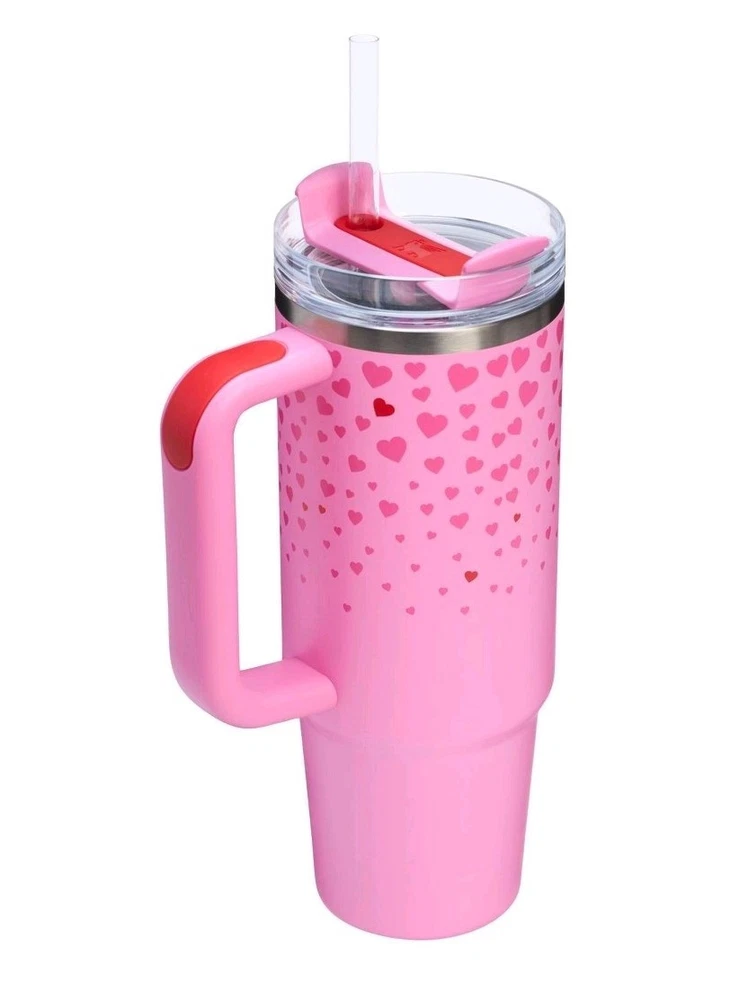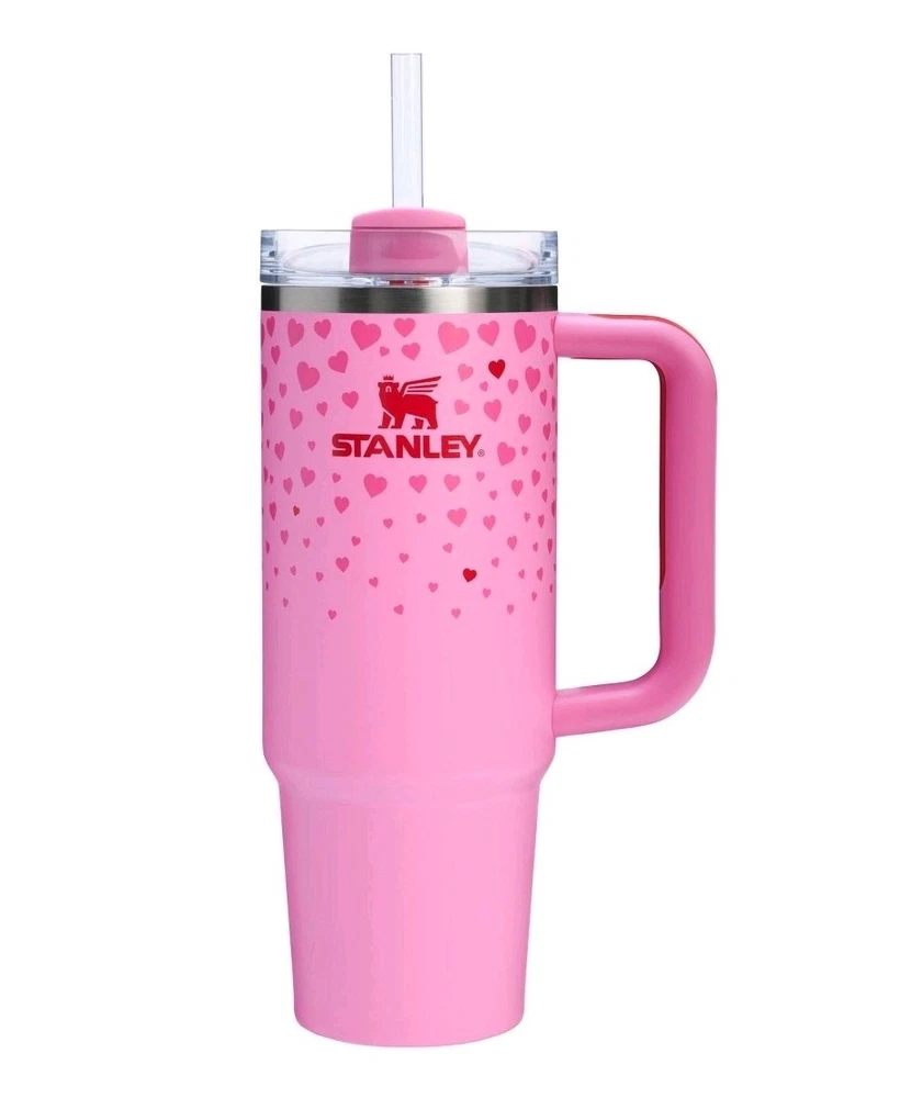 The Stanley Valentine's Day tumbler features a pink design with sweet hearts, made of stainless steel. It has a .88L capacity, H2.0 Flowstate technology for hot or cold beverages. This insulated tumbler comes with a drink-through lid, a straw, and is part of the Valentine's Day 2025 collection. Perfect for enjoying your favorite drinks on the go in style.