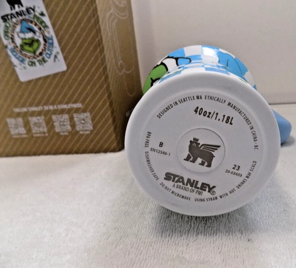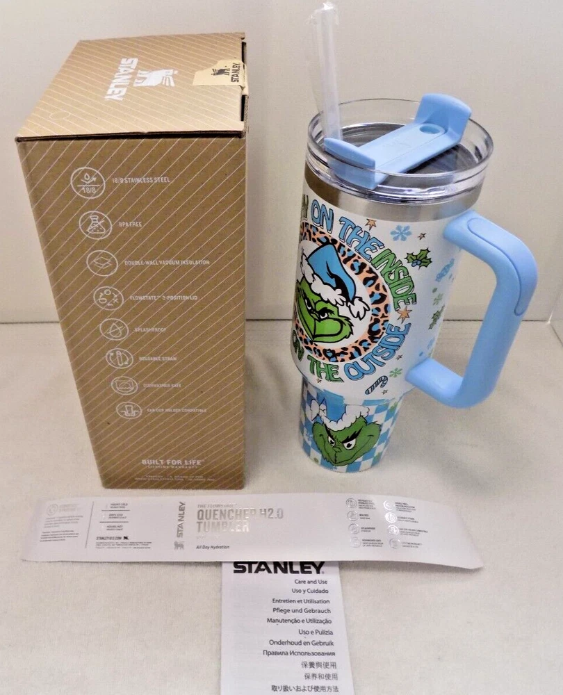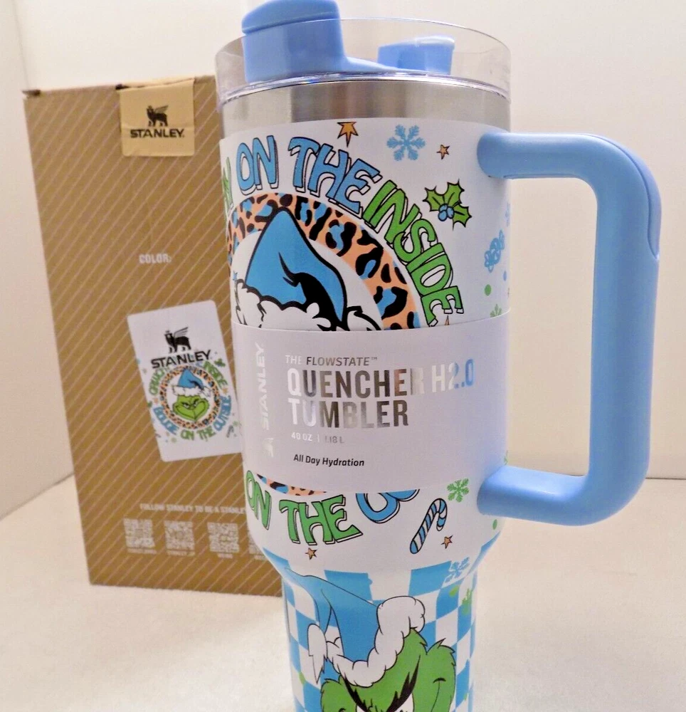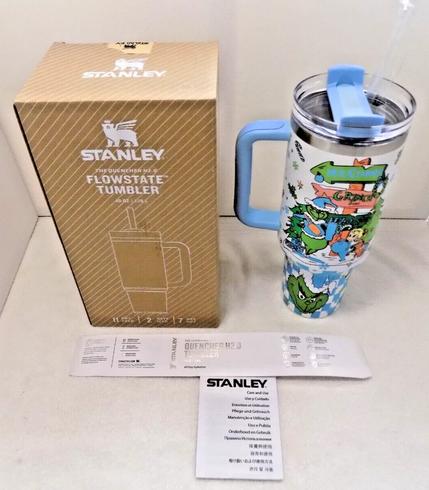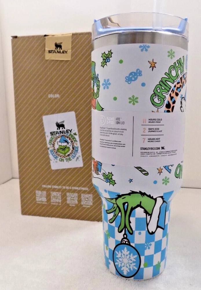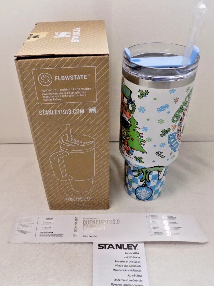 Brand new in factory box as pictured Stanley Tumbler Merry Christmas Grinchy Grinch 40 oz H2.0 Quencher Cup Hot Cold 11 hours cold 2 days iced 7 hours hot Flowstate 3 position lid. rotating cover and no splash straw Stainless steel double wall vacuum insulation Dishwasher safe Car cup holder compatible Please see pictures to make sure this product fits your needs