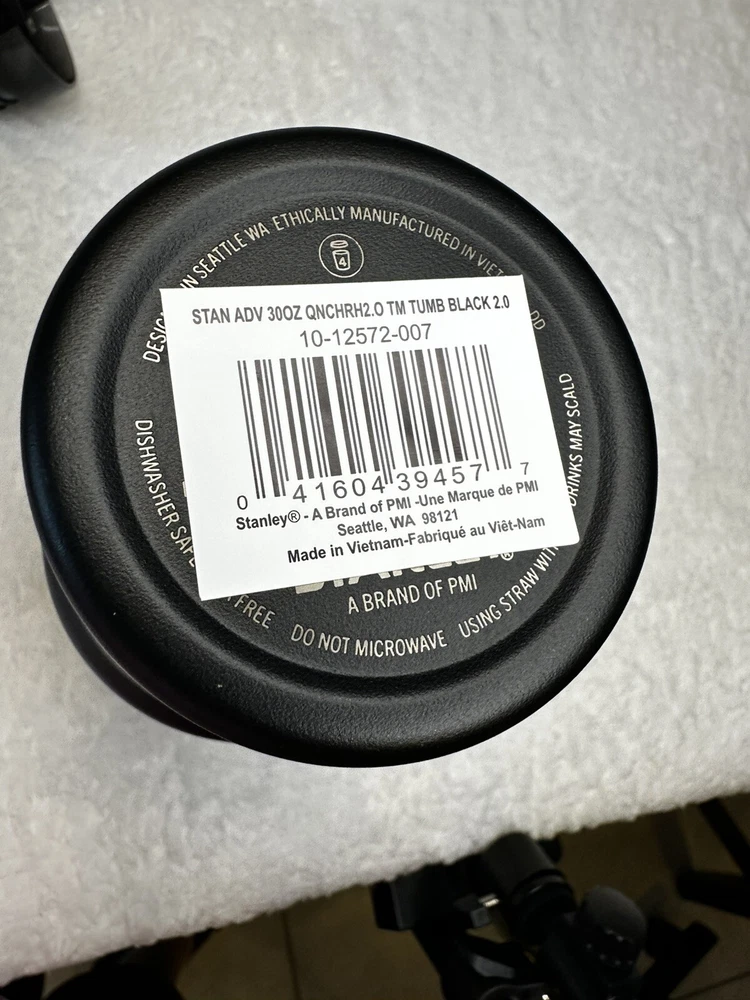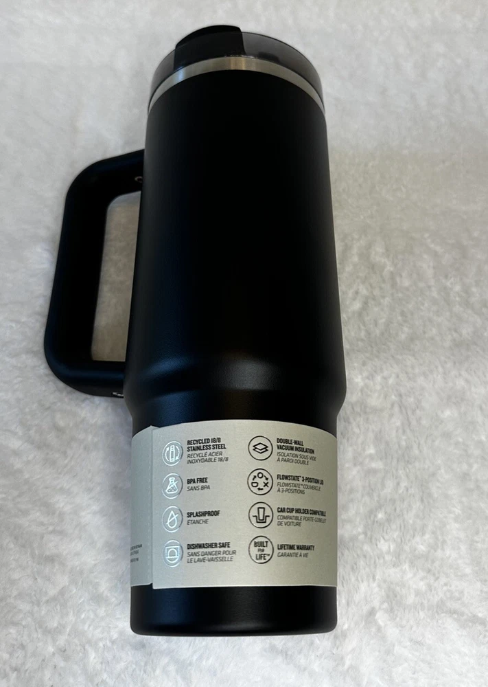 Stanley Quencher H2.0 Tumbler in Black is a 30oz insulated stainless steel tumbler with a lid and straw. It can keep drinks hot for up to 5 hours and cold for up to 9 hours. The item height is 9.5”. Ideal for use at home or on the go, this tumbler is designed for long-lasting temperature retention and convenient sipping.