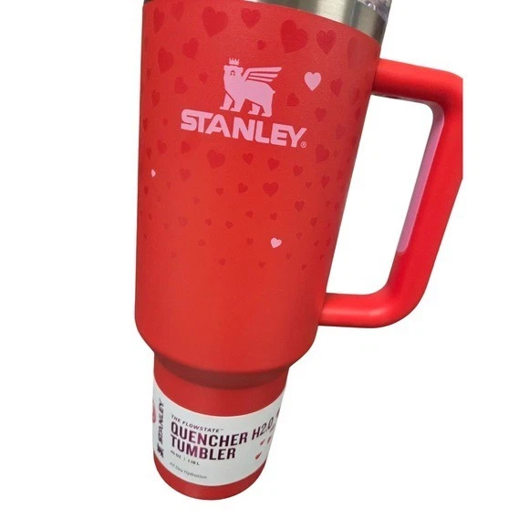 Embrace all-day hydration with this vibrant Stanley Quencher H2O Tumbler. Its cheerful red exterior adorned with a playful heart pattern makes staying refreshed a joy. The generous 40oz capacity ensures you have plenty of your favorite beverage on hand, while the included stainless steel straw offers a convenient and stylish way to sip. The durable stainless steel construction keeps drinks cold for hours, perfect for busy days at the office, outdoor adventures, or simply lounging at home. Keywords: Stanley tumbler, 40 oz, red, hearts, straw, insulated, travel mug, Valentine's Day, gift idea, hydration, reusable, stainless steel
