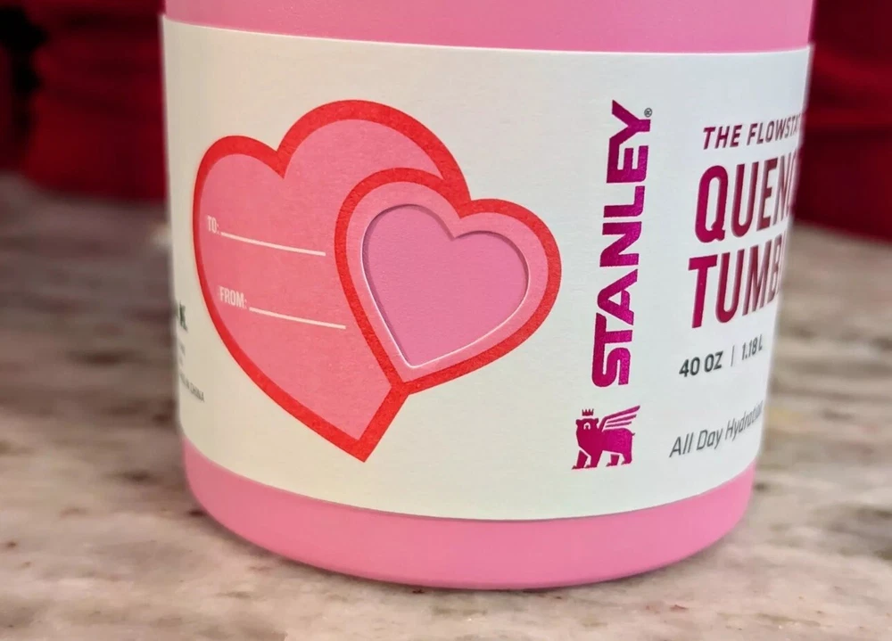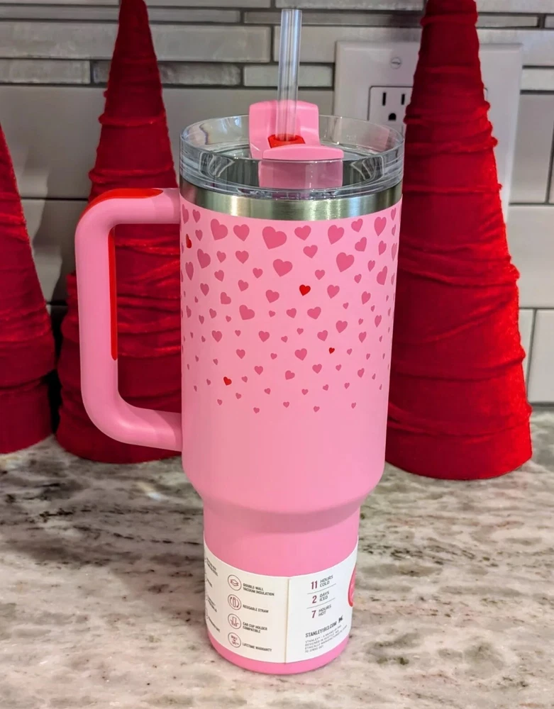 Get your hands on the limited edition Stanley Target Exclusive Valentine's Day 2025 Sweet Hearts 40oz Tumbler! This three-piece tumbler set comes with a drink through lid and straw, and is made of durable stainless steel and steel material. The tumbler is perfect for both hot and cold beverages, and can keep your drink hot for up to 4 hours and cold for up to 8 hours. With a capacity of 40 oz, it's great for kids, teens, adults, and unisex baby & toddler users. The tumbler is machine washable and comes with a lifetime manufacturer warranty. Don't miss out on this Valentine's Day themed tumbler, IN HAND and ready to ship!