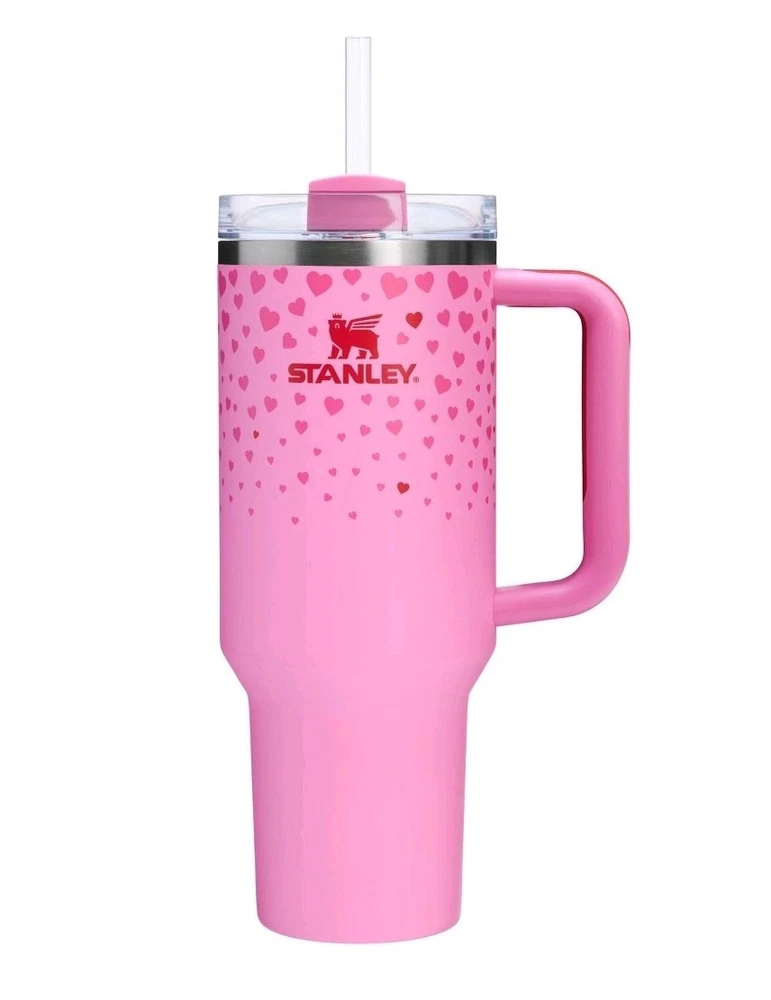 The Stanley Target Exclusive Valentine’s Day 2025 Sweet Hearts 40oz Tumbler is a branded tumbler featuring a Hearts pattern in Pink color. It is made of BPA-Free Plastic or Stainless Steel, suitable for both hot and cold beverages. This themed tumbler is decorated and insulated, with a handle for easy carrying. It is part of the Stanley Character Family and is a special edition release for Valentine's Day 2025.