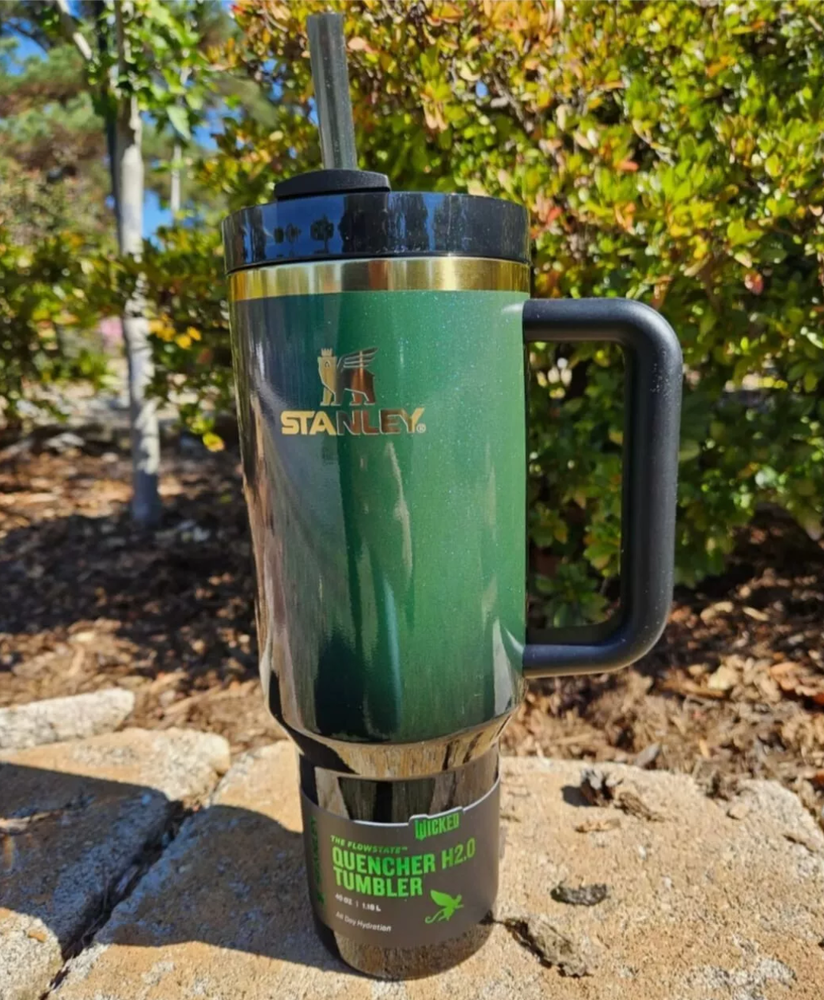 This Stanley X Wicked 40oz Tumbler in green features an exclusive Elphaba design from the Target X Wicked theme. Ideal for both hot and cold beverages, it includes a straw for easy sipping. Perfect for fans of the Wicked character family, this tumbler offers free priority shipping.