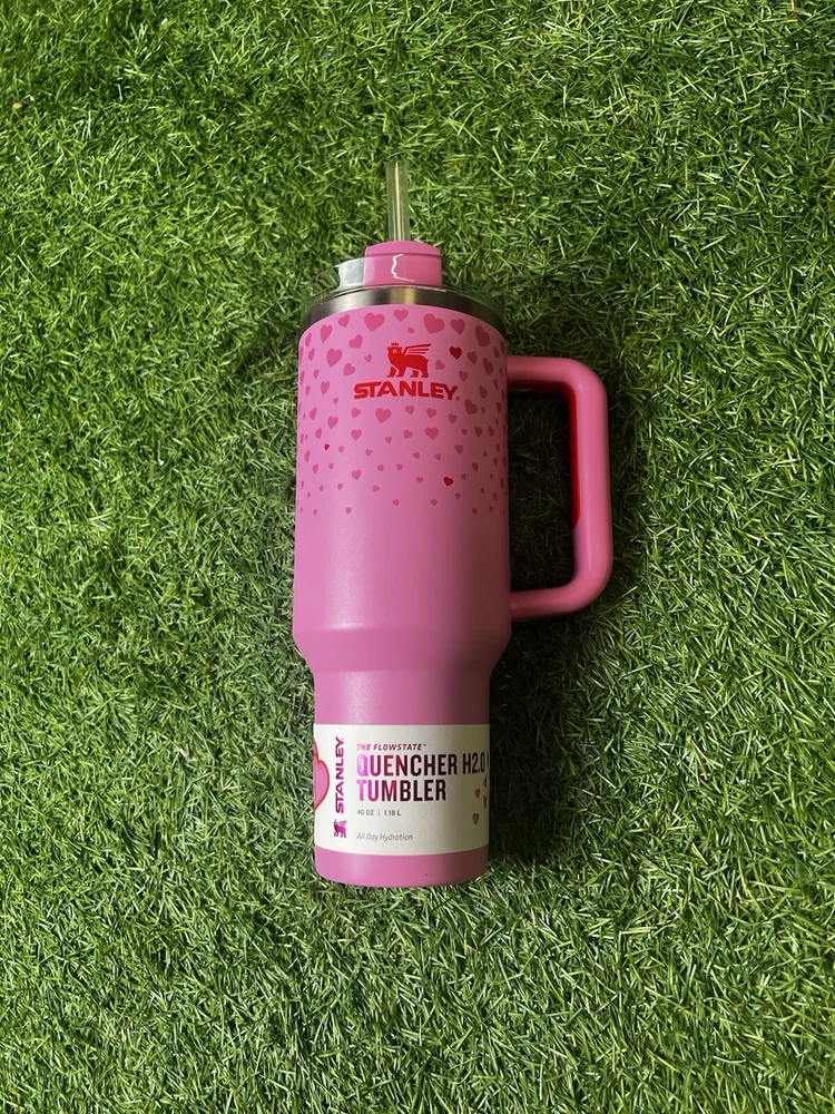 Brand: Stanley Shape: Heart Color: Pink Pattern: Hearts Occasion: Valentine's Day Type: Tumbler Set Includes: Straw Material: Stainless Steel Glassware Type: Tumbler Features: Handle, With Straw Theme: Love & Hearts