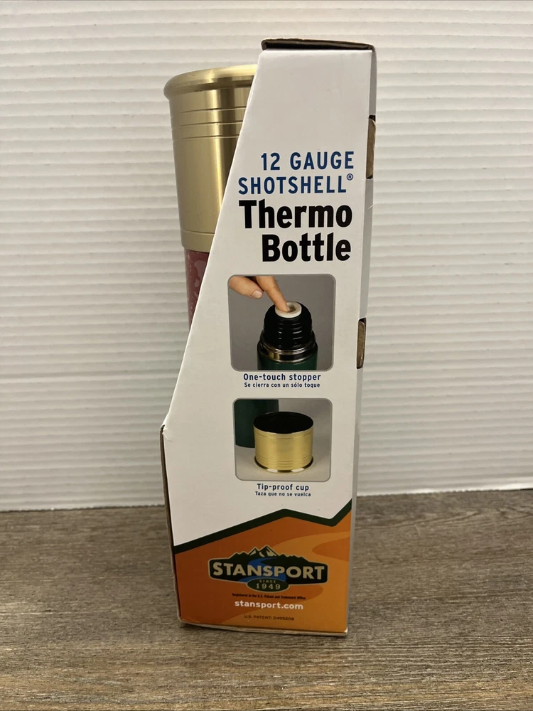 The Stansport 12 Gauge Shotgun Shell Red Thermo Bottle is a 25 oz stainless steel bottle with a screw-on lid. It features a double wall design and is suitable for hot beverages. The bottle is themed around activities like fishing, hunting, camping, and hiking, making it a practical and fun accessory for outdoor enthusiasts.