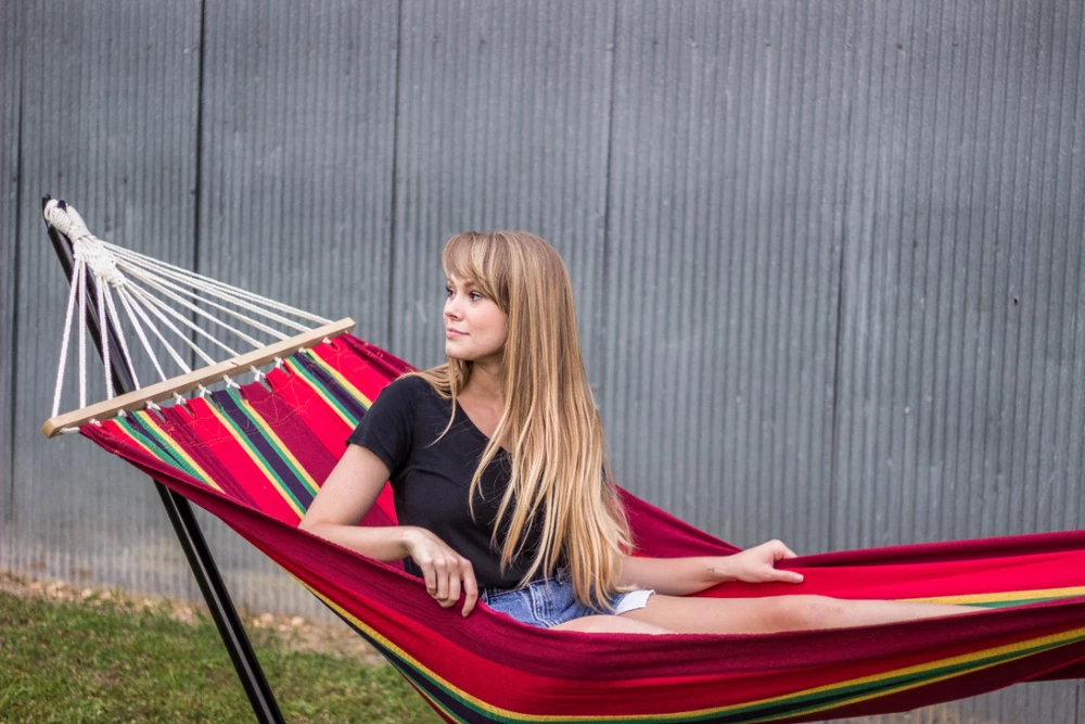 Product details Our Bahamas Cotton Blend Hammock is the perfect way to find yourself in comfort in your outdoor space. This cool cotton blend hammock cradles you for a relaxing experience. It measures in at 37” x 78” and generously supports up to 250 lbs. The hardwood spreader bars make sure the hammock lays flat at all times, and assures you will not be “cocooned”. The bright colors give it an authentic Caribbean flair! Grab a book and a blanket and swing the day away in our Bahamas Cotton Blend Hammock! Cool Cotton Blend Gracefully Cradles User For A Relaxing Experience Bright Caribbean Colors Hardwood Spreader Bars Dimensions: 78" x 37" Weight Limit: 250 lbs Can Be Used With Stansport Tree Straps (#31005-Not Included) And The Deluxe Hammock Stand (#31120-Not Included)