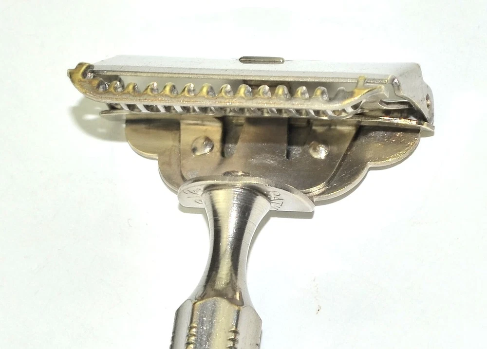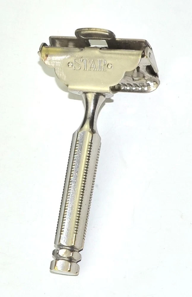 Offered is a sturdy, brass nickel plated Star brand 1912 Head single edge razor. This is probably the most popular head design of all the early single edge razors. It's been thoroughly cleaned and polished, plus sanitized, and is ready for use. It's in great mechanical condition. The cosmetic condition is fair with a moderate amount of plate wear/brassing around the head. Naturally this doesn't effect the shaving experience. Single edge blades for this razor are easily found online, or in the shaving sections of many local drug stores. All photos and listing text is copyrighted and not for public use. Prices are competitive but firm. E1