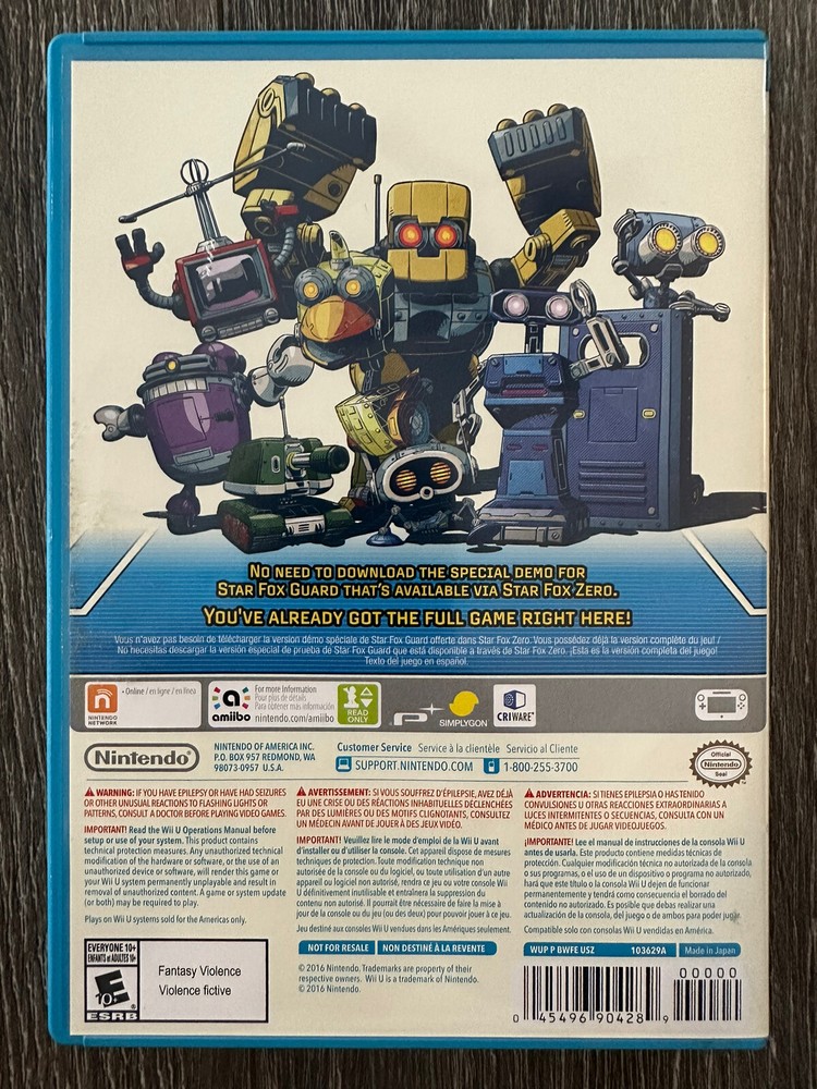 Platform:Nintendo Wii URegion Code:NTSC-U/C (US/Canada)Release Year:2016Rating:E10+ (Everyone 10+)gtin13:045496904289Publisher:NintendoGame Name:Star Fox GuardCountry of Origin:United StatesManufacturer Warranty:NoneFeatures:MultiplayerCustom Bundle:NoGenre:Fighting & ShootingMPN:WUPRAPKESub-Genre:Boxing, Car Racing, Extreme Sports, Martial Arts, Mixed SportsVideo Game Series:Star Fox Guard Nintendo Wii U GameUPC:045496904289