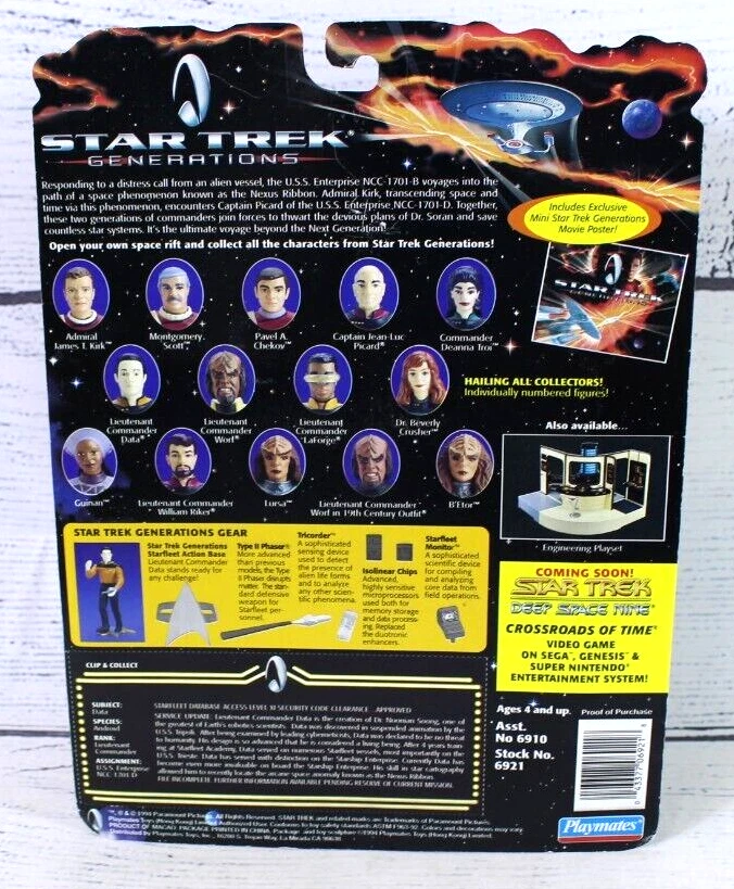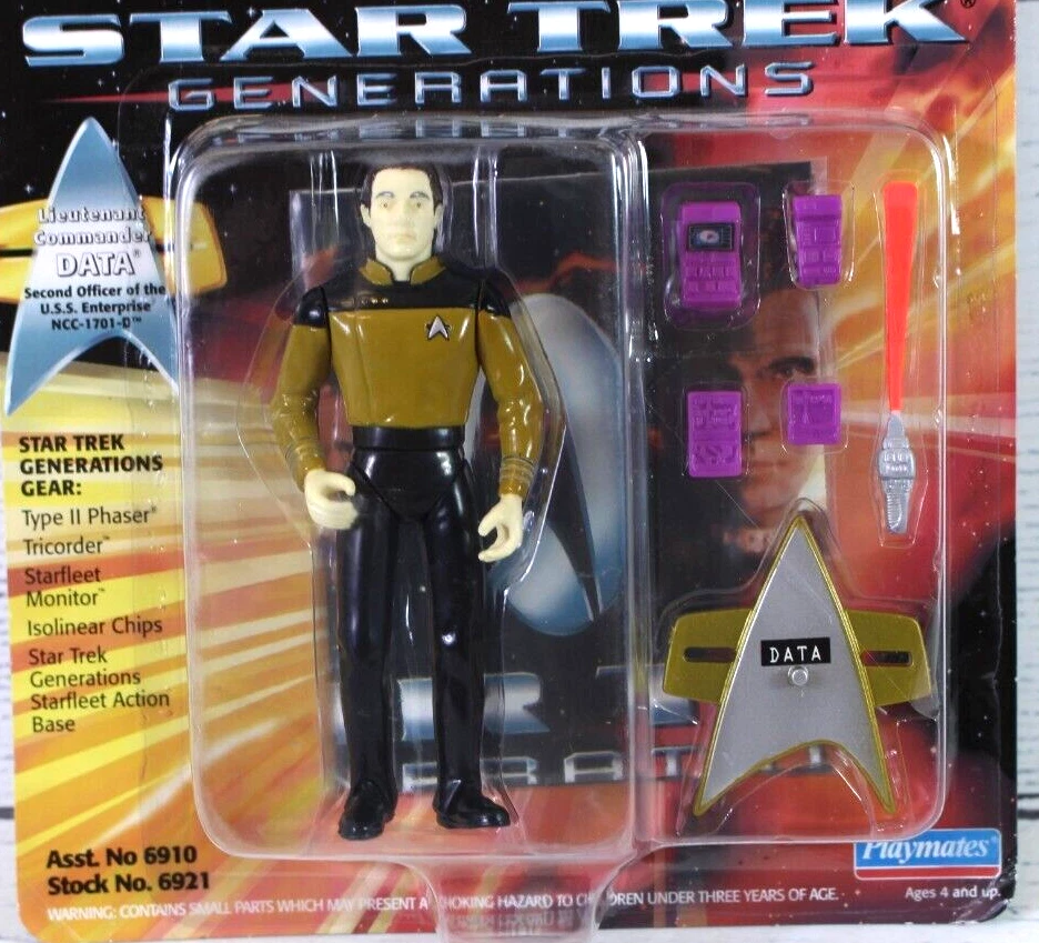 Modified Item: No Movie: Star Trek: Generations Color: Multicolor Recommended Age Range: 3+ Country of Manufacture: Hong Kong Character Family: Star Trek Character: Data Vintage: Yes TV Show: Star Trek: The Next Generation Year Manufactured: 1994 Original/Licensed Reproduction: Original Franchise: Star Trek gtin13: Does not apply Type: Action Figure Personalize: No Series: The Next Generation Material: Plastic Time Period Manufactured: 1990-1999 Packaging: sealed Year: 1994 Brand: Playmates Toys Signed: No UPC: Does not apply