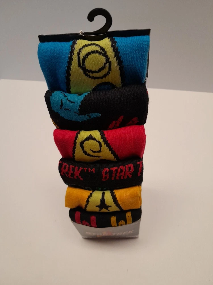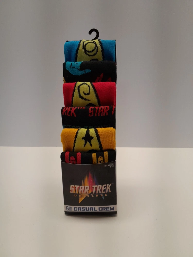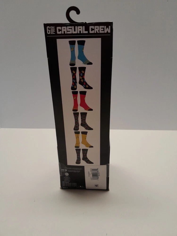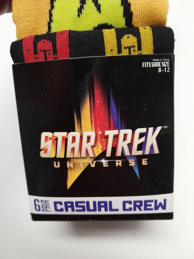 Features: All Seasons Brand: CBS Studios Color: Multicolor Material: Poly/Spandex Number in Pack: 6 Pairs Type: Socks Sock Length: Over the Calf Department: Men Style: Crew Socks Personalize: No Size Type: Regular Handmade: No Performance/Activity: Lounging, Walking Theme: Movie, Novelty, Space Occasion: Casual Country/Region of Manufacture: China Size: 8-12